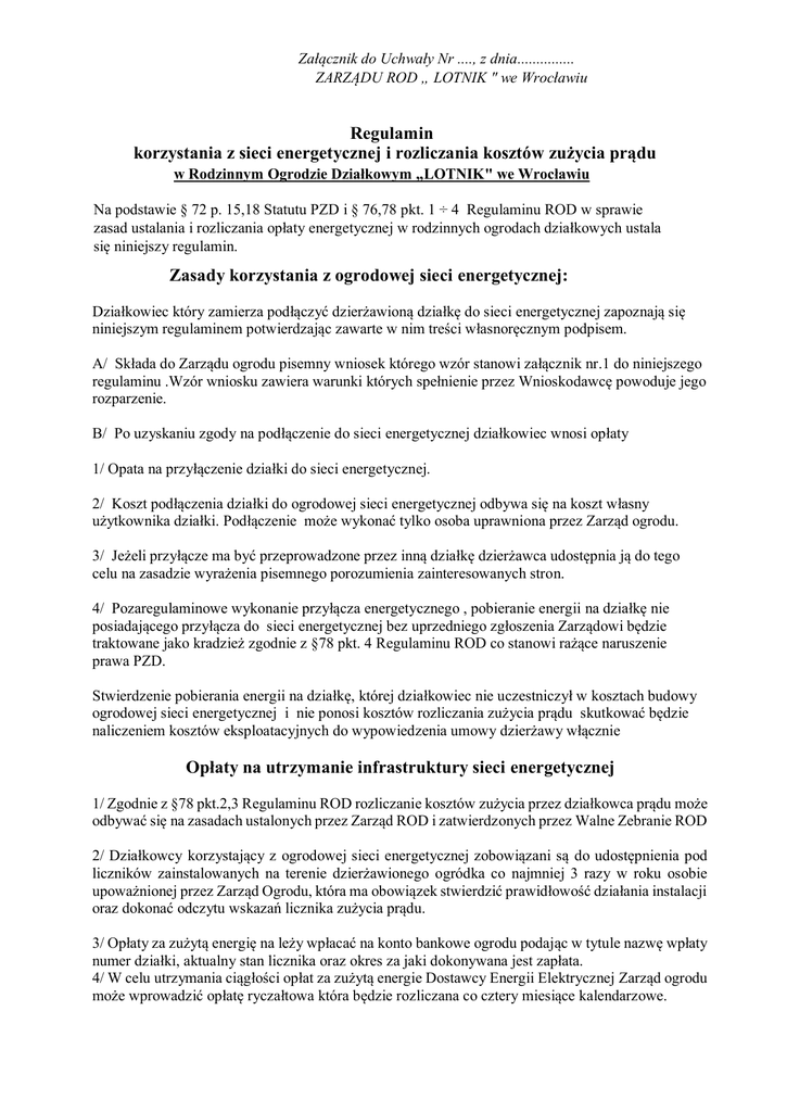 Załącznik do Uchwały Nr ...., z dnia............... ZARZĄDU ROD „ LOTNIK " we Wrocławiu Regulamin korzystania z sieci energetycznej i rozliczania kosztów zużycia prądu w Rodzinnym Ogrodzie Działkowym „LOTNIK" we Wrocławiu Na podstawie § 72 p. 15,18 Statutu PZD i § 76,78 pkt. 1 ÷ 4 Regulaminu ROD w sprawie zasad ustalania i rozliczania opłaty energetycznej w rodzinnych ogrodach działkowych ustala się niniejszy regulamin. Zasady korzystania z ogrodowej sieci energetycznej: Działkowiec który zamierza podłączyć dzierżawioną działkę do sieci energetycznej zapoznają się niniejszym regulaminem potwierdzając zawarte w nim treści własnoręcznym podpisem. A/ Składa do Zarządu ogrodu pisemny wniosek którego wzór stanowi załącznik nr.1 do niniejszego regulaminu .Wzór wniosku zawiera warunki których spełnienie przez Wnioskodawcę powoduje jego rozparzenie. B/ Po uzyskaniu zgody na podłączenie do sieci energetycznej działkowiec wnosi opłaty 1/ Opata na przyłączenie działki do sieci energetycznej. 2/ Koszt podłączenia działki do ogrodowej sieci energetycznej odbywa się na koszt własny użytkownika działki. Podłączenie może wykonać tylko osoba uprawniona przez Zarząd ogrodu. 3/ Jeżeli przyłącze ma być przeprowadzone przez inną działkę dzierżawca udostępnia ją do tego celu na zasadzie wyrażenia pisemnego porozumienia zainteresowanych stron. 4/ Pozaregulaminowe wykonanie przyłącza energetycznego , pobieranie energii na działkę nie posiadającego przyłącza do sieci energetycznej bez uprzedniego zgłoszenia Zarządowi będzie traktowane jako kradzież zgodnie z §78 pkt. 4 Regulaminu ROD co stanowi rażące naruszenie prawa PZD. Stwierdzenie pobierania energii na działkę, której działkowiec nie uczestniczył w kosztach budowy ogrodowej sieci energetycznej i nie ponosi kosztów rozliczania zużycia prądu skutkować będzie naliczeniem kosztów eksploatacyjnych do wypowiedzenia umowy dzierżawy włącznie Opłaty na utrzymanie infrastruktury sieci energetycznej 1/ Zgodnie z §78 pkt.2,3 Regulaminu ROD rozliczanie kosztów zużycia przez działkowca prądu może odbywać się na zasadach ustalonych przez Zarząd ROD i zatwierdzonych przez Walne Zebranie ROD 2/ Działkowcy korzystający z ogrodowej sieci energetycznej zobowiązani są do udostępnienia pod liczników zainstalowanych na terenie dzierżawionego ogródka co najmniej 3 razy w roku osobie upoważnionej przez Zarząd Ogrodu, która ma obowiązek stwierdzić prawidłowość działania instalacji oraz dokonać odczytu wskazań licznika zużycia prądu. 3/ Opłaty za zużytą energię na leży wpłacać na konto bankowe ogrodu podając w tytule nazwę wpłaty numer działki, aktualny stan licznika oraz okres za jaki dokonywana jest zapłata. 4/ W celu utrzymania ciągłości opłat za zużytą energie Dostawcy Energii Elektrycznej Zarząd ogrodu może wprowadzić opłatę ryczałtowa która będzie rozliczana co cztery miesiące kalendarzowe. Postanowienia końcowe 1/ Ogrodowa sieć energetyczna może być wyłączana w okresie od jesieni do wiosny za zgodą Walnego Zebrania. Zarząd ogrodu może dokonać wyłączenia prądu w razie nie sprzyjających warunków atmosferycznych lub zdarzeń, które mogą mieć wpływ na stan technicznych urządzeń energetycznych, zagrażać życiu i zdrowiu osobom przebywającym na terenie ogrodu. 2/ Informacje o terminach włączania i wyłączania sieci energetycznej Zarząd ROD będzie zamieszczał na tablicach informacyjnych i stronie internetowej ogrodu. 3/ Za stan techniczny instalacji energetycznej znajdującej się na działce oraz za jej zabezpieczenie przed osobami trzecimi odpowiada dzierżawca działki. 4/ W razie stwierdzenia wadliwego stanu technicznego lub złego zabezpieczenia instalacji w wyniku czego wadliwa instalacja może narazić bezpieczeństwo osób postronnych lub powodować straty materialne ogrodu, Zarząd może nałożyć dodatkowe opłaty lub odciąć przesył prądu do działki. Ponowne włączenie prądu do działki może nastąpić po usunięci wszystkich uchybień oraz pokryciu kosztów których wysokość ustala Zarząd ROD. Regulamin został sporządzony w dwóch egzemplarzach po jednym dla stron. Egz .nr 1 Dzierżawca działki nr ………….. Egz . nr2 Zarząd ROD – LOTNIK Zarząd ROD – LOTNIK Dzierżawca Działki