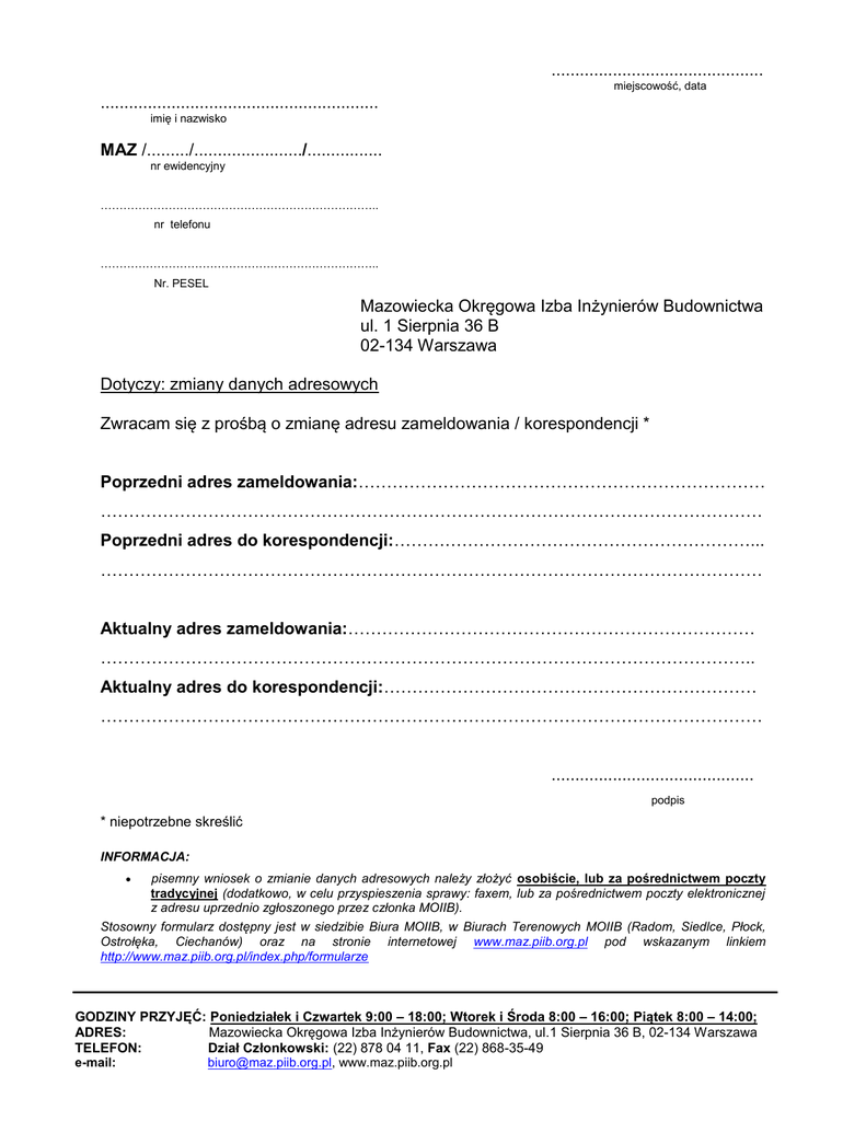 ............................................. miejscowość, data ........................................................... imię i nazwisko MAZ /........./......................./................ nr ewidencyjny ……………………………………………………………….. nr telefonu ……………………………………………………………….. Nr. PESEL Mazowiecka Okręgowa Izba Inżynierów Budownictwa ul. 1 Sierpnia 36 B 02-134 Warszawa Dotyczy: zmiany danych adresowych Zwracam się z prośbą o zmianę adresu zameldowania / korespondencji * Poprzedni adres zameldowania:……………………………………………………………… ……………………………………………………………………………………………………… Poprzedni adres do korespondencji:………………………………………………………... ……………………………………………………………………………………………………… Aktualny adres zameldowania:……………………………………………………………… …………………………………………………………………………………………………….. Aktualny adres do korespondencji:………………………………………………………… ……………………………………………………………………………………………………… ........................................... podpis * niepotrzebne skreślić INFORMACJA: pisemny wniosek o zmianie danych adresowych należy złożyć osobiście, lub za pośrednictwem poczty tradycyjnej (dodatkowo, w celu przyspieszenia sprawy: faxem, lub za pośrednictwem poczty elektronicznej z adresu uprzednio zgłoszonego przez członka MOIIB). Stosowny formularz dostępny jest w siedzibie Biura MOIIB, w Biurach Terenowych MOIIB (Radom, Siedlce, Płock, Ostrołęka, Ciechanów) oraz na stronie internetowej www.maz.piib.org.pl pod wskazanym linkiem http://www.maz.piib.org.pl/index.php/formularze GODZINY PRZYJĘĆ: Poniedziałek i Czwartek 9:00 – 18:00; Wtorek i Środa 8:00 – 16:00; Piątek 8:00 – 14:00; ADRES: Mazowiecka Okręgowa Izba Inżynierów Budownictwa, ul.1 Sierpnia 36 B, 02-134 Warszawa TELEFON: Dział Członkowski: (22) 878 04 11, Fax (22) 868-35-49 e-mail: [email protected], www.maz.piib.org.pl
