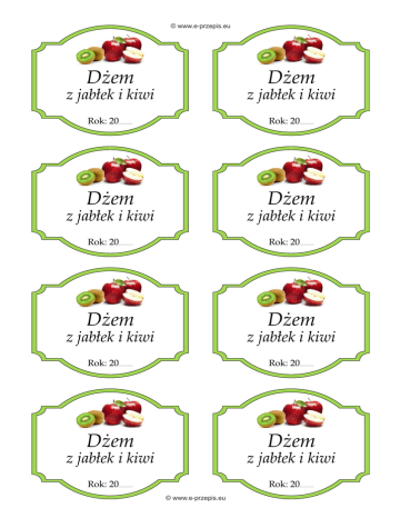 © www.e-przepis.eu Dżem Dżem z jabłek i kiwi z jabłek i kiwi Rok: 20.............. Rok: 20.............. Dżem Dżem z jabłek i kiwi z jabłek i kiwi Rok: 20.............. Rok: 20.............. Dżem Dżem z jabłek i kiwi z jabłek i kiwi Rok: 20.............. Rok: 20.............. Dżem Dżem z jabłek i kiwi z jabłek i kiwi Rok: 20.............. Rok: 20.............. © www.e-przepis.eu