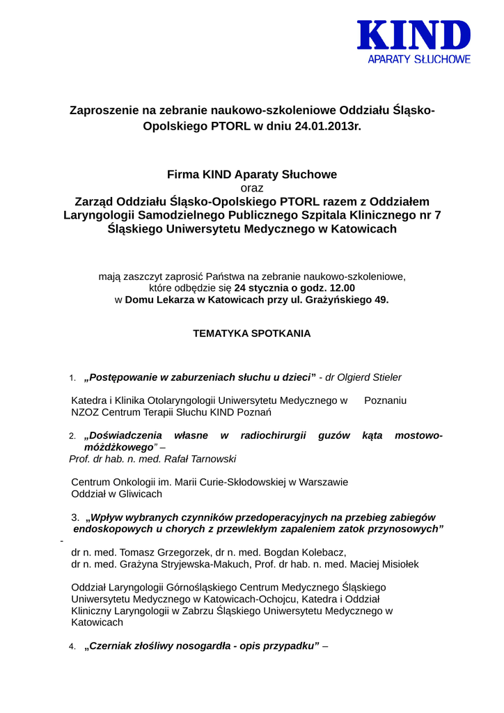Zaproszenie na zebranie naukowo-szkoleniowe Oddziału ŚląskoOpolskiego PTORL w dniu 24.01.2013r. Firma KIND Aparaty Słuchowe oraz Zarząd Oddziału Śląsko-Opolskiego PTORL razem z Oddziałem Laryngologii Samodzielnego Publicznego Szpitala Klinicznego nr 7 Śląskiego Uniwersytetu Medycznego w Katowicach mają zaszczyt zaprosić Państwa na zebranie naukowo-szkoleniowe, które odbędzie się 24 stycznia o godz. 12.00 w Domu Lekarza w Katowicach przy ul. Grażyńskiego 49. TEMATYKA SPOTKANIA 1. „Postępowanie w zaburzeniach słuchu u dzieci” - dr Olgierd Stieler Katedra i Klinika Otolaryngologii Uniwersytetu Medycznego w NZOZ Centrum Terapii Słuchu KIND Poznań Poznaniu „Doświadczenia własne w radiochirurgii móżdżkowego” – Prof. dr hab. n. med. Rafał Tarnowski kąta 2. guzów mostowo- Centrum Onkologii im. Marii Curie-Skłodowskiej w Warszawie Oddział w Gliwicach 3. „Wpływ wybranych czynników przedoperacyjnych na przebieg zabiegów endoskopowych u chorych z przewlekłym zapaleniem zatok przynosowych” dr n. med. Tomasz Grzegorzek, dr n. med. Bogdan Kolebacz, dr n. med. Grażyna Stryjewska-Makuch, Prof. dr hab. n. med. Maciej Misiołek Oddział Laryngologii Górnośląskiego Centrum Medycznego Śląskiego Uniwersytetu Medycznego w Katowicach-Ochojcu, Katedra i Oddział Kliniczny Laryngologii w Zabrzu Śląskiego Uniwersytetu Medycznego w Katowicach 4. „Czerniak złośliwy nosogardła - opis przypadku” – dr n. med. Bogdan Kolebacz, dr n. med. Grażyna Stryjewska-Makuch, dr n. med. Tomasz Grzegorzek, lek. med. Agnieszka Litewka Oddział Laryngologii Górnośląskiego Centrum Medycznego Śląskiego Uniwersytetu Medycznego w Katowicach-Ochojcu. Po wykładach zapraszamy wszystkich serdecznie na poczęstunek.