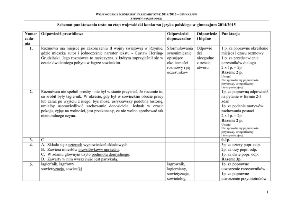 WOJEWÓDZKIE KONKURSY PRZEDMIOTOWE 2014/2015 – GIMNAZJUM STOPIEŃ WOJEWÓDZKI Schemat punktowania testu na etap wojewódzki konkursu języka polskiego w gimnazjum 2014/2015 Numer Odpowiedź prawidłowa zadania Rozmowa ma miejsce po zakończeniu II wojny światowej w Rzymie, 1. gdzie mieszka autor i jednocześnie narrator tekstu - Gustaw HerlingGrudziński. Jego rozmówca to mężczyzna, z którym zaprzyjaźnił się w czasie dwuletniego pobytu w łagrze sowieckim. Odpowiedzi dopuszczalne Odpowiedz i błędne Punktacja Sformułowania synonimicznie opisujące okoliczności rozmowy i jej uczestników Odpowie dzi niezgodne z treścią utworu 1 p. za poprawne określenie miejsca i czasu rozmowy 1 p. za przedstawienie uczestników dialogu 2 x 1p. = 2p Razem: 2 p. Uwaga! Nie sprawdzamy poprawności językowej, ortograficznej i interpunkcyjnej. 2. Rozmówca nie spełnił prośby - nie był w stanie przyznać, że rozumie to, co zrobił były łagiernik. W okresie, gdy był w sowieckim obozie pracy lub zaraz po wyjściu z niego, być może, usłyszawszy podobną historię, umiałby usprawiedliwić zachowanie donosiciela. Jednak w czasie pokoju, żyjąc na wolności, jest przekonany, że nie wolno aprobować tak niemoralnego czynu. 1p. za poprawną odpowiedź na pytanie w formie 2-3 zdań 1p. za podanie motywów zachowania postaci 2 x 1p. = 2p Razem: 2 p. Uwaga! Nie sprawdzamy poprawności językowej, ortograficznej i interpunkcyjnej. 3. 4. 5. C A. Składa się z czterech wypowiedzeń składowych. B. Zawiera imiesłów przysłówkowy uprzedni. C. W zdaniu głównym użyto podmiotu domyślnego. D. Zawarty w nim wyraz tylko jest partykułą. łagier/nik, łagr/owy sowiet/yzacja, sowiec/ki łagrownik, łagierniany, sowietyzacja, sowietolog, 0-1p. 3p. za cztery popr. odp. 2p. za trzy popr. odp. 1p. za dwie popr. odp. Razem: 3p. 1p. za poprawne utworzenie rzeczowników 1p. za poprawne utworzenie przymiotników 1 WOJEWÓDZKIE KONKURSY PRZEDMIOTOWE 2014/2015 – GIMNAZJUM STOPIEŃ WOJEWÓDZKI 6. 7. B Np. Qvo vadis: - Plaucjusze starają się odebrać zabraną przez Petroniusza Lidię. Obawiają się o jej bezpieczeństwo. Nie mogą pogodzić się z tym, że dziewczyna wbrew woli może zostać pozbawiona czci. - Ursus odbija Ligię z rąk Nerona, by nie dopuścić, by stała się zabawką w rękach jego żołnierza - Marka Winicjusza. - Petroniusz próbuje pomóc Markowi Winicjuszowi w odzyskaniu Ligii. Mimo że zdaje sobie sprawę, iż stracił względy u Nerona, nie ustaje w wysiłkach, by użyć swych wpływów na dworze cesarza. Naraża się przez to na niebezpieczeństwo. Syzyfowe prace: - Marcin Borowicz wstawia się u dyrektora szkoły za Andrzejem Radkiem, który na lekcji matematyki pobił drwiącego z jego chłopskiego pochodzenia ucznia. Mimo że chłopcy nie znali się bezpośrednio, to w Marcinie zwyciężył odruch solidarności z wiejskim chłopakiem niemogącym liczyć na niczyją pomoc. - Bernard Zygier pomimo nadzoru ze strony inspektora Zabielskiego uczestniczy w spotkaniach na górce u Gontali. Wspiera kolegów, M. Borowicza, A. Radka, Pieprzojada, w budowaniu świadomości patriotycznej. Oskar i Pani Róża: - Ciocia Róża namawia nieuleczalnie chorego Oskara do pisania listów do Boga. Zachęca do tego, by wierzył, że każdy dzień to dziesięć lat życia. W ciągu ostatnich dwunastu dni swojego życia chłopiec pisze więc listy. Niewiele wie o Bogu i do końca nie wierzy w jego istnienie, pisze więc z pewnym powątpieniem. Jednak z każdym kolejnym listem wiara Oskara staje się silniejsza i pomaga mu uporać się z problemami związanymi z chorobą, jego lekarzem i rodzicami. sowietologia, sowietyzm, sowietka, sowieckość D 1p. za wskazanie wszystkich formantów Razem: 3p. 0 - 1 p. Po 1 p. za przedstawienie adekwatnych przykładów w formie przynajmniej dwóch zdań każdy. Razem: 3p. Uwaga! Nie sprawdzamy poprawności językowej, ortograficznej i interpunkcyjnej. 2 WOJEWÓDZKIE KONKURSY PRZEDMIOTOWE 2014/2015 – GIMNAZJUM STOPIEŃ WOJEWÓDZKI 8. 9. 10. 11. B, C, D D Np. - Oskar i Pani Róża to książka o życiu i śmierci, ponieważ jej główny bohater jest chory na białaczkę. Lekarze są bezradni wobec jego choroby i 10-letni chłopiec ma kilkanaście dni na przygotowanie się do odejścia. Wolontariuszka, ciocia Róża, podsuwa mu pomysł, by poszczególne dni traktował jako dziesiątki lat i w pełni przeżył dany mu czas. - Książka Erica-Emmanuela Schmitta jest utworem o pięknie i brzydocie, gdyż ukazuje obiektywny obraz nieuleczalnie chorych dzieci. Z jednej strony to osoby oszpecone przez chorobę, a z drugiej potrafiące pięknie przeżywać swoje krótkie życie. Np. - Oskar : Oskar wie, że należy pogodzić się z chorobą, godnie ją przyjąć, i dzięki tej wiedzy potrafi być przyjacielem i człowiekiem odpowiedzialnym. Oskar dzięki pani Róży odchodzi z przekonaniem, że nigdy, nawet w obliczu nieuleczalnej choroby, na życie nie jest za późno. Śmierć to część naszego życia. - Pani Róża: Spędza z chłopcem dużo czasu, rozmawia z nim szczerze i odpowiada na wszystkie jego pytania. Uświadamia mu, że chorobę trzeba przyjąć i pogodzić się z losem. Rozmawia z nim o świecie i życiu, pomaga mu w uporaniu się z codziennością. To właśnie ona namawia go do pisania listów do Boga, zachęca też chłopca do tego, by wierzył, że każdy dzień to dziesięć lat życia. - Rodzice Oskara:. Nie są w stanie zdobyć się na szczerą rozmowę z Oskarem, gdyż nie potrafią zaakceptować choroby syna – wobec nieszczęścia są bezradni i zagubieni. Zwodzą go i okłamują, co dodatkowo przysparza chłopcu cierpienia. Nie poświęcają mu zbyt wiele czasu, a Oskarowi wydaje się, że ich zawiódł. 0-1p. 0-1p. Po 1 p. za uzasadnienie wybranych odpowiedzi z zad. 8. Razem: 2p. Uwaga! Nie sprawdzamy poprawności językowej, ortograficznej i interpunkcyjnej. Po 1 p. za przedstawienie postaw poszczególnych bohaterów. Razem: 3p. 3 WOJEWÓ