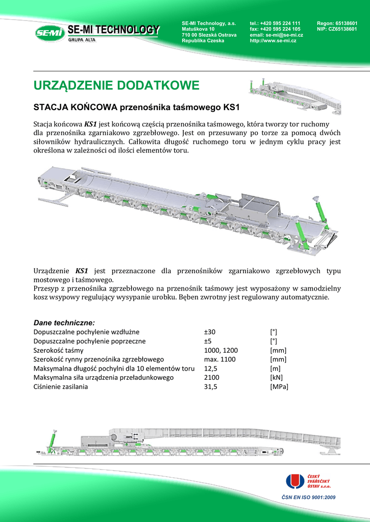 SE-MI Technology, a.s. Matuškova 10 710 00 Slezská Ostrava Republika Czeska tel.: +420 595 224 111 fax: +420 595 224 105 email: [email protected] http://www.se-mi.cz Regon: 65138601 NIP: CZ65138601 URZĄDZENIE DODATKOWE STACJA KOŃCOWA przenośnika taśmowego KS1 Stacja końcowa KS1 jest końcową częścią przenośnika taśmowego, która tworzy tor ruchomy dla przenośnika zgarniakowo zgrzebłowego. Jest on przesuwany po torze za pomocą dwóch siłowników hydraulicznych. Całkowita długość ruchomego toru w jednym cyklu pracy jest określona w zależności od ilości elementów toru. Urządzenie KS1 jest przeznaczone dla przenośników zgarniakowo zgrzebłowych typu mostowego i taśmowego. Przesyp z przenośnika zgrzebłowego na przenośnik taśmowy jest wyposażony w samodzielny kosz wsypowy regulujący wysypanie urobku. Bęben zwrotny jest regulowany automatycznie. Dane techniczne: Dopuszczalne pochylenie wzdłużne Dopuszczalne pochylenie poprzeczne Szerokość taśmy Szerokość rynny przenośnika zgrzebłowego Maksymalna długość pochylni dla 10 elementów toru Maksymalna siła urządzenia przeładunkowego Ciśnienie zasilania ±30 ±5 1000, 1200 max. 1100 12,5 2100 31,5 [°] [°] [mm] [mm] [m] [kN] [MPa] ČSN EN ISO 9001:2009