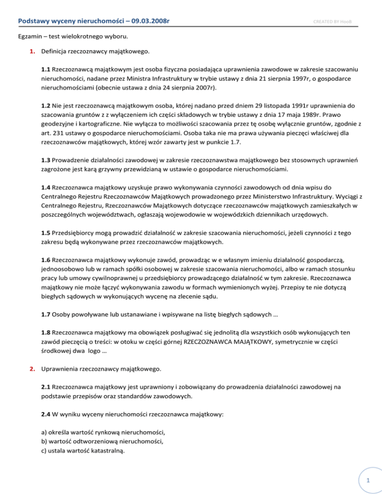 Podstawy wyceny nieruchomości – 09.03.2008r CREATED BY HooB Egzamin – test wielokrotnego wyboru. 1. Definicja rzeczoznawcy majątkowego. 1.1 Rzeczoznawcą majątkowym jest osoba fizyczna posiadająca uprawnienia zawodowe w zakresie szacowaniu nieruchomości, nadane przez Ministra Infrastruktury w trybie ustawy z dnia 21 sierpnia 1997r, o gospodarce nieruchomościami (obecnie ustawa z dnia 24 sierpnia 2007r). 1.2 Nie jest rzeczoznawcą majątkowym osoba, której nadano przed dniem 29 listopada 1991r uprawnienia do szacowania gruntów z z wyłączeniem ich części składowych w trybie ustawy z dnia 17 maja 1989r. Prawo geodezyjne i kartograficzne. Nie wyłącza to możliwości szacowania przez tę osobę wyłącznie gruntów, zgodnie z art. 231 ustawy o gospodarce nieruchomościami. Osoba taka nie ma prawa używania pieczęci właściwej dla rzeczoznawców majątkowych, której wzór zawarty jest w punkcie 1.7. 1.3 Prowadzenie działalności zawodowej w zakresie rzeczoznawstwa majątkowego bez stosownych uprawnień zagrożone jest karą grzywny przewidzianą w ustawie o gospodarce nieruchomościami. 1.4 Rzeczoznawca majątkowy uzyskuje prawo wykonywania czynności zawodowych od dnia wpisu do Centralnego Rejestru Rzeczoznawców Majątkowych prowadzonego przez Ministerstwo Infrastruktury. Wyciągi z Centralnego Rejestru, Rzeczoznawców Majątkowych dotyczące rzeczoznawców majątkowych zamieszkałych w poszczególnych województwach, ogłaszają wojewodowie w wojewódzkich dziennikach urzędowych. 1.5 Przedsiębiorcy mogą prowadzić działalność w zakresie szacowania nieruchomości, jeżeli czynności z tego zakresu będą wykonywane przez rzeczoznawców majątkowych. 1.6 Rzeczoznawca majątkowy wykonuje zawód, prowadząc w e własnym imieniu działalność gospodarczą, jednoosobowo lub w ramach spółki osobowej w zakresie szacowania nieruchomości, albo w ramach stosunku pracy lub umowy cywilnoprawnej u przedsiębiorcy prowadzącego działalność w tym zakresie. Rzeczoznawca majątkowy nie może łączyć wykonywania zawodu w formach wymienionych wyżej. Przepisy te nie dotyczą biegłych sądowych w wykonujących wycenę na zlecenie sądu. 1.7 Osoby powoływane lub ustanawiane i wpisywane na listę biegłych sądowych … 1.8 Rzeczoznawca majątkowy ma obowiązek posługiwać się jednolitą dla wszystkich osób wykonujących ten zawód pieczęcią o treści: w otoku w części górnej RZECZOZNAWCA MAJĄTKOWY, symetrycznie w części środkowej dwa logo … 2. Uprawnienia rzeczoznawcy majątkowego. 2.1 Rzeczoznawca majątkowy jest uprawniony i zobowiązany do prowadzenia działalności zawodowej na podstawie przepisów oraz standardów zawodowych. 2.4 W wyniku wyceny nieruchomości rzeczoznawca majątkowy: a) określa wartość rynkową nieruchomości, b) wartość odtworzeniową nieruchomości, c) ustala wartość katastralną. 1 2.5 Rzeczoznawca majątkowy jest uprawniony do określenia wartości nieruchomości w zakresie wynijącym nie tylko z przepisów ustawy o gospodarce nieruchomościami, lecz także z innych przepisów, o ile wynika z nich potrzeba określenia wartości nieruchomości. 2.6 Wybór właściwego podejścia, oraz metody i techniki wyceny, z uwzględnieniem zasad wynikających z art. 154 ustawy o gospodarce nieruchomościami, należy wyłącznie do rzeczoznawcy majątkowego, chyba, że wynika on z wyraźnego przepisu prawa. Rzeczoznawca nie jest związany w tym zakresie żądaniem zamawiającego wycenę. 2.7 Rzeczoznawca majątkowy może żądać od właściwych organów i sądów udostępnienia mu danych jakie zostały wymienione w art. 155 ustawy o gospodarce nieruchomościami, niezbędnych do prawidłowego wykonywania jego zawodu. 2.8 Rzeczoznawca majątkowy ma prawdo do sporządzania wypisów i wyrysów z danych i dokumentów, o których mowa w punkcie 2.7, a także poświadczania tych wypisów, lub wyrysów, dla potrzeb wyceny. 2.9 Właściwe organy, agencje, spółdzielnie mieszkaniowe, sądy oraz urzędy skarbowe są zobowiązane udostępniać rzeczoznawcom majątkowym niezbędne dane. 2.10 Rzeczoznawca majątkowy posiadający niezbędną wiedzę i kwalifikacje wymagane odrębnymi przepisami może sporządzać nie stanowiące operatu szacunkowego opinie i ekspertyzy dotyczące: a) rynek nieruchomości oraz doradztwo w zakresie tego rynku, b) efektywności inwestowania w nieruchomości i ich rozwoju, c) skutków finansowych uchwalania lub zmiany planów miejscowych, d) oznaczenia przedmiotu odrębnej własności lokali, e) bankowo – hipotecznej wartości nieruchomości, f) określanie wartości nieruchomości na potrzeby indywidualnego inwestora, g) wycena nieruchomości zaliczanej do inwestycji w rozumieniu przepisów o rachunkowości, h) wycena nieruchomości jako środków trwałych jednostek w rozumieniu ustawy o rachunkowości. 2.11 Z dniem wpisu do centralnego rejestru rzeczoznawców majątkowych osoba, o której mowa w ust. 2, nabywa prawo do wykonywania zawodu oraz używania tytułu zawodowego „rzeczoznawcy majątkowego”. Tytuł zawdowy „rzeczoznawca majątkowy” podlega ochronie prawnej. 3. Obowiązki rzeczoznawcy majątkowego 3.1 Rzeczoznawca majątkowy jest zobowiązany do wykonywania czynności związanych z określaniem wartości nieruchomości: a) zgodnie z przepisami prawa i standardami zawodowymi, b) z zachowaniem reguł, określonych w Kodeksie Etyki Zawodowej, c) przy zachowaniu szczególnej staranności właściwej ze względu na zawodowy charakter jego czynności, d) w sposób obiektywny i niezależny. 3.2 Rzeczoznawca majątkowy powinien odmówić wykonania wyceny lub czynności o których mowa w punkcie 2.10 w warunkach zagrażających jego obiektywizmowi, w szczególności wówczas, gdy okoliczności wskazywałyby na konflikt interesów pomiędzy nim a zamawiającym wycenę, lub też jeżeli ze strony zamawiającego lub osób trzecich wywierane byłyby na rzeczoznawcę niedozwolone naciski. 2 3.3. Szczególna staranno