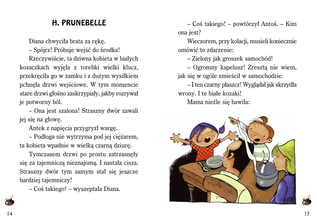 H. PRUNEBELLE – Coś takiego! – powtórzył Antoś. – Kim ona jest? Diana chwyciła brata za rękę. – Spójrz! Próbuje wejść do środka! Rzeczywiście, ta dziwna kobieta w białych kozaczkach wyjęła z torebki wielki klucz, przekręciła go w zamku i z dużym wysiłkiem pchnęła drzwi wejściowe. W tym momencie stare drzwi głośno zaskrzypiały, jakby rozrywał je potworny ból. Wieczorem, przy kolacji, musieli koniecznie omówić to zdarzenie: – Zielony jak groszek samochód! – Ogromny kapelusz! Zresztą nie wiem, jak się w ogóle zmieścił w samochodzie. – I ten czarny płaszcz! Wyglądał jak skrzydła wrony. I te białe kozaki! Mama nieźle się bawiła: – Ona jest szalona! Straszny dwór zawali jej się na głowę. Antek z napięcia przygryzł wargę. – Podłoga nie wytrzyma pod jej ciężarem, ta kobieta wpadnie w wielką czarną dziurę. Tymczasem drzwi po prostu zatrzasnęły się za tajemniczą nieznajomą. I nastała cisza. Straszny dwór tym samym stał się jeszcze bardziej tajemniczy! – Coś takiego! – wyszeptała Diana. 14 15 – Widać, że nasza sąsiadka podnosi wam temperaturę! Diana i Antoś spojrzeli na siebie zdziwieni. – No coś ty! Przecież czarownice istnieją tylko w bajkach! – zaśmiała się głośno mama. Diana i Antek nie mieli już ochoty na – Nasza sąsiadka? spaghetti, które przecież tak uwielbiali. A co – Ależ tak, przyczepiła nową tabliczkę do kota… To prawda, nie widać go od kilku na skrzynce pocztowej: Holly Prunebelle. Antoś i Diana z wrażenia zupełnie zapo- godzin. Czarownica! Naszą sąsiadką jest czarownica! mnieli dodać swój ulubiony ser do spaghetti. – Holly przez H? To ona jest właścicielką strasznego dworu? – Z pewnością, w przeciwnym razie nie gotowałaby w kuchni. Przed chwilą, parkując samochód, słyszałam, jak z jej kuchni wydobywa się odgłos wrzenia i skwierczenia. Tak jakby coś gotowało się w kociołku. Nie wspominając już o przedziwnych zapachach, jakie unoszą się wokół strasznego dworu od momentu, kiedy się zjawiła. – Być może gotuje dla kota? – uśmiechnął się tata. – Albo jest czarownicą i chce ugotować swojego kota? Kto wie? 16 17