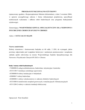 PROGRAM FUNKCJONALNO-UŻYTKOWY (opracowany zgodnie z Rozporządzeniem Ministra Infrastruktury z dnia 2 września 2004r. w sprawie szczegółowego zakresu i formy dokumentacji projektowej, specyfikacji technicznych wykonania i odbioru robót budowlanych oraz programu funkcjonalno użytkowego) Zamawiający: WOJEWÓDZKI SZPITAL SPECJALISTYCZNY DLA NERWOWO I PSYCHICZNIE CHORYCH SP ZOZ W CIBORZU Adres:: CIBÓRZ 66-213 SKĄPE Nazwa zamówienia: Roboty remontowe i dostosowanie budynku nr 60 oddz. 2 ZOL do wymagań, jakim powinny odpowiadać pod względem fachowym i sanitarnym pomieszczenia i urządzenia zakładu opieki zdrowotnej na terenie Wojewódzkiego Szpitala Specjalistycznego dla Nerwowo i Psychicznie Chorych SP ZOZ w Ciborzu Kody i nazwy robót budowlanych -71000000-8-usługi architektoniczne, budowlane, inżynieryjne i kontrolne -45331100-7-instalacje centralnego ogrzewania -45300000-0-roboty instalacyjne w budynkach -4500000-7-roboty budowlane -45400000-1-roboty wykończeniowe w zakresie obiektów budowlanych -45331000-6-instalowanie urządzeń grzewczych, wentylacyjnych i klimatyzacyjnych -45311200-2-roboty w zakresie instalacji elektrycznej Opracował: ·Piotr Seraficki 1 SPIS TREŚCI Strona tytułowa……………………………………………………………….…… 1 Spis treści…………………………………………………………………..……… 2 2.Definicje podstawowe…………………………………………………………... 3 3.Część opisowa planowanej inwestycji…………………………………………... 3 3.1.Ogólny przedmiot zamówienia………………………………………………....3 3.1.1.Opis istniejącego stanu……………………………………………………..3-4 3.1.2.Opis przedmiotu zamówienia…………………………………………………4 3.1.3.Zakres robót budowlanych ………………………………...........................4-14 4. Przepisy prawne ……………………………………………………………….14 5.Terminy…………………………………………………………………….… 14 2 2. DEFINICJE Stwor – Specyfikacja Techniczna Wykonania i Odbioru Robót – zbiór wymagań technicznych związanych z realizacją inwestycji, kontrolą, odbiorem robót. 3.CZĘŚĆ OPISOWA PLANOWANEJ INWESTYCJI. 3.1.OGÓLNY OPIS PRZEDMIOTU ZAMÓWIENIA. Wykonanie remontu pomieszczeń w bud. Nr 60 oddz. 2 ZOL położonego na terenie Wojewódzkiego Szpitala Psychiatrycznego dla Nerwowo i Psychicznie Chorych SP ZOZ w Ciborzu. 3.1.1. OPIS STANU ISTNIEJĄCEGO Remontowany budynek nr 60 znajduje się na terenie Wojewódzkiego Szpitala dla Nerwowo i Psychicznie Chorych SP ZOZ w Ciborzu. Teren, na którym znajduje się budynek jest zalesiony, o dużym zróżnicowaniu nawierzchni. Teren jest uzbrojony w sieć wodną, kanalizacyjną, telefoniczną, centralnego ogrzewania i gazową. Budynki o dwóch kondygnacjach naziemnych z poddaszem użytkowym z podpiwniczeniem pełnym, zbudowane typowo dla budownictwa przedwojennego niemieckiego. Budynek posiada konstrukcję murową z cegły pełnej. Budynek o rzucie prostokątnym o zewnętrznych ścianach nośnych posiada wewnątrz dwie ściany konstrukcyjne biegnące wzdłuż budynku tworząc wewnętrzny korytarz. Przekrycie piwnic wykonano w postaci sklepień ceglanych na zaprawie cementowej.Stropy między parterem, piętrem i poddaszem wykonano drewniane ze ślepym pułapem i piaskową polepą. Więźba dachowa drewniana płatwiowo – kleszczowa dwuspadowa ze słupkami – stojakami pionowymi. Dach kryty dachówką karpiówką podwójnie. Do budynku nr 60 dobudowano od szczytu 3-kondygnacyjną klatkę schodową. Budynek nie jest wpisany do rejestru zabytków ani nie podlega ochronie konserwatorskiej. 3 Budynek wyposażony jest w następujące instalacje: Kanalizację sanitarną, Instalację wodną, Wentylację grawitacyjną, Mechaniczną wentylację wywiewną Instalację elektryczną, Ogrzewanie – oc. gazowe (z kotłowni zewnętrznej) Dane ogólne budynku nr 60 Powierzchnia użytkowa: 1.219,00 m2 Kubatura: 4.610,00 m3 Powierzchnia klatki schodowej: 25 m2 Powierzchnia dobudowanej klatki schodowej: 28 m2 Wysokość od poziomu terenu do stropu nad najwyższą kondygnacją: 9,91 m. Ilość kondygnacji: 2 + poddasze użytkowe + piwnica Budynek w całości podpiwniczony 3.1.2 OPIS PRZEDMIOTU ZAMÓWIENIA. Przedmiotem zamówienia jest: Remont i dostosowanie budynku nr 60 oddz. 2 ZOL do wymagań, jakim powinny odpowiadać pod względem fachowym i sanitarnym pomieszczenia i urządzenia zakładu opieki zdrowotnej na terenie Wojewódzkiego Szpitala Specjalistycznego dla Nerwowo i Psychicznie Chorych SP ZOZ w Ciborzu 3.1.3. ZAKRES ROBÓT BUDOWLANYCH Opis ogólny przedmiotu zamówienia W wyniku remontu w istniejącym budynku zaprojektowano wykonanie szatni dla personelu, wykonanie szaf we wnękach korytarza na czystą pościel, brudownika, sali chorych z aneksem sanitarnym, aneksu sanitarnego dla niepełnosprawnych, aneksu sanitarnego dla personelu, gabinetu zabiegowego, gabinetu lekarskiego i pomieszczenia socjalnego. 4 Piwnica Z istniejących pomieszczeń magazynowych piwnicy należy wykonać: - szatnia personelu - brudownik. Parter Z istniejących pomieszczeń parteru należy wykonać: - szafy na czystą pościel - sala chorych z aneksem sanitarnym - aneks sanitarny dla personelu - aneks sanitarny dla niepełnosprawnych - gabinet lekarski - gabinet zabiegowy I Piętro - pomieszczenie socjalne Zakres prac dla poszczególnych pomieszczeń: Piwnica: 1. Szatnia personelu (rzut piwnicy - pom. nr 13) Roboty budowlane - zeskrobanie i zmycie starej farby - skucie zmurszałych tynków - wykonanie nowych tynków ściennych - zabudowa rur płytą kart.-gips. Z montażem drzwiczek rewizyjnych do czyszczaków i zaworów - szpachlowanie i szlifowanie tynków - gruntowanie tynków - malowanie emulsyjne tynków - lakierowanie ścian - demontaż starej o