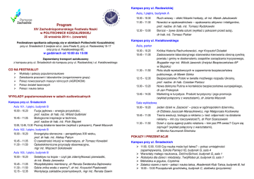 Kampus przy ul. Racławickiej Aula, I piętro, budynek A Program XIV Zachodniopomorskiego Festiwalu Nauki w POLITECHNICE KOSZALIŃSKIEJ 25 września 2014 r. (czwartek) Festiwalowe spotkania odbywają się w obiektach Politechniki Koszalińskiej przy ul. Śniadeckich 2 (wejście od ul. Jana Pawła II), przy ul. Racławickiej 15-17 oraz przy ul. Kwiatkowskiego 6E. w godzinach od 10:00 do 15:00 10.00 – 10.30 11.00 – 11.30 12.30 – 13.00 Kampus przy ul. Kwiatkowskiego Aula, parter 10.00 – 10.20 10.45 – 11.05 Zapewniamy transport autobusowy z kampusu przy ul. Śniadeckich do kampusu przy ul. Racławickiej i ul. Kwiatkowskiego CO NA FESTIWALU? Wykłady i pokazy popularnonaukowe Zwiedzanie pracowni i laboratoriów (zorganizowane grupy) Pokaz nowoczesnych maszyn rolniczych (AGROKOM) Pokaz świateł laserowych Pokaz i nauka tańca WYKŁADY popularnonaukowe w salach audiowizualnych Kampus przy ul. Śniadeckich Aula 101, I piętro, budynek B Fuzja jądrowa – energia przyszłości, prof. nadzw. dr hab. inż. Witold Gulbiński 10.45 – 11.05 Biologiczne inspiracje w technice, prof. nadzw dr hab. inż. Piotr Stępień 12.00, 12.45, 13.30 Poznaj działanie laserów (wykład z pokazem), Paweł Mazurek 11.30 – 11.50 12.15 – 12.35 13.00 – 13.20 13.45 – 14.05 10.00 – 10.20 10.45 – 11.05 11.30 – 11.50 Energetyka słoneczna – perspektywa XXI wieku, prof. dr hab. inż. Aleksy Patryn O zawodności intuicji w matematyce, dr Tomasz Kowalski Optoelektroniczne przyrządy obserwacyjne, mgr inż. Wojciech Sokołowski Aula 103, I piętro, budynek B 10.00 – 10.20 10.45 – 11.05 11.30 – 11.50 12.15 – 12.35 Detektyw na tropie – czyli jak zidentyfikować pierwiastki, dr inż. Beata Janowska Wszędobylskie membrany, dr Renata Świderska-Dąbrowska Gdzie znika woda z wanny?, dr inż. Krzysztof Piaskowski Wentylacja zakładów przemysłowych, mgr inż. Renata Gawin Krótka Historia Rachunkowości, mgr Krzysztof Dziadek Zastosowanie laboratoryjnego stanowiska kierowania obroną cywilną powiatu i gminy w doskonaleniu zespołów zarządzania kryzysowego, Brygadier mgr inż. Witold Jaworski (Instytut Bezpieczeństwa AP w Słupsku) Rola służb wywiadowczych w zapewnienie bezpieczeństwa publicznego, dr Marek Górka Bezpieczeństwo Polski w świetle możliwego rozpadu Ukrainy, prof. nadzw. dr hab. Czesław Partacz Nowa doktryna Putina w kontekście bezpieczeństwa europejskiego, dr Jan Prokopiuk Marketing w turystyce. Produkt turystyczny i jego promocja (wykład połączony z warsztatami), dr Jolanta Mazurek Sala wykładowa 10.00 – 10.20 10.00 – 10.20 Aula 102, I piętro, budynek B Ruch wirowy – efekt filiżanki herbaty, dr inż. Marek Jakubowski Nowości w opakowalnictwie – opakowania aktywne i inteligentne, prof. nadzw. dr hab. inż. Tomasz Rydzkowski Bonzai – żywe dzieła sztuki (wykład z pokazem przed aulą), dr hab. inż. Tomasz Piskier 10.45 – 11.05 11.30 – 11.50 Jeden dzień w „Gazecie” – praca w ogólnopolskim dzienniku, dr Elżbieta Juszczak-Maraszkiewicz, mgr Małgorzata Kozłowska Teoria ewolucji, biologia a reklama (+ test: odporność na działanie reklamy – mit czy rzeczywistość?), dr Piotr Szarszewski Dzień z życia agencji public relations – kim jest PR-owiec? Czym się zajmuje? (wykład połączony z warsztatami), dr Monika Kaczmarek-Śliwińska POKAZY I PREZENTACJE Kampus przy ul. Śniadeckich 11:00, 12:00, 13:00 Czy nauka może być łatwa? – pokaz umiejętności zapamiętywania, Szkoła Pamięci IQ, budynek G, sala 4 Warsztaty małego naukowca, DaVinciSchool, budynek G, sala 1 Robotyka dla dzieci i młodzieży, TwójRobor.pl, budynek G, sala 1 Biblioteka w pigułce, Czytelnia Zatańcz razem z nami – pokaz i nauka tańca, Akademicki Klub Tańca, budynek B, hol 10:00 – 13:00 Poczęstunek grochówką, budynek C, stołówka (przyziemie) Budynek C, E, F, I – Wydział Inżynierii Lądowej, Środowiska i Geodezji – Skąd wiemy że nasze domy są bezpieczne? Miażdżymy, uderzamy, prześwietlamy materiały, z których są zrobione! Pokaz wytrzymałości materiałów stosowanych w budownictwie, mgr inż. Kobaka – Instrumenty geodezyjne i technologie pomiarowe (warsztat), dr inż. Krzysztof Deska – Innowacje w ochronie środowiska, prof. dr hab. inż. Tomasz Heese – Prezentacja cyfrowych stacji fotogrametrycznych Dephos. Pokaz trójwymiarowych obrazów lotniczych, mgr inż. Tomasz Oberski Budynek D – Wydział Elektroniki i Informatyki – Zastosowanie kamery termograficznej, dr inż. Jarosław Kraśniewski – Eksperyment ze światłem, dr inż. Leszek Bychto – Poznaj systemy alarmowe, dr inż. Łukasz Chrobak – System sterowania elektrycznym wózkiem inwalidzkim, dr inż. Marek Popławki – Sterowanie modelami kolejowymi, mgr inż. Wojciech Sokołowski – Uczelniane Centrum Technologii Informatycznych – Infrastruktura i energooszczędność w Data Center – Studio telewizyjne od kuchni Budynek G, H – Instytut Technologii i Edukacji – Czym jest próżnia, materiałem czy środowiskiem?, prof. nadzw. dr hab. inż. Andrzej Czyżniewski – Zastosowanie elektronowej mikroskopii skaningowej i mikroanalizy rentgenowskiej do badania materiałów nieorganicznych i organicznych (wykład z pokazem dla 6 osób), prof. nadzw. dr hab. Kazimierz Reszka – Ciekawy świat metali i stopów, dr inż. Mieczysław Pancielejko – Natura abhorret vacuum? (Natura nie znosi próżni?), dr Tomasz Suszko – Zrób to sam, czyli drukarka 3D, mgr inż. Katarzyna Peplińska-Matysiak, mgr inż. Kazimierz Kamiński – Energia ze słońca, mgr inż. Katarzyna Peplińska-Matysiak, mgr inż. Kazimierz Kamiński – Natura abhorret vacuum? (Natura nie znosi próżni?), dr Tomasz Suszko – Pokaz robotów mobilnych, dr inż. Piotr Zaporski – Pokaz robotów przemysłowych, dr inż. Piotr Zaporski – Programowalna technika (prezentacja z pokazem), dr inż. Zenon Ociepa – Świat w termowizji, mgr inż. Katarzyna Peplińska-Matysiak mgr inż. Kazimierz 