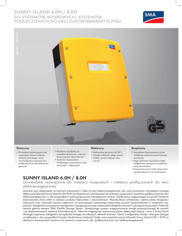 SUNNY ISLAND 6.0H / 8.0H SI6.0H-11 / SI8.0H-11 Do systemów wyspowych i systemów podłączonych do sieci elektroenergetycznej Elastyczny •Do instalacji produkujących prąd na potrzeby własne i instalacji zasilania awaryjnego, zarównow konfiguracji wyspowej, jak i podłączonych do sieci elektroenergetycznej •Możliwość współpracy ze wszystkimi ołowiowymi i wieloma litowo-jonowymi akumulatorami •Możliwość doposażenia i modułowego rozszerzenia w systemach jedno- i trójfazowych Efektywny Bezpieczny •Maksymalna sprawność do 96 % •Wysoka wydajność całego systemu •Szybka i prosta instalacja oraz rozruch •Sprawdzone bezpieczeństwo przez certyfikację wykonaną przez instytucję zewnętrzną •Długa żywotność akumulatora dzięki inteligentnemu systemowi zarządzania pracą akumulatora •Niezawodna praca dzięki ekstremalnie wysokiej odporności na przeciążenia Sunny Island 6.0H / 8.0H Uniwersalne rozwiązanie do instalacji wyspowych i instalacji podłączonych do sieci elektroenergetycznej Zarówno przy eksploatacji na terenach położonych z dala od sieci elektroenergetycznej, jak i przy prywatnym zarządzaniu energią elektryczną falowniki Sunny Island 6.0H/8.0H są elastycznym rozwiązaniem do systemów wyspowych i systemów podłączonych do sieci elektroenergetycznej i w obu przypadkach zachwycają swoimi niewątpliwymi atutami. Użytkownicy mogą polegać na ponad 25-letnimi doświadczeniu firmy SMA w zakresie produkcji falowników z akumulatorami. Wysoka klasa ochronności, szeroki zakres temperatur roboczych oraz niezwykle wysoka odporność na przeciążenia zapewniają maksymalny poziom bezpieczeństwa w systemach wyspowych. Inteligentne zarządzanie obciążeniem i energią gwarantuje niezawodne działanie również w sytuacjach krytycznych. Falownik stanowi główny element SMA Flexible Storage System - elastycznego systemu magazynowania energii przeznaczonego do nowych i już eksploatowanych instalacji fotowoltaicznych - falownik magazynuje wytworzony przez siebie prąd solarny i wraz z Sunny Home Manager zapewnia inteligentne zarządzanie energią we własnych czterech ścianach. Quick Configuration Guide i intuicyjna obsługa umożliwiają w obu przypadkach prostą i komfortową instalację. Dzięki swej wszechstronności falowniki Sunny Island 6.0H / 8.0H są idealnymi rozwiązaniami zarówno do systemów wyspowych, jak i podłączonych do sieci elektroenergetycznej! Trójfazowy system wyspowy Jednofazowy system podłączony do sieci elektroenergetycznej Charakterystyka sprawności falownika Wykres mocy w zależności od temperatury Sunny Island 6.0H / 8.0H Dane techniczne Eksploatacja przy podłączeniu do publicznej sieci elektroenergetycznej lub generatora Znamionowe napięcie sieci / zakres napięcia AC Znamionowa częstotliwość napięcia w sieci / dopuszczalny zakres częstotliwości Maks. prąd AC przy optymalizacji zużycia energii na potrzeby własne (praca w trybie sieciowym) Maks. moc AC przy optymalizacji zużycia energii na potrzeby własne (praca w trybie sieciowym) Maksymalny prąd wejściowy AC Maksymalna moc wejściowa AC Praca w trybie wyspowym lub zasilania awaryjnego Znamionowe napięcie sieci / zakres napięcia AC Częstotliwość znamionowa / zakres częstotliwości (regulowany) Moc znamionowa (przy Un / fn / 25 °C / cos φ = 1) Moc AC przy 25 °C przez 30 min / 5 min / 3 sek. Moc ciągła AC przy 45 °C Prąd znamionowy / maksymalny prąd wyjściowy (szczytowy) Współczynnik zawartości harmonicznych w napięciu wyjściowym / współczynnik mocy przy mocy znamionowej Wejście DC akumulatora Znamionowe napięcie wejściowe / zakres napięcia DC Maksymalny prąd ładowania akumulatora / znamionowy prąd ładowania DC / znamionowy prąd rozładowania DC Typ akumulatora / pojemność akumulatora (zakres) Regulacja ładowania Sprawność / własne zużycie energii urządzenia Maksymalna sprawność Pobór mocy na biegu jałowym / w trybie czuwania Zabezpieczenie (urządzenie) Zwarcie AC / przeciążenie AC Ochrona przed niewłaściwą biegunowością DC / bezpiecznik DC Przegrzanie / głębokie rozładowanie akumulatora Kategoria przepięciowa wg IEC 60664-1 Dane ogólne Wymiary (szer. x wys. x głęb.) Masa Zakres temperatur pracy Klasa ochronności wg IEC 62103 Klasa klimatyczna wg IEC 60721 Stopień ochrony według EN 60529 Wyposażenie / funkcja Obsługa i ekran / przekaźnik wielofunkcyjny Systemy 3-fazowe / funkcja podtrzymywania akumulatorowego Obliczanie stanu naładowania / ładowanie pełne / ładowanie wyrównawcze Czujnik temperatury akumulatora / przewody komunikacyjne Certyfikaty i homologacje Gwarancja Do systemów wyspowych Automatyczne wykrywanie następstwa faz / wsparcie generatora Łączenie równoległe / rozwiązania wieloklastrowe Zintegrowany układ łagodnego rozruchu Akcesoria Do systemów wyspowych Bezpiecznik akumulatora** Złącze SI-COMSMA (RS485) / SI-SYSCAN (do systemów wieloklastrowych) Złącze SWDMSI-10 (Speedwire) Sunny Island Charger SIC50-MPT** / SMA Cluster Controller Do systemów podłączonych do sieci elektroenergetycznej Złącze SI-COMSMA (RS485) / złącze SWDMSI-10 (Speedwire) Sunny Home Manager / SMA Energy Meter / urządzenie do przełączania na zasilanie awaryjne** ● Wyposażenie standardowe ○ Opcja — Wyposażenie niedostępne Sunny Island 6.0H Sunny Island 8.0H 230 V / 172,5 V do 264,5 V 50 Hz / 40 Hz do 70 Hz 20 A 4,6 kVA 50 A 11500 W 230 V / 172,5 V do 264,5 V 50 Hz / 40 Hz do 70 Hz 26 A 6 kVA 50 A 11500 W 230 V / 202 V do 253 V 50 Hz / 45 Hz do 65 Hz 4600 W 6000 W / 6800 W / 11000 W 3700 W 20 A / 120 A 230 V / 202 V do 253 V 50 Hz / 45 Hz do 65 Hz 6000 W 8000 W / 9100 W / 11000 W 5430 W 26 A / 120 A < 4 % / −1 do +1 < 4 % / −1 do +1 48 V / 41 V do 63 V 110 A / 90 A / 103 A 48 V / 41 V do 63 V 140 A / 115 A /130 A Litowo-jonowy*, FLA, VRLA / 100 Ah do 10 000 Ah (ołowiowy) 50 Ah do 10 000 Ah (litowo-jonowy) Metoda ładowania IUoU z automatycznym ładowa
