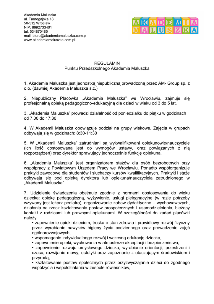 Akademia Maluszka ul. Tarnogajska 18 50-512 Wrocław NIP: 8992733401 tel. 534870485 mail: [email protected] www.akademiamaluszka.com.pl REGULAMIN Punktu Przedszkolnego Akademia Maluszka 1. Akademia Maluszka jest jednostką niepubliczną prowadzoną przez AM- Group sp. z o.o. (dawniej Akademia Maluszka s.c.) 2. Niepubliczny Placówka „Akademia Maluszka” we Wrocławiu, zajmuje się profesjonalną opieką pedagogiczno-edukacyjną dla dzieci w wieku od 3 do 5 lat. 3. „Akademia Maluszka” prowadzi działalność od poniedziałku do piątku w godzinach od 7.00 do 17:30 4. W Akademii Maluszka obowiązuje podział na grupy wiekowe. Zajęcia w grupach odbywają się w godzinach: 8:30-11:30 5. W „Akademii Maluszka” zatrudniani są wykwalifikowani opiekunowie/nauczyciele (ich ilość dostosowana jest do wymogów ustawy, oraz powiązanych z nią rozporządzeń) oraz dyrektor sprawujący jednocześnie funkcję opiekuna. 6. „Akademia Maluszka” jest organizatorem stażów dla osób bezrobotnych przy współpracy z Powiatowym Urzędem Pracy we Wrocławiu. Ponadto współorganizuje praktyki zawodowe dla studentów i słuchaczy kursów kwalifikacyjnych. Praktyki i staże odbywają się pod opieką dyrektora lub opiekuna/nauczyciela zatrudnionego w „Akademii Maluszka” 7. Udzielenie świadczenia obejmuje zgodnie z normami dostosowania do wieku dziecka: opiekę pedagogiczną, wyżywienie, usługi pielęgnacyjne (w razie potrzeby wzywany jest lekarz pediatra), organizowanie zabaw dydaktyczno – wychowawczych, działania na rzecz kształtowania postaw prospołecznych i usamodzielnienia, bieżący kontakt z rodzicami lub prawnymi opiekunami. W szczególności do zadań placówki należy: • zapewnienie opieki dzieciom, troska o stan zdrowia i prawidłowy rozwój fizyczny przez wyrabianie nawyków higieny życia codziennego oraz prowadzenie zajęć ogólnorozwojowych, • wspomaganie indywidualnego rozwój i wczesną edukację dziecka, • zapewnienie opieki, wychowania w atmosferze akceptacji i bezpieczeństwa, • zapewnienie rozwoju umysłowego dziecka, wyrabianie orientacji, przestrzeni i czasu, rozwijanie mowy, estetyki oraz zapoznanie z otaczającym środowiskiem i przyrodą, • kształtowanie postaw społecznych przez przyzwyczajanie dzieci do zgodnego współżycia i współdziałania w zespole rówieśników, Akademia Maluszka ul. Tarnogajska 18 50-512 Wrocław NIP: 8992733401 tel. 534870485 mail: [email protected] www.akademiamaluszka.com.pl • współdziała z rodzicami/prawnymi opiekunami pełniąc wobec nich funkcję doradczą i wspierającą działania wychowawcze. Do zadań dyrektora należy: • kierowanie bieżącą działalnością opiekuńczo -wychowawczą, zdrowotną, administracyjną oraz merytoryczną placówki, • reprezentowanie placówki na zewnątrz, • opracowanie dokumentacji pedagogicznej – zgodnie z aktualnie obowiązującymi przepisami ustawy oraz innych obowiązujących dokumentów prawnych, • zapewnienie dzieciom oraz pracownikom merytorycznym, administracyjnym i obsługi bezpiecznych i higienicznych warunków pobytu w placówce, • ustalenie ramowego rozkładu dnia z uwzględnieniem zasad ochrony zdrowia i higieny pracy oraz oczekiwań rodziców ( prawnych opiekunów ), • przygotowanie arkusza organizacji pracy placówki, • sprawowanie nadzoru pedagogicznego w stosunku do zatrudnionych opiekunów, • zgromadzenie informacji o pracy opiekunów w celu dokonywania oceny ich pracy – według zasad określonych w odrębnych przepisach, nadzór nad sposobem dokumentowania przez opiekunów przebiegu pracy opiekuńczo -wychowawczej oraz dokumentowania zajęć, zgodnie z aktualnie obowiązującymi przepisami, • sprawowanie opieki nad dziećmi oraz tworzenie warunków harmonijnego rozwoju psychofizycznego poprzez aktywne działania prozdrowotne, • współpraca z rodzicami oraz instytucjami nadzorującymi i kontrolującymi pracę placówki, • prowadzenie i archiwizowanie dokumentacji placówki, • przyjmowanie oraz skreślanie dziecka z listy uczęszczających do placówki zgodnie z ustalonymi w statucie zasadami oraz zawieranie umów cywilnoprawnych o świadczenie usług z rodzicami bądź opiekunami dzieci w imieniu założyciela, • proponowanie utworzenia bądź likwidacji oddziału placówki, • proponowanie zmian w statucie placówki, • zarządzanie placówką wykonując inne zadania przewidziane dla jego stanowiska przepisami prawa oraz podejmowanie decyzji we wszystkich sprawach nie przekazanych pracownikom placówki. Obowiązkiem pracowników „Akademii Maluszka” zatrudnionych na stanowiskach związanych z opieką i wychowaniem dzieci jest: • wykonywanie prac związanych z zadaniami „Akademii Maluszka” (określonych w statusie, regulaminie oraz innych aktach placówki) zgodnie z zakresami czynności, Akademia Maluszka ul. Tarnogajska 18 50-512 Wrocław NIP: 8992733401 tel. 534870485 mail: [email protected] www.akademiamaluszka.com.pl • zapewnienie dzieciom bezpieczeństwa i troskliwej opieki, • czuwanie nad samopoczuciem i stanem zdrowia dzieci, a w razie wystąpienia objawów chorobowych, złego samopoczucia lub urazów natychmiastowe zgłoszenie dyrektorowi placówki w celu zorganizowania i udzielenia pomocy, • informowanie rodziców o samopoczuciu i zachowaniu dziecka w „Akademii Maluszka”, • współdziałanie z rodzicami w sprawach opieki i wychowania w celu ujednolicenia metod pielęgnacji i wychowania dzieci w domu i „Akademii Maluszka”. 8. Po przyjęciu dziecko pozostaje pod stałą opieką pedagogiczną, aż do momentu odebrania przez rodziców lub osoby przez nich pisemnie upoważnione. 9.Ustala się następujący ogólny harmonogram dnia: 7.00 -8.00 Przyjmowanie dzieci do Akademii Maluszka. Zabawy dowolne. 8.00 -8.30 Śniadanie. 8.30 -8.50 Zabiegi higieniczne 8.50 -10.30 Zajęcia tematyczne w sali. Dowolne i organizowane zabawy ruchowe i/lub na powietrzu. 10.30 -11.00 Drugie śniadanie. 11.00 -11.30 