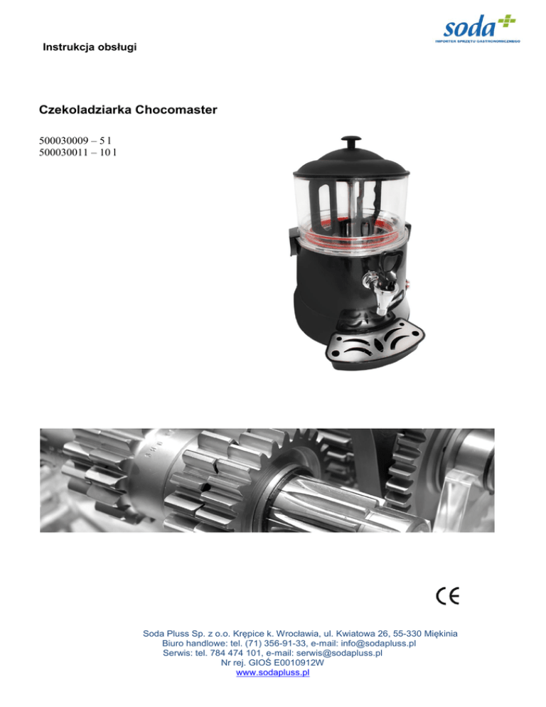 Instrukcja obsługi Czekoladziarka Chocomaster 500030009 – 5 l 500030011 – 10 l Soda Pluss Sp. z o.o. Krępice k. Wrocławia, ul. Kwiatowa 26, 55-330 Miękinia Biuro handlowe: tel. (71) 356-91-33, e-mail: [email protected] Serwis: tel. 784 474 101, e-mail: [email protected] Nr rej. GIOŚ E0010912W www.sodapluss.pl Instrukcja obsługi 1. WPROWADZENIE Należy zapoznać się z niniejszą instrukcją przed uruchomieniem czekoladziarki. Jak każde mechaniczne urządzenie, wymaga ono starannego czyszczenia i konserwacji. 2. INSTALACJA a) Wyjąć urządzenie z opakowania, które powinno zostać zachowane na wypadek konieczności ponownego transportu. b) Sprawdzić czy czekoladziarka nie została uszkodzona podczas transportu. c) Przed użyciem części urządzenia mające kontakt z żywnością należy zdemontować i dokładnie umyć d) Ustawić czekoladziarkę na płaskiej, stabilnej powierzchni, przystosowanej do jej wagi uwzględniającej wagę pełnego pojemnika. e) Przed podłączeniem do źródła zasilania należy sprawdzić czy napięcie jest zgodne z podanym na etykiecie urządzenia. Podłączenie powinno posiadać uziemienie. OPIS URZĄDZENIA: 1. POKRYWA 2. ZBIORNIK (5 LUB 10 LITRÓW) 3. MIESZADŁO 4. KRANIK 5. KRATKA TACY OCIEKOWEJ 6. TACA OCIEKOWA 7. TRZON MIESZACZA 8. POWIERZCHNIA GRZEWCZA 9. OKRĄGŁY UCHWYT 10. GŁÓWNA CZĘŚĆ 11. LAMPKA LED 12. WŁĄCZNIK ON/OFF 13. DOLNA CZĘŚĆ Soda Pluss Sp. z o.o. Krępice k. Wrocławia, ul. Kwiatowa 26, 55-330 Miękinia Biuro handlowe: tel. (71) 356-91-33, e-mail: [email protected] Serwis: tel. 784 474 101, e-mail: [email protected] Nr rej. GIOŚ E0010912W www.sodapluss.pl Instrukcja obsługi 3. OBSŁUGA 1. Podnieś pokrywę i wlej przygotowany zgodnie z wytycznymi producenta produkt do zbiornika. Nigdy nie przekraczaj zaznaczonego na ściance zbiornika poziomu MIN / MAX. 2. Naciśnij główny włącznik. Kiedy lampka LED się świeci, oznacza to, że urządzenie jest włączone; tym samym wyłączone urządzenie sygnalizuje nie świecąca się lampka LED Temperatura ustawiona na poziomie: 30-90⁰C. A C B A – przycisk podgrzewania i mieszania B – ustawienia temperatury C – lampka kontroli mieszania D – lampka kontroli podgrzewania D Przy uruchomieniu postępuj zgodnie z wytycznymi: NACIŚNIJ GŁÓWNY włącznik ON/OFF, NACIŚNIJ przycisk A, mieszacz zacznie pracować, lampka C zostanie uruchomiona NACIŚNIJ PONOWNIE przycisk A, spowoduje to uruchomienie grzałki, lampka D włączy się NACIŚNIJ A aż lampki C i D przestaną świecić NACIŚNIJ przycisk B aż temperatura wzrośnie ZWOLNIJ przycisk B w momencie uzyskania przez termostat pożądanej temperatury Przy pierwszym włączeniu grzania zaleca się stopniowania temperatury gdyż grzałka rozbiega się o około 7stopni ponowne włączenie się grzałki oznacza że produkt osiągnął temperaturę zadaną. Soda Pluss Sp. z o.o. Krępice k. Wrocławia, ul. Kwiatowa 26, 55-330 Miękinia Biuro handlowe: tel. (71) 356-91-33, e-mail: [email protected] Serwis: tel. 784 474 101, e-mail: [email protected] Nr rej. GIOŚ E0010912W www.sodapluss.pl Instrukcja obsługi 4. CZYSZCZENIE 2. Wyciągnij mieszacz pociągając za jego górne ramię do góry. 1. Zdejmij pokrywę. 4. Uwolnij uchwyty od głównej części urządzenia w celu ściągnięcia zbiornika. 7. Pociągnij do góry trzon mieszacza; zachowaj ostrożność 5. Pociągnij zbiornik do góry używając do tego dwóch palców, aby uwolnić go od metalowej, głównej części (jak na zdjęciu) 3. Przechyl delikatnie mieszacz i pociągnij do góry (jak na zdjęciu) 6. Pociągnij zbiornik do góry. Uwaga! Zbiornik musi zostać opróżniony, zanim zostanie ściągnięty. 8. Umieść zbiornik na płaskiej powierzchni. Ostrożnie, za pomocą obu rąk zdejmij uszczelkę. Soda Pluss Sp. z o.o. Krępice k. Wrocławia, ul. Kwiatowa 26, 55-330 Miękinia Biuro handlowe: tel. (71) 356-91-33, e-mail: [email protected] Serwis: tel. 784 474 101, e-mail: [email protected] Nr rej. GIOŚ E0010912W www.sodapluss.pl Instrukcja obsługi 5. MONTAŻ Przymocuj zbiornik do głównej części urządzenia za pomocą uchwytów. Włóż trzon mieszacza w odpowiednie miejsce (jak na rysunku) Włóż mieszacz w odpowiednie miejsce (jak na rysunku) Wyczyść pokrywę za pomocą wilgotnej ściereczki lub opłucz wodą (jak na rysunku) Upewnij się, że uszczelka znajduje się we właściwym miejscu, czyli jest równomiernie rozłożona na krawędzi urządzenia (jak na zdjęciu). Nieprawidłowe ułożenie uszczelki może spowodować nieszczelność zbiornika. Ważne!: Pamiętaj, aby kontrolować czy nie ma żadnych wycieków z kurka. Jeśli są, sprawdzić przede wszystkim czy mechanizm kurka został prawidłowo zmontowany. Jeśli wyciek nie znika należy sprawdzić stan gumowego pierścienia „O”– jeśli jest zniszczony należy go wymienić. Niniejsze urządzenie należy podłączyć do odpowiedniego gniazdka elektrycznego. Zgodnie z ustawą o zużytym sprzęcie elektrycznym i elektronicznym (ZSEE) z dnia 29 lipca 2005 oraz ustawą o Utrzymaniu Czystości i Porządku w Gminach z dnia 13 września 1996r konsument : Zobowiązany jest oddawać zużyty sprzęt elektryczny i elektroniczny zbierającemu taki sprzęt. (art.35 ustawy ZSEE) Konsument nie może wyrzucać zużytego sprzętu łącznie z innymi odpadami. (art.36 ustawy ZSEE) Za pozostawienie tego typu sprzętu w miejscu do tego nie przeznaczonym (np. wyrzucenie do śmietnika, wystawienie przed blok czy porzucenie w lesie) grozi kara grzywny od 20 do 5000 zł. (art. 74 ustawy ZSEE) Od 1 lipca 2006 r. konsument ma prawo do nieodpłatnego oddania swojego zużytego sprzętu elektrycznego lub elektronicznego w sklepie, który przyjmuje zużyty sprzęt w ilości nie większej niż sprzedawany nowy sprzęt na zasadzie "1 za 1”, czyli lodówka za lodówkę, telewizor za telewizor, suszarka do włosów za suszarkę, świetlówka za świetlówkę itp. (art. 42 ust. 1 ustawy ZSEE) Konsument ma prawo nieodpła