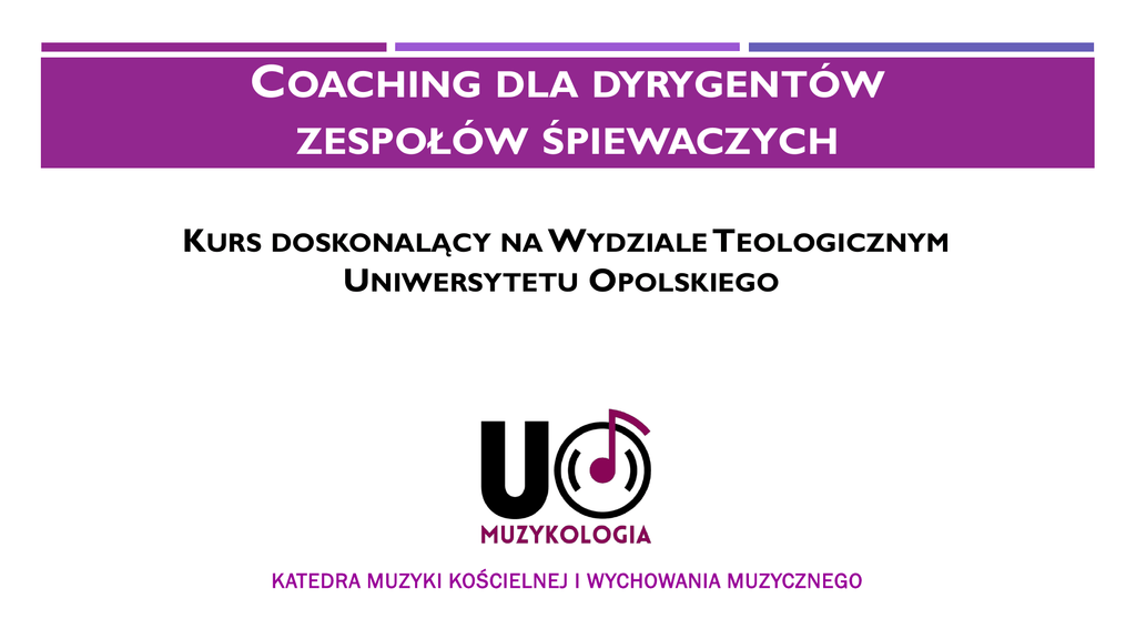 COACHING DLA DYRYGENTÓW ZESPOŁÓW ŚPIEWACZYCH KURS DOSKONALĄCY NA WYDZIALE TEOLOGICZNYM UNIWERSYTETU OPOLSKIEGO KATEDRA MUZYKI KOŚCIELNEJ I WYCHOWANIA MUZYCZNEGO ZAKRES TEMATYCZNY KURSU „Coaching dla dyrygentów zespołów śpiewaczych” to kurs proponowany wszystkim zainteresowanym doskonaleniem warsztatu dyrygenckiego – zarówno dla osób prowadzących zespoły oraz dla zamierzających je stworzyć. Program kursu obejmuje zajęcia z dyrygowania, emisji głosu, metodyki prowadzenia zespołów, coachingu. Wartością dodaną kursu są wykłady gościnne słynnych chórmistrzów z Polski i zagranicy (min. z Tokio i Regensburga). JEDNOSTKA ORGANIZACYJNA PROWADZĄCA KSZTAŁCENIE Wydział Teologiczny Uniwersytetu Opolskiego Instytut Liturgii, Muzyki i Sztuki Sakralnej Katedra Muzyki Kościelnej i Wychowania Muzycznego OKRES TRWANIA KURSU I TERMIN ROZPOCZĘCIA 1 rok: 2 semestry Liczba zjazdów w semestrze: 7 Liczba godzin w semestrze: 7 x 10 godzin = 70 godzin Liczba godzin w roku: 140 godzin Termin rozpoczęcia kursu: 1 października 2016 r. (sobota) PLAN I PROGRAM KURSU Kurs odbędzie się na Wydziale Teologicznym Uniwersytetu Opolskiego, w soboty, w roku akademickim 2016/2017. SCHEMAT GODZINOWY ZAJĘĆ 9.00 – 10.30 wykład (łączone dwie godziny lub 2 x 45 minut) 10.45 – 12.15 wykład (łączone dwie godziny lub 2 x 45 minut) 12.45 – 14.15 wykład (łączone dwie godziny lub 2 x 45 minut) 14.00 – 15.30 wykład (łączone dwie godziny lub 2 x 45 minut) 16.00–17.30 Chór WYMAGANIA STAWIANE KANDYDATOM Adresaci kursu: • nauczyciele muzyki (lub innych przedmiotów szkolnych) prowadzący szkolne zespoły śpiewacze, • dyrygenci chórów i scholi parafialnych, • absolwenci podyplomowego kierunku Prowadzenie Zespołów Śpiewaczych (DIMK), • absolwenci muzykologii, • osoby z długoletnim stażem prowadzania zespołu, chcące szkolić swój warsztat dyrygencki, • absolwenci diecezjalnych szkół organistowskich, Państwowych Szkół Muzycznych I lub II stopnia. WYMAGANIA STAWIANE KANDYDATOM Warunkiem uczestnictwa w kursie jest: • udokumentowanie wykształcenia muzycznego lub działalności chórmistrzowskiej; • złożenie wypełnionego formularza zgłoszeniowego; • podpisanie umowy między Uczelnią, a uczestnikiem kursu o świadczenie usług edukacyjnych; • złożenie dowodu uiszczenia opłaty za kurs, zgodnie z zapisami umowy o świadczenie usług edukacyjnych.
