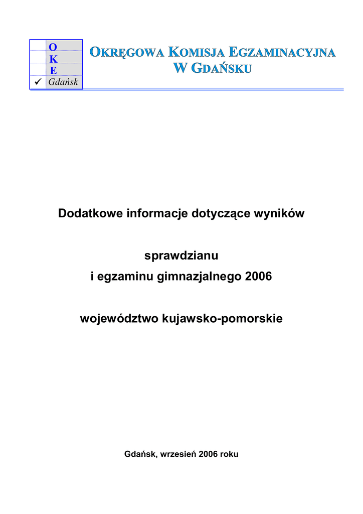 O K E Gdańsk Dodatkowe informacje dotyczące wyników sprawdzianu i egzaminu gimnazjalnego 2006 województwo kujawsko-pomorskie Gdańsk, wrzesień 2006 roku OKRĘGOWA KOMISJA EGZAMINACYJNA W GDAŃSKU Uczestnicy sprawdzianu w 2006 roku Woj. kujawsko- pomorskie Liczba Liczba szkół uczniów 697 Kraj 27 232 Liczba szkół Liczba uczniów 13 219 473 924 Wartości podstawowych wskaźników statystycznych wyników uczniów ze sprawdzianu w 2006 roku (zestaw standardowy) Wskaźnik statystyczny Woj. kujawsko-pomorskie Kraj Wynik średni 24,0 25,3 % uzyskanych punktów 60 63 Procent uzyskanych punktów ze sprawdzianu w 2006 roku w obszarach standardów wymagań egzaminacyjnych (zestaw standardowy) Woj. kujawsko-pomorskie Kraj Czytanie 75 77 Pisanie 63 69 Rozumowanie 52 56 Korzystanie z informacji 58 60 Wykorzystywanie wiedzy w praktyce 47 49 Obszar standardów 2 Dodatkowe informacje dotyczące wyników sprawdzianu i egzaminu gimnazjalnego 2006 województwo kujawsko-pomorskie OKRĘGOWA KOMISJA EGZAMINACYJNA W GDAŃSKU Wartości podstawowych wskaźników statystycznych wyników uczniów ze sprawdzianu w 2006 roku z uwzględnieniem lokalizacji szkoły (zestaw standardowy) Woj. kujawsko-pomorskie Kraj wynik średni 23,2 24,4 % uzyskanych punktów 58 61 wynik średni 23,3 24,8 % uzyskanych punktów 58 62 wynik średni 23,9 25,7 % uzyskanych punktów 60 64 wynik średni 25,6 27,0 % uzyskanych punktów 64 68 Miasto powyŜej 100 tys. mieszkańców Miasto od 20 tys. do 100 tys. mieszkańców Miasto do 20 tys. mieszkańców Wieś Lokalizacja Wskaźniki szkoły statystyczne Dodatkowe informacje dotyczące wyników sprawdzianu i egzaminu gimnazjalnego 2006 województwo kujawsko-pomorskie 3 OKRĘGOWA KOMISJA EGZAMINACYJNA W GDAŃSKU Sprawdzane umiejętności w obszarach standardów Obszar standardów Waga (%) L. pkt. % uzyskanych pkt. Czytanie (I) Pisanie (II) Rozumowanie (III) Korzystanie z informacji (IV) 25 25 20 10 10 10 8 4 18,7 15,7 10,4 5,8 Wykorzystywanie wiedzy w praktyce (V) 20 8 9,4 100 40 60,0 Razem Wagi procentowe 20% 25% Czytanie (I) Pisanie (II) 10% Rozumowanie (III) Korzystanie z informacji (IV) Wykorzystywanie wiedzy w praktyce (V) 25% 20% Procent uzyskanych punktów 18,7% Czytanie (I) 40,0% Pis anie (II) 15,7% Rozum owanie (III) Korzystanie z inform acji (IV) Wykorzys tywanie wiedzy w praktyce (V) Nieopanowane um iejętnoś ci 9,4% 4 10,4% 5,8% Dodatkowe informacje dotyczące wyników sprawdzianu i egzaminu gimnazjalnego 2006 województwo kujawsko-pomorskie OKRĘGOWA KOMISJA EGZAMINACYJNA W GDAŃSKU Średnie wyniki szkół z poszczególnych obszarów standardów na znormalizowanej skali staninowej w latach 2002–2006 I. Czytanie Przedział punktowy Numer stanina 2002 2003 2004 2005 2006 1 2,5 - 6,3 5,0 - 6,3 1,0 - 6,7 5,0 - 6,8 2,8 - 6,1 2 6,4 - 6,8 6,4 - 6,7 6,8 - 7,1 6,9 - 7,2 6,2 - 6,6 3 6,9 - 7,1 6,8 - 7,0 7,2 - 7,5 7,3 - 7,5 6,7 - 6,9 4 7,2 - 7,5 7,1 - 7,4 7,6 - 7,8 7,6 - 7,8 7,0 - 7,2 5 7,6 - 7,9 7,5 - 7,7 7,9 - 8,1 7,9 - 8,1 7,3 - 7,5 6 8,0 - 8,2 7,8 - 8,1 8,2 - 8,4 8,2 - 8,4 7,6 - 7,8 7 8,3 - 8,5 8,2 - 8,5 8,5 - 8,7 8,5 - 8,6 7,9 - 8,2 8 8,6 - 9,1 8,6 - 9,2 8,8 - 9,1 8,7 - 9,0 8,3 - 8,7 9 9,2 - 10,0 9,3 - 10,0 9,2 - 9,9 9,1 - 10,0 8,8 - 9,7 II. Pisanie Numer stanina Przedział punktowy 2002 2003 2004 2005 2006 1 2,3 - 7,2 4,3 - 6,9 0,0 - 5,6 1,0 - 4,3 2,0 - 4,2 2 7,3 - 8,0 7,0 - 7,5 5,7 - 6,4 4,4 - 5,0 4,3 - 4,9 3 8,1 - 8,5 7,6 - 8,1 6,5 - 7,0 5,1 - 5,5 5,0 - 5,5 4 8,6 - 9,0 8,2 - 8,5 7,1 - 7,6 5,6 - 5,9 5,6 - 6,0 5 9,1 - 9,4 8,6 - 9,0 7,7 - 8,2 6,0 - 6,4 6,1 - 6,5 6 9,5 - 9,8 9,1 - 9,4 8,3 - 8,7 6,5 - 6,9 6,6 - 7,0 7 9,9 - 10,2 9,5 - 9,8 8,8 - 9,3 7,0 - 7,4 7,1 - 7,5 8 10,3 - 10,7 9,9 - 10,2 9,4 - 9,8 7,5 - 7,9 7,6 - 8,1 9 10,8 - 11,7 10,3 - 12,0 9,9 -11,5 8,0 - 10,0 8,2 - 9,8 III. Rozumowanie Numer stanina Przedział punktowy 2002 2003 2004 2005 2006 1 1,7 - 4,4 2,3 - 3,9 0,0 - 1,9 1,0 - 4,1 0,7 - 2,4 2 4,5 - 4,9 4,0 - 4,3 2,0 - 2,4 4,2 - 4,7 2,5 - 2,9 3 5,0 - 5,3 4,4 - 4,7 2,5 - 2,8 4,8 - 5,0 3,0 - 3,4 4 5,4 - 5,6 4,8 - 5,1 2,9 - 3,1 5,1 - 5,4 3,5 - 3,9 5 5,7 - 6,0 5,2 - 5,4 3,2 - 3,5 5,5 - 5,8 4,0 - 4,4 6 6,1 - 6,3 5,5 - 5,7 3,6 - 4,0 5,9 - 6,1 4,5 - 4,9 7 6,4 - 6,7 5,8 - 6,1 4,1 - 4,5 6,2 - 6,5 5,0 - 5,4 8 6,8 - 7,1 6,2 - 6,5 4,6 - 5,1 6,6 - 7,0 5,5 - 6,1 9 7,2 - 8,0 6,6 - 8,0 5,2 - 7,0 7,1 - 8,0 6,2 - 7,8 Dodatkowe informacje dotyczące wyników sprawdzianu i egzaminu gimnazjalnego 2006 województwo kujawsko-pomorskie 5 OKRĘGOWA KOMISJA EGZAMINACYJNA W GDAŃSKU IV. Korzystanie z informacji Przedział punktowy Numer stanina 2002 2003 2004 2005 2006 1 1,00 - 1,32 1,00 - 1,38 0,00 - 0,99 0,8 - 2,0 0,0 - 1,5 2 1,33 - 1,44 1,39 - 1,52 1,00 - 1,14 2,1 - 2,3 1,6 - 1,7 3 1,45 - 1,54 1,53 - 1,61 1,15 - 1,26 2,4 - 2,5 1,8 - 1,9 4 1,55 - 1,63 1,62 - 1,67 1,27 - 1,36 2,6 - 2,7 2,0 - 2,1 5 1,64 - 1,72 1,68 - 1,74 1,37 - 1,47 2,8 - 2,9 2,2 - 2,3 6 1,73 - 1,79 1,75 - 1,80 1,48 - 1,57 3,0 - 3,1 2,4 - 2,5 7 1,80 - 1,86 1,81 - 1,86 1,58 - 1,66 3,2 - 3,3 2,6 - 2,7 8 1,87 - 1,92 1,87 - 1,94 1,67 - 1,77 3,4 - 3,6 2,8 - 3,0 9 1,93 - 2,00 1,95 - 2,00 1,78 - 2,00 3,7 - 4,0 3,1 - 4,0 V. Wykorzystywanie wiedzy w praktyce Przedział punktowy Numer stanina 2002 2003 2004 2005 2006 1 0,5 - 3,1 2,1 - 3,1 0,0 - 2,3 2,5 - 4,4 0,5 - 2,1 2 3,2 - 3,5 3,2 - 3,6 2,4 - 2,7 4,5 - 4,9 2,2 - 2,6 3 3,6 - 3,9 3,7 - 4,0 2,8 - 3,1 5,0 - 5,2 2,7 - 3,0 4 4,0 - 4,2 4,1 - 4,4 3,2 - 3,5 5,3 - 5,5 3,1 - 3,4 5 4,3 - 4,6 4,5 - 4,7 3,6 - 3,9 5,6 - 5,8 3,5 - 3,8 6 4,7 - 5,0 4,8 - 5,1 4,0 - 4,3 5,9 - 6,2 3,9 - 4,3 7 5,1 - 5,5 5,2 - 5,5 4,4 - 4,8 6,3 - 6,5 4,4 - 4,8 8 5,6 - 6,1 5,6 - 6,2 4,9 - 5,4 6,6 - 7,0 4,9 - 5,5 9 6,2 - 7,8 6,3 - 7,2 5,5 - 7,0 7,1 - 8,0 5,6 - 7,2 Przykład Wynik średni szkoły 2002 2003 2004 2005 2006 Wynik w pkt. Numer stanina Wynik w pkt. Numer stanina Wynik w pkt. Numer stanina Wynik w pkt. Numer stanina Wynik w pkt. Numer stanina 27,5 4 27,1 4 24,0 5 29,5 5 28,1 5 z obszaru Czytanie 7,6 5 7,7 5 8,1 5 8,1 5 8,7 8 z obszaru Pisanie 9,1 5 8,1 3 7,6 4 6,7 6 6,4 5 5,5 4 5,5 6 3,5 5 5,9 6 5,5 8 1,58 4 1,73 5 