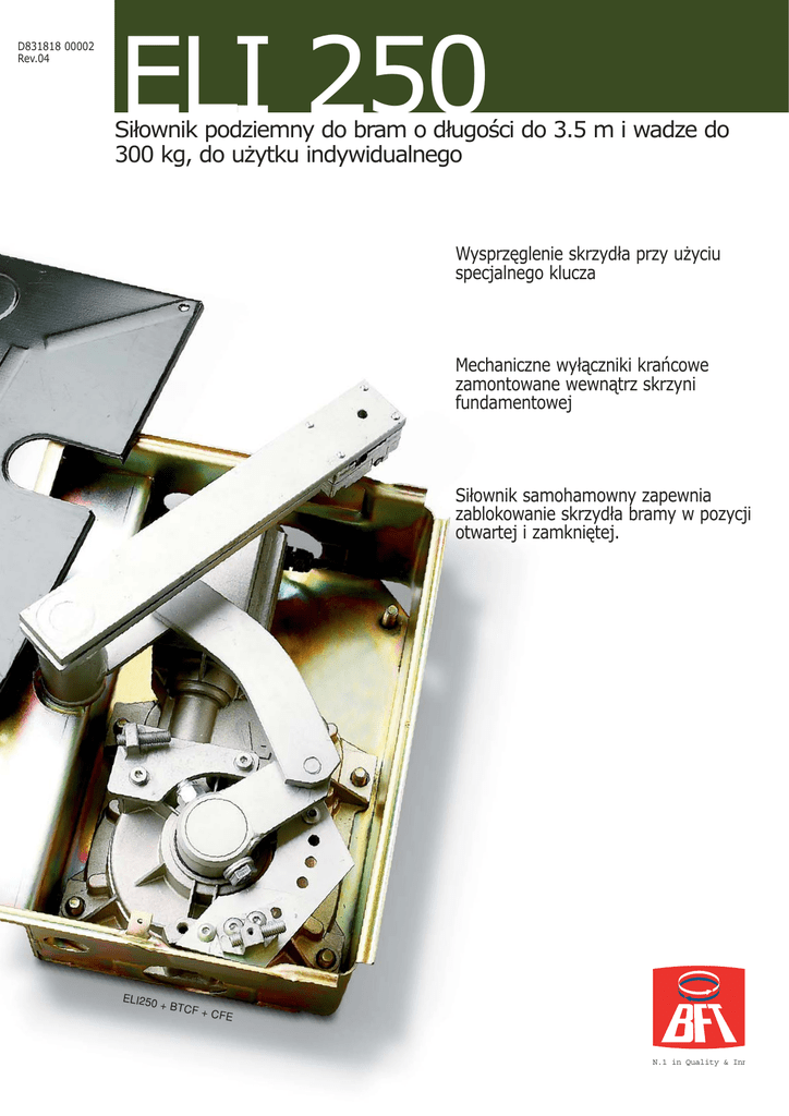 D831818 00002 Rev.04 ELI 250 Siłownik podziemny do bram o długości do 3.5 m i wadze do 300 kg, do użytku indywidualnego Wysprzęglenie skrzydła przy użyciu specjalnego klucza Mechaniczne wyłączniki krańcowe zamontowane wewnątrz skrzyni fundamentowej Siłownik samohamowny zapewnia zablokowanie skrzydła bramy w pozycji otwartej i zamkniętej. ELI250 + BTCF + CFE N.1 in Quality & Inn ELI 250 Siłownik podziemny do bram o długości do 3.5 m i wadze do 300 kg, do użytku indywidualnego 210 Akcesoria 210 336 420 135 • Możliwość zamontowania do każdej bramy skrzydłowej, elektromechaniczne siłowniki ELI 250 montowane pod ziemią, stanowią dolny zawias bramy przez co są praktycznie nie widoczne. Są idealnym rozwiązaniem do bram posiadających wartość artystyczną. • Blokada ruchu, siłowniki ELI 250 są samohamowne co oznacza, że potrafią utrzymać skrzydło otwarte lub zamknięte bez dodatkowych rygli lub elektrozamków. • Wysprzęglenie jest realizowane za pomocą specjalnego mechanizmu obsługiwanego kluczem. • Ustawienie położeń krańcowych realizowane za pomocą wewnętrznych odbojów. • Łatwość obsługi: skrzynia montażowa umożliwia wyjęcie siłownika bez konieczności demontowania skrzydła bramy, a zestaw ramion umożliwia otwarcie skrzydła o kąt 120°. • Skrzynia montażowa ze stali nierdzewnej jest dostępna na zamówienie. • Dostępne są dwie wersje siłowników z o dwóch różnych prędkościach. Dane techniczne Model Zasilanie Pobór mocy Zabezpieczenie termiczne Długość/waga skrzydła ELI 250 230V~ ± 10%, 50Hz 280 W zintegrowane 2.50 m/3000N (~300 kg); 3.50 m/2500N (~250 kg); od -10° do +110° 4.3°/sek. (~28 sek/120°) sprzęgło elektryczne w centrali samohamowny kluczem 100 od -20°C do + 50°C IP 67 100N (~10 kg) patrz rysunek Kąt otwarcia Prędkość Sprzęgło Blokada ruchu Wysprzęglenie Liczba cykli na dobę Temperatura pracy Stopień zabezpieczenia Ciężar Wymiary FE: komplet mechanicznich wyłączników krańcowych do siłownika ELI 250 BTCF 120: Uniwersalna skrzynia montażowa do siłowników Eli 250 w komplecie z dzwigniami. BTCF 120 INOX: Uniwersalna skrzynia montażowa do siłowników Eli 250 w komplecie z dzwigniami. Wykonana ze stali nierdzewnej. ELI 250-V 230V~ ± 10%, 50Hz 280 W zintegrowane 2.00 m/1500N (~150 kg) od -10° do +110° 8.6°/sek. (~14 sek/120°) sprzęgło elektryczne w centrali samohamowny kluczem 100 od -20°C do + 50°C IP 67 100N (~10 kg) patrz rysunek Przykładowa instalacja M siłowniki ELI 250 C skrzynie montażowe BTCF120 do ELI 250 Q centrala sterująca ALTAIR z wbudowanym radioodbiornikiem z kodem zmiennym T piolt dwukanałowy MITTO2 E180: komplet akcesoriów zwiększających kąt otwarcia bramy do 180° lub do bram wymagajacych obrotowych. Ftx-Frx para fotokomórek CELLULA 130 CF para kolumn montażowych CC130 AL lampa sygnalizacyjna LAMPO PA z anteną SL433 S przełącznik kluczykowy INTRO ALTAIR Centrala sterująca do jednego lub dwóch siłowników elektromechanicznych, zasilanych napięciem 230V o mocy 2x300W. Logika 3 i 4 krokowa z obsługą trybu automatycznego i półautomatycznego. Elektroniczna regulacja momentu obrotowego. Funkcja zamknij natychmiast. Rapid closing function. Funkcja furtki, Programowalne zwolnienie drugiego skrzydła przy otwieraniu i zamykaniu. Kompatybilność z systemem EELink. Wbudowany wyświetlacz LCD ułatwiajacy programowanie i wyświetlający ustawienia. Funkcja autodiagnozy i zliczania wykonanych cykli. Możliwość centralnego sterowania centralą. Zintegrowany radioodbiornik z kodem dynamicznie zmiennym o częstotliwości 433.92 MHz z pamiecią 63 kodów. Wyjmowalna listwa zaciskowa ułatwia dokonanie podłączeń i wymianę centrali. AL S W celu dokonania wyceny kompletacji i montażu zgłoś się do naszego partnera handlowego. Q Podane dane techniczne mogą ulec zmianie. BFT zastrzega sobie prawo do dokonywania zmian bez wcześniejszego poinformowania. Fte M C Fre Partner handlowy: T M C Fri Fti CF CF