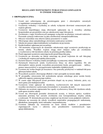 REGULAMIN WEWNĘTRZNY PUBLICZNEGO GIMNAZJUM W GWDZIE WIELKIEJ. I OBOWIĄZKI UCZNIA: 1. Uczeń jest zobowiązany do przestrzegania praw i obowiązków zawartych w regulaminie wewnętrznym szkoły. 2. Uczniowie wchodzą i wychodzą ze szkoły wyłącznie drzwiami oznaczonymi jako wejście główne. 3. Uczniowie dojeżdżający mają obowiązek zgłaszania się w świetlicy szkolnej bezpośrednio po przyjeździe oraz po zakończeniu zajęć lekcyjnych. 4. Zwolnienie z zajęć świetlicowych następuje wyłącznie na pisemny wniosek rodziców. Pozostałe sytuacje traktowane są jako nieobecność nieusprawiedliwiona. 5. Okrycie wierzchnie oraz obuwie należy pozostawić w szatni. 6. Obowiązuje zakaz samodzielnego otwierania szatni przez uczniów. 7. Szkoła nie ponosi odpowiedzialności za kradzieże na jej terenie. 8. Każda kradzież zgłaszana jest na policję. 9. Od momentu rozpoczęcia do momentu zakończenia zajęć uczniowie przebywają na terenie szkoły. Wszelkie wyjścia mogą mieć miejsce tylko po zwolnieniu u wychowawcy lub dyrektora szkoły na pisemną prośbę rodzica. 10. Przed zajęciami uczniowie ustawiają teczki przed klasą lekcyjną. 11. Uczniowie po dzwonku na lekcję ustawiają się przed wejściem do sali lekcyjnej i wchodzą do wnętrza pod opieką nauczyciela. 12. Dyżurni klasowi wchodzą ostatni porządkując wyznaczony odcinek korytarza. 13. Dyżurnych klasowych ustala wychowawca klasy na okres tygodnia. Do ich obowiązków należy przede wszystkim przyniesienie kredy, przygotowanie tablicy, pomoc nauczycielowi w przygotowaniu materiałów dydaktycznych. 14. Uczniom nie wolno biegać po korytarzu i bez potrzeby przebywać w toaletach lub poza głównym holem szkoły. 15. Wszystkich uczniów obowiązuje dbałość o ład i porządek na terenie szkoły. 16. W przypadku zniszczenia lub uszkodzenia sprzętu szkolnego przez ucznia koszty całkowite naprawy ponoszą jego rodzice. 17. W czasie zajęć lekcyjnych uczeń powinien skupić się na pracy. Jedzenie, picie, czy żucie gumy jest niedopuszczalne. 18. Uczniowie winni zgłaszać do dyrektora, wychowawców lub innych nauczycieli wszelkie niewłaściwe zachowania rówieśników w stosunku do nich. 19. Zabrania się uczniom zapraszania bez zgody wychowawcy klasy lub dyrektora szkoły osób spoza uczniów szkoły. 20. Uczeń ma obowiązek posiadać dzienniczek ucznia, w którym oprócz wyników nauczania powinny być zawarte zwolnienia oraz korespondencja między szkołą a rodzicami. W dzienniczku powinny znajdować się również wzory podpisów rodziców. 21. Zabrania się noszenia do szkoły wszelkich materiałów propagujących narkomanię, alkoholizm, pornografię, treści seksualne i nacjonalistyczne. 22. Uczniom zabrania się wnoszenia na teren szkoły środków i przedmiotów zagrażających życiu i zdrowiu oraz przedmiotów wartościowych typu sprzęt elektroniczny. 1 II WYGLĄD ZEWNĘTRZNY UCZNIA 1. Każdy uczeń ma obowiązek: dbać o schludny, estetyczny wygląd, przestrzegać zasad higieny osobistej. 2. Na terenie szkoły uczniowie chodzą bez nakrycia głowy. 3. Ze względu na bezpieczeństwo uczniów zabrania się noszenia na szyi tzw. smyczy z kluczami. 4. Biżuteria - skromna i bezpieczna: kilka pierścionków, kolczyki (tylko po jednym w każdym uchu - dziewczęta), ewentualnie łańcuszek, (bez symboli nie akceptowanych społecznie). 5. Uczniom bezwzględnie zabrania się: farbowania, koloryzowania włosów, na terenie szkoły obowiązuje prosta, estetyczna fryzura; włosy długie powinny być związane lub spięte, stosowania makijażu, malowania paznokci, noszenia długich włosów przez chłopców / włosy krótkie, co najwyżej do połowy ucha, noszenia kolczyków w pępku, języku, nosie, brwiach i innych częściach ciała (oprócz uszu), noszenia spódniczek mini, noszenia butów na wysokim obcasie, noszenia bluzek z dużym dekoltem, posiadania długich paznokci, w szkole zabrania się noszenia obuwia używanego na zewnątrz szkoły. strój przeznaczony na lekcje wychowania fizycznego określony jest przez nauczyciela prowadzącego, 6. Zasady noszenia stroju. strój galowy obowiązuje: - w uroczyste dni apelowe, uroczystości szkolne, międzyszkolne strój codzienny obowiązuje: - każdego dnia z wyjątkiem w/w dni oraz podczas wycieczek i dyskotek szkolnych. obowiązujący ubiór w szkole - stosowny, bez ekstrawagancji, czysty, zasłaniający tułów i uda, niewyzywający, bez nakrycia głowy. OBOWIĄZUJĄCY UBIÓR DAMSKI: sweterek zakrywający całkowicie plecy i brzuch, bluzka z rękawkami zakrywająca całkowicie plecy i brzuch, spódniczki lub spodnie przynajmniej do kolan, spodnie zakrywające dolną część pleców i brzucha, buty na płaskiej podeszwie. STRÓJ GALOWY DAMSKI: biała bluzka z kołnierzykiem typu koszulowego, spódnica lub sukienka czarna ewentualnie granatowa zakrywająca uda, spodnie czarne lub granatowe zakrywające uda,, 2 OBOWIĄZUJĄCY UBIÓR MĘSKI: - schludny sweterek lub bluza, - gładkie spodnie w kolorze dowolnym, stonowanym STRÓJ GALOWY MĘSKI: - biała bluzka z kołnierzykiem typu koszulowego, - spodnie długie czarne lub granatowe 7. Do kontroli wyglądu zewnętrznego uczniów upoważnieni są: wychowawcy klas /systematycznie , pedagog szkolny i pozostali nauczyciele /doraźnie , dyrektor szkoły /doraźnie. 8. Nauczyciele poszczególnych przedmiotów mają prawo do zwracania uwagi uczniom, jeżeli ich wygląd odbiega od ustaleń szkoły i mają obowiązek zgłaszania tego faktu wychowawcom klas. 9. Wychowawcy klas mają obowiązek informowania rodziców / prawnych opiekunów o nieprzestrzeganiu przez ich dzieci ustalonych przez szkołę zasad. 10. Wygląd zewnętrzny ucznia nie ma wpływu na ocenę z przedmiotów, ma jednak wpływ na ustalenie uczniowi oceny zachowania. III OBUWIE ZMIENNE W SZKOLE 1. W budynku szkoły, uczniów obowiązuje obuwie zmienne. 2. Po szkole uczniowie powinni chodzić przez cały rok szkolny w obuwiu bezpiecznym. 3. Uczniow