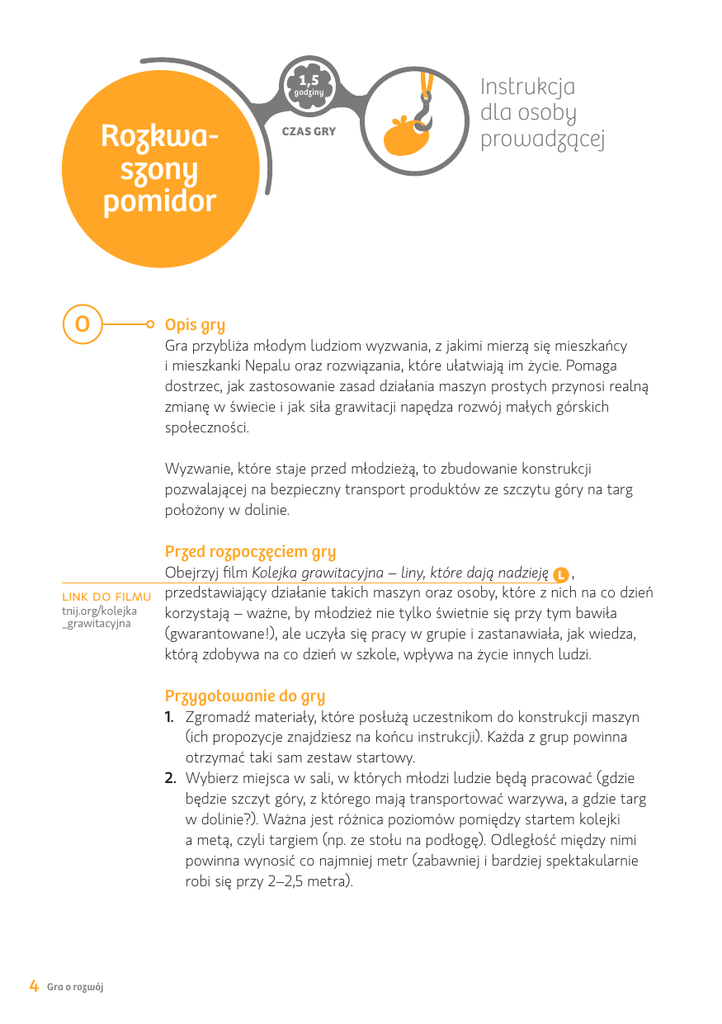 1,5 godziny Rozkwaszony pomidor O Czas gry Instrukcja dla osoby prowadzącej Opis gry Gra przybliża młodym ludziom wyzwania, z jakimi mierzą się mieszkańcy i mieszkanki Nepalu oraz rozwiązania, które ułatwiają im życie. Pomaga dostrzec, jak zastosowanie zasad działania maszyn prostych przynosi realną zmianę w świecie i jak siła grawitacji napędza rozwój małych górskich społeczności. Wyzwanie, które staje przed młodzieżą, to zbudowanie konstrukcji pozwalającej na bezpieczny transport produktów ze szczytu góry na targ położony w dolinie. Przed rozpoczęciem gry Obejrzyj film Kolejka grawitacyjna – liny, które dają nadzieję L , link do filmu przedstawiający działanie takich maszyn oraz osoby, które z nich na co dzień tnij.org/kolejka korzystają – ważne, by młodzież nie tylko świetnie się przy tym bawiła _grawitacyjna (gwarantowane!), ale uczyła się pracy w grupie i zastanawiała, jak wiedza, którą zdobywa na co dzień w szkole, wpływa na życie innych ludzi. Przygotowanie do gry 1. Zgromadź materiały, które posłużą uczestnikom do konstrukcji maszyn (ich propozycje znajdziesz na końcu instrukcji). Każda z grup powinna otrzymać taki sam zestaw startowy. 2. Wybierz miejsca w sali, w których młodzi ludzie będą pracować (gdzie będzie szczyt góry, z którego mają transportować warzywa, a gdzie targ w dolinie?). Ważna jest różnica poziomów pomiędzy startem kolejki a metą, czyli targiem (np. ze stołu na podłogę). Odległość między nimi powinna wynosić co najmniej metr (zabawniej i bardziej spektakularnie robi się przy 2–2,5 metra). 4 Gra o rozwój Przebieg gry 1. Opisz ogólnie grę i wprowadź młodzież w jej świat. Opowiedz o sytuacji w Nepalu (tereny wysokogórskie, nie ma dróg, towary trzeba nosić w koszach na plecach – to wyzwanie dla zdrowia i życia, jest czasochłonne i mało efektywne). 2. Młodzi ludzie wcielają się w Nepalczyków/Nepalki – mieszkają w górach, próbują znaleźć wyjście z trudnej sytuacji. 3. Przedstaw cel gry: • Zbudowanie, przy wykorzystaniu wyłącznie dostarczonych materiałów, konstrukcji, która pozwoli na bezpieczny transport produktów z góry na dół, bez potrzeby ich znoszenia przez ludzi na plecach. 4. Przedstaw zasady gry: • Każda grupa ma 40 minut na zbudowanie maszyny. • Następnie odbywa się próba. • Jeśli któryś z zespołów skończy przed czasem, może przeprowadzić dodatkowe testy przed ostateczną próbą. • Towar nie może wypadać z koszyka podczas transportu, nie można go też podtrzymywać (w rzeczywistości to by się zupełnie nie sprawdziło). • Warzywa powinny zjeżdżać w kontrolowany sposób (aby uniknąć zmiażdżenia na mecie, czyli na targu). • W zaawansowanej wersji gry możesz dodatkowo poprosić o opracowanie systemu pozwalającego na wciągnięcie kosza z powrotem na górę. • Zaznacz, że o zaliczeniu zadania zdecyduje nie tyle przetransportowanie produktów z góry na dół, co umiejętność wytłumaczenia, dlaczego konstrukcja zadziałała (lub nie). 5. Przekaż grupom kartki z zasadami gry L . 6. Po 40 minutach przejdźcie do testowania maszyn. Dopytaj każdą z grup, dlaczego ich model działa lub dlaczego nie działa, co można poprawić. Podsumowanie 1. Po zaprezentowaniu wszystkich konstrukcji pogratuluj zespołom (brawa!), usiądźcie w kręgu i omówcie grę. P link do instrukcji dla grup tnij.org/ karta_pomidor • Proponowane pytania • Jak się czujecie po wykonaniu zadania? • Jak wam się pracowało w grupie (co było łatwe, a co trudne)? • Co zadziałało w pracy zespołowej? • Czy dostrzegacie głębszy sens tej gry? • Jakie znaczenie ma wykorzystywanie wiedzy w praktyce? • Co zmienia – w tym przypadku – zastosowanie maszyn prostych i sił grawitacji? • Co zyskują mieszkańcy wiosek, w których są kolejki grawitacyjne? 5 2. Przeprowadź ewaluację zajęć (np. każda uczestniczka/każdy uczestnik odpowiada pisemnie na następujące pytania, a na forum klasy dzieli się jedną, wybraną myślą): Proponowane pytania • Czego się dziś nauczyłam/nauczyłem? • Z jaką miną kończę zajęcia? • Co z tego, co działo się w trakcie gry, mogę wykorzystać w swoim życiu? + link do filmu tnij.org/kolejka _grawitacyjna M Chcecie więcej? Po podsumowaniu możesz wyświetlić film o kolejce grawitacyjnej, z której w rzeczywistości korzystają mieszkańcy i mieszkanki górskich terenów Nepalu. L Materiały Do zbudowania prototypów maszyn będą potrzebne: • przedmioty, które pozwolą stworzyć szkielet lub kosz do transportu • przedmioty, które umożliwią doczepienie kosza i konstrukcji do krążków, trybików, bloczków, ramp – by cała maszyna mogła zadziałać • materiały do klejenia i łączenia • lina do transportu. Propozycje materiałów do wykorzystania • klocki typu Lego • opakowania po produktach spożywczych • zestawy zabawkowe typu Młody Technik • rurki • opakowania po płytach CD, szpulki z nićmi • spinacze • taśma klejąca • gazety • siatka plastikowa • linijki • nożyczki • karton • kubeczki papierowe • pudełka • makaron spaghetti • powierzchnie o różnej fakturze • sznurki, liny, taśmy • pomidory czy inne miękkie warzywa/owoce do przetransportowania. L 6 Gra o rozwój link do całej aktywności na stronie ceo globalna.ceo.org.pl/fizyka-biologia/scenariusze-i-gry/rozkwaszony-pomidor