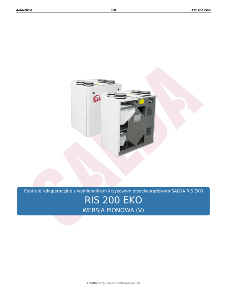 4-06-2014 1/8 RIS 200 EKO Centrale rekuperacyjne z wymiennikiem krzyżowym przeciwprądowym SALDA RIS EKO RIS 200 EKO WERSJA PIONOWA (V) źródło: http://salda.centrumklima.pl/ 4-06-2014 2/8 RIS 200 EKO Opis Centrale wentylacyjne RIS EKO wyposażone są w wysokowydajny przeciwprądowy wymiennik ciepła. Jednostki służą do wentylacji domów oraz innych ogrzewanych pomieszczeń. Ten model produktu może być sterowany za pomocą sterowników TPC, Stouch i Flex. • Ciche i wydajne wentylatory EC. • Sprawność wymiennika ciepła: do 90%. • Opcjonalna kanałowa nagrzewnica elektryczna lub wodna. • Sterowanie przepływem powietrza. • Sterowanie temperaturą powietrza doprowadzanego. • BY-PASS z siłownikiem. • Ochrona przeciwzamarzaniowa wymiennika ciepła. • Niski poziom hałasu. • Izolacja akustyczna ścian: 30 mm. • Szybki i łatwy montaż. • Całkowicie zintegrowany system sterowania typu plug&play. • Sterowanie nagrzewnicą elektryczną: 0-10V. • Opcjonalny przetwornik CO2, ciśnienia lub wilgotności. źródło: http://salda.centrumklima.pl/ 4-06-2014 3/8 RIS 200 EKO Dane techniczne Wersja z nagrzewnicą elektryczną RIS 200 VE EKO Wydajność/spręż [m³/h]/[Pa] Nagrzewnica wodna (opcja) Wentylatory EC - wywiew - nawiew EKA NIS 125-0,9-1f - faza, napięcie [50Hz/V] ~1, 230 - moc/prąd [kW/A] - prędkość wentylatora [min ] 4480 - moc/prąd [kW/A] 0,057/0,47 - prędkość wentylatora [min-1] 4480 -1 Sprawność cieplna Maks. zużycie energii 200/130 0,057/0,47 90% [kW/A] Płyta sterująca 0,12/0,95 PRV V2.2 Klasa filtra wywiewnego G4 Klasa filtra nawiewnego M5 Izolacja cieplna [mm] Kolor (RAL) Waga netto 9016 [kg] Zgodność z ERP 44,7 2013; 2015 Eksploatacja Zakres temperatury pracy 30 w pomieszczeniu [°C] Stopień ochrony obudowy -5 ... +40 IP-34 źródło: http://salda.centrumklima.pl/ 4-06-2014 4/8 RIS 200 EKO Wersja z nagrzewnicą wodną RIS 200 VW EKO Wydajność/spręż [m³/h]/[Pa] Nagrzewnica wodna (opcja) Wentylatory EC - wywiew - nawiew AVS 125 - faza, napięcie [50Hz/V] ~1, 230 - moc/prąd [kW/A] - prędkość wentylatora [min ] 4480 - moc/prąd [kW/A] 0,057/0,47 - prędkość wentylatora [min-1] 4480 -1 Sprawność cieplna Maks. zużycie energii 200/130 0,057/0,47 90% [kW/A] Płyta sterująca 0,12/0,95 PRV V2.2 Klasa filtra wywiewnego G4 Klasa filtra nawiewnego M5 Izolacja cieplna [mm] Kolor (RAL) Waga netto 9016 [kg] Zgodność z ERP 44,7 2013; 2015 Eksploatacja Zakres temperatury pracy 30 w pomieszczeniu [°C] Stopień ochrony obudowy -5 ... +40 IP-34 źródło: http://salda.centrumklima.pl/ 4-06-2014 5/8 RIS 200 EKO Charakterystyka akustyczna Całkowite Lwa dB(A) Lwa, dB(A) 125 Hz 250 Hz 500 Hz 1 kHz 2 kHz 4 kHz 8 kHz Wlot 68 59 61 63 62 60 53 43 Wylot 59 50 52 56 50 44 38 29 Do otoczenia 50 41 42 44 42 40 34 30 Pomiar przy 218 m³/h, 100 Pa Wydajność/spręż - wartości mierzone w punkcie pracy. Sprawność cieplna obliczana zgodnie z normą EN 13141-7. Dla temperatur niższych niż zalecane należy użyć nagrzewnicy wstępnej, by zapewnić zrównoważoną eksploatację. Poziomy mocy akustycznej zostały ustalone zgodnie z normą DIN 45635 i/lub ISO 3744 w odległości 1 m od urządzenia. źródło: http://salda.centrumklima.pl/ 4-06-2014 6/8 RIS 200 EKO Wymiary L W H ØD F 410 mm 595 mm 716 mm 125 mm 30 mm źródło: http://salda.centrumklima.pl/ 4-06-2014 7/8 Schematy funkcyjne Wersja z nagrzewnicą elektryczną A - powietrze zewnętrzne B - powietrze nawiewane C - powietrze wywiewane D - powietrze odprowadzane na zewnątrz EKA NIS - nagrzewnica elektryczna (opcja) EKA NV PH - wstępna nagrzewnica elektryczna (opcja) IV - wentylator wywiewny PV - wentylator nawiewny PR - krzyżowy przeciwprądowy wymiennik ciepła PF - filtr nawiewny IF - filtr wyciągowy M1 - siłownik przepustnicy by-pass TJ - czujnik temperatury powietrza nawiewanego TL - czujnik temperatury powietrza zewnętrznego TE - czujnik temperatury powietrza wywiewanego DTJ 100.1 - czujnik wilgotności i temperatury M1 - siłownik przepustnicy by-pass źródło: http://salda.centrumklima.pl/ RIS 200 EKO 4-06-2014 8/8 Wersja z nagrzewnicą wodną A - powietrze zewnętrzne B - powietrze nawiewane C - powietrze wywiewane D - powietrze odprowadzane na zewnątrz AVS - nagrzewnica montowana na kanale (opcja) EKA NV PH - wstępna nagrzewnica elektryczna (opcja) IV - wentylator wywiewny PV - wentylator nawiewny PR - krzyżowy przeciwprądowy wymiennik ciepła PF - filtr nawiewny IF - filtr wyciągowy TJ - czujnik temperatury powietrza nawiewanego TL - czujnik temperatury powietrza zewnętrznego DTJ 100.1 - czujnik wilgotności i temperatury M1 - siłownik przepustnicy by-pass M6 - dodatkowy zawór mieszający i siłownik (opcja) TV - czujnik przeciwzamrożeniowy T1 - termostat przeciwzamrożeniowy źródło: http://salda.centrumklima.pl/ RIS 200 EKO