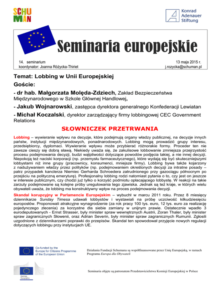 Seminaria europejskie 14. seminarium koordynator: Joanna Różycka-Thiriet 13 maja 2015 r. [email protected] Temat: Lobbing w Unii Europejskiej Goście: - dr hab. Małgorzata Molęda-Zdziech, Zakład Bezpieczeństwa Międzynarodowego w Szkole Głównej Handlowej, - Jakub Wojnarowski, zastępca dyrektora generalnego Konfederacji Lewiatan - Michał Koczalski, dyrektor zarządzający firmy lobbingowej CEC Government Relations SŁOWNICZEK PRZETRWANIA Lobbing – wywieranie wpływu na decyzje, które podejmują organy władzy publicznej, na decyzje innych państw, instytucji międzynarodowych, ponadnarodowych. Lobbing mogą prowadzić grupy interesu, przedsiębiorcy, dyplomaci. Wywieranie wpływu może przybierać różnorakie formy. Proceder ten nie zawsze cieszy się dobrą sławą. Niekiedy uważa się, że zakulisowe lobbowanie zmniejsza przejrzystość procesu podejmowania decyzji, budzi wątpliwości dotyczące powodów podjęcia takiej, a nie innej decyzji. Niepokoją też naciski korporacji (np. przemysłu farmaceutycznego), które wydają się być skuteczniejszymi lobbystami niż inne grupy (pracownicy, konsumenci, mniejsze firmy). Lobbing bywa także kojarzony z nadużywaniem władzy przez polityków (np. podejmowaniem określonych decyzji za intratne posady – patrz przypadek kanclerza Niemiec Gerharda Schroedera zatrudnionego przy gazociągu północnym po przejściu na polityczną emeryturę). Profesjonalny lobbing rodzi natomiast pytania o to, czy jest on jeszcze w interesie publicznym, czy chodzi już tylko o korzyść podmiotu opłacającego lobbystę. W reakcji na takie zarzuty podejmowane są kolejne próby uregulowania tego zjawiska. Jednak są też kraje, w których wielu obywateli uważa, że lobbing ma konstruktywny wpływ na proces podejmowania decyzji. Skandal korupcyjny w Parlamencie Europejskim – wybuchł w marcu 2011 roku. Przez 8 miesięcy dziennikarze Sunday Timesa udawali lobbystów i wystawiali na próbę uczciwość kilkudziesięciu europosłów. Proponowali atrakcyjne wynagrodzenie (za rok pracy 100 tys. euro, 12 tys. euro za realizację pojedynczego zlecenia) za korzystne dla siebie zamiany w unijnym prawie. Ostatecznie wpadło 3 eurodeputowanych - Ernst Strasser, były minister spraw wewnętrznych Austrii, Zoran Thaler, były minister spraw zagranicznych Słowenii, oraz Adrian Severin, były minister spraw zagranicznych Rumunii. Zgłosili uzgodnione z dziennikarzami poprawki do przepisów. Skandal ten spowodował przyjęcie nowych regulacji dotyczących lobbingu przy instytucjach UE. Działania Fundacji Schumana są współfinansowane przez Unię Europejską, w ramach Programu Europa dla Obywateli Seminaria objęte są patronatem Przedstawicielstwa Komisji Europejskiej w Polsce Rejestr służący przejrzystości (Transparency Registery) – wspólny wykaz lobbystów stworzony przez Parlament Europejski i Komisję Europejską z połącznia ich osobnych rejestrów. Dzięki niemu jawne mają być informacje o tym, jakie osoby i podmioty wpływają na unijne decyzje. Rejestr powstał w 2011 roku. Aktualnie działa w oparciu o porozumienie między Komisją a Parlamentem z kwietnia 2014 roku. Częścią rejestru jest kodeks postępowania. Obliguje on lobbystę, by zawsze się przedstawiał i podawał nazwę podmiotów, dla których pracuje, deklarował, jakie promuje cele czy interesy. Ma się także zachowywać przyzwoicie – nie uzyskiwać informacji lub decyzji w nieuczciwy sposób lub za pomocą niewłaściwego nacisku lub niewłaściwego postępowania. Jest jedno ale - rejestracja w rejestrze nie jest obowiązkowa. Jednak zapisanie się w rejestrze jest warunkiem uzyskania przepustki do Parlamentu Europejskiego. Bruksela to wraz z Waszyngtonem największe skupisko lobbystów. Ich łączną liczbę w belgijskiej stolicy Lobbyści zarejestrowani przy instytucjach UE, źródło: http://ec.europa.eu/transparencyregister szacuje się na kilkanaście tysięcy. FRAZA DNIA W trakcie wykonywania mandatu posłowie do Parlamentu Europejskiego: (a) kierują się następującymi ogólnymi zasadami i postępują zgodnie z nimi: bezinteresowność, uczciwość, otwartość, staranność, rzetelność, odpowiedzialność i poszanowanie reputacji Parlamentu, (b) działają wyłącznie w interesie publicznym i nie czerpią ani też nie próbują czerpać jakichkolwiek bezpośrednich lub pośrednich korzyści finansowych lub jakichkolwiek innych gratyfikacji - fragment Kodeksu postępowania posłów do Parlamentu Europejskiego w zakresie interesów finansowych i konfliktu interesów przyjętego pod grudniu 2011 roku. Kodeks jest załącznikiem do Regulaminu Parlamentu Europejskiego. Precyzuje, jak eurodeputowany ma się zachować w przypadku konfliktu interesów. Zobowiązuje europosłów do składania oświadczeń majątkowych. Zabrania przyjmowania przez parlamentarzystów prezentów, których wartość przekracza 150 euro. Postanowienia te doprecyzowują jeszcze przepisy wykonawcze Prezydium Parlamentu Europejskiego z 2013 roku. JAK TO SIĘ JE, CZYLI O ZWYCZAJACH Dzień Europy – obchodzony w Unii Europejskiej 9 maja, w rocznicę ogłoszenia planu Schumana. Robert Schuman, ówczesny minister spraw zagranicznych Francji, wygłosił w Salonie Zegarowym francuskiego MSZ deklarację, która stała się fundamentem integracji europejskiej. Decyzję o ustanowieniu Dnia Europy podjęła w 1985 roku Rada Europejska - szefowie państw i rządów krajów UE zebrani w Mediolanie. Z okazji Dnia Europy unijne instytucje położone w Brukseli, Strasburgu i Luksemburgu organizują różne wydarzenia, m.in. Dni Otwartych Drzwi. Obchody odbywają się także w domu Schumana w Scy-Chazelles i wielu innych miejscach. W Warszawie Dzień Europy to oczywiście Parada Schumana. Działania Fundacji Schumana są współfinansowane przez Unię Europejską, w ramach Programu Europa dla Obywateli Seminaria objęte są patronatem Przedstawicielstwa Komisji Europejskiej w Polsce