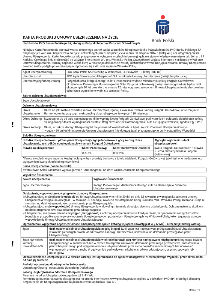 KARTA PRODUKTU UMOWY UBEZPIECZENIA NA ŻYCIE dla klientów PKO Banku Polskiego SA, którzy są Pożyczkobiorcami Pożyczek Gotówkowych Niniejsza Karta Produktu nie stanowi wzorca umownego ani też części Warunków Ubezpieczenia dla Pożyczkobiorców PKO Banku Polskiego SA obejmujących warunki ubezpieczenia na życie, uchwalonych przez Ubezpieczyciela w dniu 30 sierpnia 2016 r. (dalej WU) ani integralnej części Umowy Ubezpieczenia. Karta Produktu została przygotowana wyłącznie w celach informacyjnych, nie stanowi oferty w rozumieniu art. 66 i art. 71 Kodeksu Cywilnego i nie może służyć do wiążącej interpretacji WU oraz Wniosko-Polisy. Szczegółowe i wiążące informacje znajdują się w WU oraz Umowie Ubezpieczenia. Terminy napisane wielką literą w niniejszym dokumencie zostały zdefiniowane w WU. Decyzja o zawarciu Umowy Ubezpieczenia powinna zostać podjęta po wcześniejszym zapoznaniu się z WU oraz zapisami Wniosko-Polisy. Agent Ubezpieczeniowy: PKO Bank Polski SA z siedzibą w Warszawie, ul. Puławska 15 (dalej PKO BP) Ubezpieczyciel: PKO Życie Towarzystwo Ubezpieczeń S.A. w zakresie Umowy Ubezpieczenia (dalej Ubezpieczyciel) Ubezpieczający/Ubezpieczony: Pożyczkobiorca, który ukończył 18 lat i jednocześnie w dacie zakończenia spłaty Pożyczki Gotówkowej, określonej w Pierwotnym Harmonogramie Spłat Pożyczki Gotówkowej (dalej Harmonogram) nie będzie miał ukończonych 70 lat oraz który w okresie 12 miesięcy przed zawarciem Umowy Ubezpieczenia nie chorował na schorzenia wymienione w pkt 6.3 Wniosko-Polisy. Zakres ochrony ubezpieczeniowej: Zgon Ubezpieczonego Ochrona ubezpieczeniowa: Okres ubezpieczenia Okres na jaki została zawarta Umowa Ubezpieczenia, zgodny z okresem trwania umowy Pożyczki Gotówkowej wskazanym w Harmonogramie, przy czym maksymalny okres ubezpieczenia wynosi 120 miesięcy Okres Ochrony Rozpoczyna się od dnia następnego po dniu wypłaty kwoty Pożyczki Gotówkowej pod warunkiem opłacenia składki oraz kończy się najpóźniej z dniem wymagalności ostatniej Raty określonej w Harmonogramie, o ile nie upłynie wcześniej zgodnie z § 5 WU Okres karencji Okres, w trakcie którego Ubezpieczyciel nie ponosi odpowiedzialności z tytułu zajścia Zdarzenia Ubezpieczeniowego: • zgon - 30 dni od dnia zawarcia Umowy Ubezpieczenia (nie dotyczy, jeżeli przyczyną zgonu był Nieszczęśliwy Wypadek) Składka Ubezpieczeniowa: Składka Ubezpieczeniowa - płatna przez Ubezpieczającego jednorazowo, z góry za cały okres ubezpieczenia, ze środków udostępnionych w ramach Pożyczki Gotówkowej Stawka za ubezpieczenie Klient Podstawowy Klient Bankowości Osobistej Algorytm wyliczenia składki ubezpieczeniowej kwota Pożyczki Gotówkowej* × stawka × liczba miesięcy trwania Pożyczki 0,237% 0,1429% Gotówkowej *Kwota uwzględniająca wszelkie koszty i opłaty, w tym prowizję bankową z tytułu udzielenia Pożyczki Gotówkowej, jeżeli jest ona kredytowana, z wyłączeniem kwoty składki ubezpieczeniowej. Suma Ubezpieczenia (zwana dalej SU): Kwota równa Saldu Zadłużenia wynikającemu z Harmonogramu na dzień zajścia Zdarzenia Ubezpieczeniowego Wysokość Świadczenia: Zakres ubezpieczenia Zgon Ubezpieczonego Wysokość Świadczenia Iloczyn Pierwotnego Udziału Procentowego i SU na Dzień zajścia Zdarzenia Ubezpieczeniowego Odstąpienie, wypowiedzenie, wystąpienie z Umowy Ubezpieczenia: • Ubezpieczający może pisemnie odstąpić od Umowy Ubezpieczenia w terminie 30 dni od dnia jej zawarcia, a w przypadku zawarcia Umowy Ubezpieczenia w trybie na odległość – w terminie 30 dni od jej zawarcia raz otrzymania Karty Produktu, WU i Wniosko-Polisy. Ochrona ustaje ze skutkiem na dzień otrzymania ww. oświadczenia przez Ubezpieczyciela. • Ubezpieczający może wypowiedzieć Umowę Ubezpieczenia w dowolnym terminie składając pisemne oświadczenie. Ochrona ustaje ze skutkiem na dzień otrzymania ww. oświadczenia przez Ubezpieczyciela. • Ubezpieczony ma prawo pisemnie wystąpić (zrezygnować) z ochrony ubezpieczeniowej w każdym czasie, bez ponoszenia żadnych kosztów. Jednakże w przypadku zgodnego oświadczenia Ubezpieczającego i pozostałych Ubezpieczonych we Wniosko-Polisie, taka rezygnacja oznacza wypowiedzenie Umowy Ubezpieczenia przez Ubezpieczającego. Ograniczenia i wyłączenia odpowiedzialności Ubezpieczyciela (pełen katalog wyłączeń zawarty jest w § 6 WU) – niżej przykładowy katalog: Zgon Brak odpowiedzialności Ubezpieczyciela między innymi, jeżeli zgon jest następstwem próby samobójczej Ubezpieczonego w okresie pierwszych dwóch lat od zawarcia Umowy Ubezpieczenia, usiłowania lub dokonania przestępstwa przez Ubezpieczonego Brak odpowiedzialności Ubezpieczyciela w okresie karencji, gdy NW jest następstwem między innymi: czynnego udziału Ubezpieczonego w zamieszkach lub w aktach terroryzmu, usiłowania dokonania przez niego przestępstwa, pozostawania przez Ubezpieczonego pod wpływem alkoholu lub prowadzenia przez niego pojazdów mechanicznych bez uprawnień wymaganych prawem o ruchu drogowym lub pod wpływem alkoholu, środków odurzających, psychotropowych lub narkotyków Odpowiedzialność Ubezpieczyciela w okresie karencji jest ograniczona do zgonu w następstwie Nieszczęśliwego Wypadku przez okres 30 dni od dnia jej zawarcia Podmiot uprawniony do otrzymania Świadczenia: Uposażony Główny i ewentualnie Uposażony Dodatkowy Zasady i tryb zgłaszania Zdarzenia Ubezpieczeniowego: Pisemnie na adres Ubezpieczyciela, zgodnie z § 9-11 WU. Formularz zgłoszenia roszczenia dostępny jest na stronie internetowej www.pkoubezpieczenia.pl lub w oddziałach PKO BP i może być składany bezpośrednio do Ubezpieczyciela lub za pośrednictwem oddziałów PKO BP. Zgon NW (okres karencji), Inwalidztwo NW Strona 1/2 Zasady i tryb zgłaszania oraz rozpatrywania reklamacji, skarg i zażaleń: Reklamacje i skargi lub zażalenia można kierować osobiście, pisemnie, telefonicznie lub za pośrednictwem