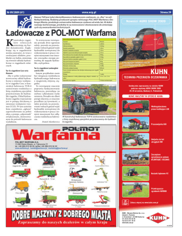 Nr 09/2009 (61) www.wrp.pl Strona 29 Nazwa TUR jest tyleż identyfikowana z ładowaczem czołowym, co „flex” ze szlifierką kontową. Rodzimy producent sprzętu rolniczego POL-MOT Warfama z Dobrego Miasta, produkuje uniwersalne ładowacze czołowe od wielu lat. W dobie rozwoju technicznego, produkty te są nowoczesne i dostosowane do zmieniających się uwarunkowań technicznych. Ładowacze z POL-MOT Warfama K onstrukcje ciągników rolniczych zmieniają się bardzo dynamicznie. Zagłębiając się w zagadnienie można zauważyć, że wraz z ewolucjami silników, przekładni czy kabin, zmieniają się również układy hydrauliczne w ciągnikach rolniczych. Tur-8 z ciągnikiem Case seria Maxxum Aby w pełni wykorzystać nowoczesny układ hydrauliczny o zmienne wydajności w ciągniku Case, w konstrukcji ładowacza TUR-8 zastosowano rozdzielacz z linią czujnikową specjalnie przystosowany do hydrauliki ciągnika. Układ hydrauliczny ciągnika wyposażony jest w pompę tłoczkową o zmiennej wydajności (system CCLS). W tym systemie linia czujnikowa „zgłasza” zapotrzebowanie na pobór oleju, a pompa „odpowiada” zwiększonym, dostosowanym do potrzeb ładowacza wydatkiem. To nowoczesne rozwiązanie posiada dwie ogromne zalety: pozwala na pozostawienie wolnych gniazd wyjść hydrauliki zewnętrznej do wykorzystania w pracy z innymi maszynami oraz znacznie oszczędza energię potrzebną do napędu hydrauliki, czyli paliwo. Tur-6 z ciągnikiem Lamborghini serii R.3 EVO Innym przykładem może być integracja rozdzielacza hydraulicznego ładowacza z magistralą olejową ciągnika. To rozwiązanie znacznie poprawia funkcjonowanie ładowacza, pozwalając na szybsze i płynniejsze ruchy ramienia. Ponadto nie dławi pompy olejowej, co znacznie przedłuża jej żywotność, a także pozwala na pozostawienie wolnych gniazd wyjść hydrauliki zewnętrznej do wykorzystania w pracy z innymi maszynami bez odłączania rozdzielacza ładowacza. Daniel Alankiewicz Dane techniczne ładowacza TUR 8 Parametr Typ ładowacza Udźwig nominalny Wysokość podnoszenia Wysokość wyładunku narzędzia Głębokość opuszczenia dolnej krawędzi narzędzia Masa ładowacza bez narzędzia roboczego i przeciwciężaru Masa łyżki do materiałów sypkich (1,8 m) Pojemność łyżki do materiałów sypkich (1,8 m) Masa przeciwciężaru bez balastu Masa przeciwciężaru z balastem Minimalne ciśnienie oleju Minimalna wydajność pompy Poziom dźwięku ładowacza (bez dźwięku emitowanego przez ciągnik) nie przekracza Obsługa Wymiary ładowacza z ramką szybkomocującą: długość, szerokość, wysokość Optymalna moc ciągnika Wartość czołowy 1650 kg 3,90 m 3,50 m 0,16 m 700 kg 150 kg 0,7 m³ 90 kg 700 kg 16 MPa 40l/min 70 dB 1 osoba 3,3 m, 1,2 m, 1,3 m 110 koni mechanicznych W konstrukcji ładowacza TUR-8 zastosowano rozdzielacz z linią czujnikową specjalnie przystosowany do hydrauliki ciągnika. wr-128/09 wr-205/08