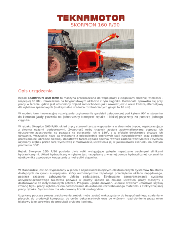 SKORPION 160 R/90 Opis urządzenia Rębak SKORPION 160 R/90 to maszyna przeznaczona do współpracy z ciągnikami średniej wielkości (najlepiej 80 KM), zawieszana na trzypunktowym układzie z tyłu ciągnika. Doskonale sprawdza się przy pracy w terenie, gdzie jest utrudniony dojazd samochodem jak i również jest o wiele tańszą alternatywą dla rębaków spalinowych (maksymalna średnica rozdrabnianych gałęzi to 16 cm). W modelu tym innowacyjne rozwiązanie usytuowania gardzieli załadowczej pod kątem 90° w stosunku do kierunku jazdy pozwala na jednoczesny transport rębaka i lekkiej przyczepy za pomocą jednego ciągnika. W rębaku Skorpion 160 R/90, układ tnący stanowi tarcza wyposażona w dwa noże tnące, współpracująca z dwoma nożami podporowymi. Żywotność noży tnących została zoptymalizowana poprzez ich obustronne zaostrzenie, co pozwala na obracanie ich o 180o, a w efekcie dwukrotnie dłuższe ich używanie. Wszystkie noże są wykonane z odpowiednio dobranych stali narzędziowych oraz poddane profesjonalnej obróbce cieplnej. Dodatkowo tarcza rębaka spełnia również zadanie wentylatora i wyrzuca uzyskany zrębek przez rurę wyrzutową z możliwością ustawienia jej w jakimkolwiek kierunku na pełnym promieniu 360o. Rębak Skorpion 160 R/90 posiada dwie rolki wciągające gałęzie napędzane osobnymi silnikami hydraulicznymi. Układ hydrauliczny w rębaku jest napędzany z własnej pompy hydraulicznej, co zwalnia użytkownika z potrzeby korzystania z hydrauliki ciągnika. W standardzie jest on wyposażony w jeden z najnowocześniejszych elektronicznych systemów No-stress dostępnych na rynku europejskim, który automatycznie zapobiega przeciążeniu układu napędowego, poprzez czasowe zatrzymanie układu podającego. Edytowalne oprogramowanie systemu antyprzeciążeniowego No-stress pozwala w prosty sposób na zmianę ustawień pracy maszyny i dostosowanie do indywidualnych potrzeb. Program „grube drewno”, „cienkie drewno” umożliwia szybką zmianę trybu pracy rębaka celem dostosowania do aktualnie rozdrabnianego materiału i efektywniejszej pracy rębaka. System ten ma wbudowany licznik motogodzin. Uzyskany poprzez proces zrębkowania zrębek może zostać wykorzystany do bezpośredniego spalania w piecach, do produkcji kompostu, do celów dekoracyjnych oraz po wtórnym rozdrobnieniu przez młyn bijakowy jako surowiec do produkcji brykietu i pelletu. Dane techniczne MODEL URZĄDZENIA Gabaryty (dł. x szer. x wys.) [mm] Waga [kg] Średnica gałęzi [mm] Ilość noży Szybkość podawania [mb/min] Wydajność zrębkowania [m3/h] Szerokość zrębka [mm] Sposób podawania Średnica tarczy [mm] Wymiary gardzieli (szer. x wys.) [mm] Rodzaj napędu Minimalna moc ciągnika [KM] SKORPION 160 R/90 1500 x 2030 x 2150 (2450)* 750 160 2 tnące + 2 podporowe do 33 do 12 od 9 do 11 dwie rolki zębate o napędzie hydraulicznym 550 285 x 165 z WOM od ciągnika 80 ()* - wymiar po rozłożeniu, w trakcie pracy Wyposażenie standardowe: Wałek odbioru mocy. Rura wyrzutowa ze ślimakową obrotnicą 360°, deflektor. Własny system hydrauliczny. System antyprzeciążeniowy No-stress z licznikiem motogodzin. Wyposażenie opcjonalne: Podwyższenie rury wyrzutowej. Powered by TCPDF (www.tcpdf.org)
