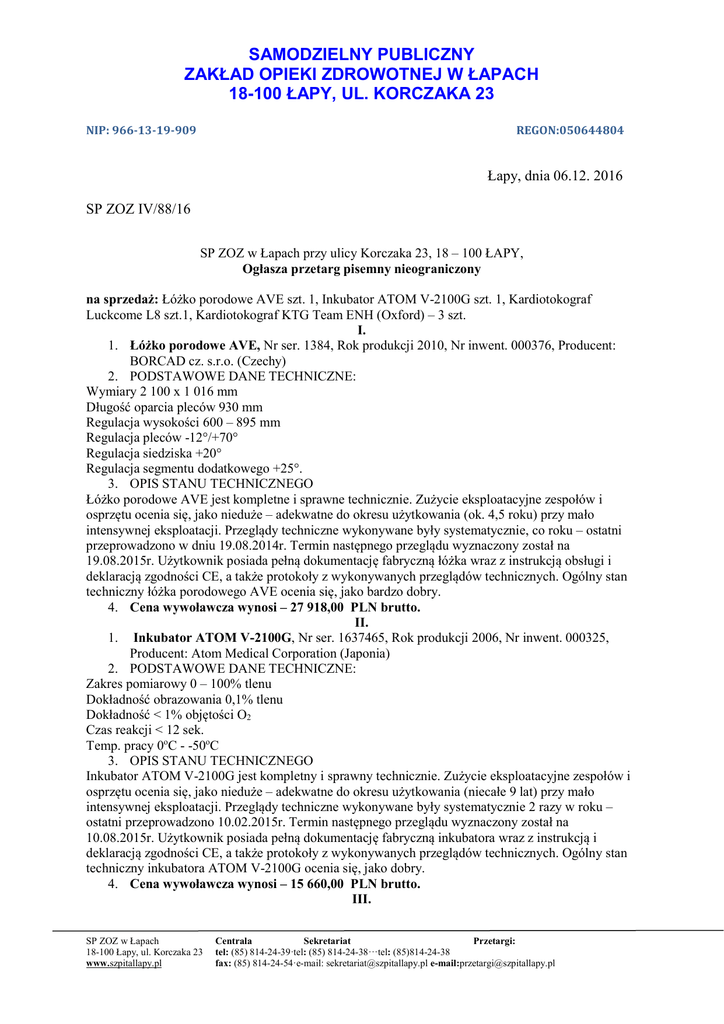 SAMODZIELNY PUBLICZNY ZAKŁAD OPIEKI ZDROWOTNEJ W ŁAPACH 18-100 ŁAPY, UL. KORCZAKA 23 NIP: 966-13-19-909 REGON:050644804 Łapy, dnia 06.12. 2016 SP ZOZ IV/88/16 SP ZOZ w Łapach przy ulicy Korczaka 23, 18 – 100 ŁAPY, Ogłasza przetarg pisemny nieograniczony na sprzedaż: Łóżko porodowe AVE szt. 1, Inkubator ATOM V-2100G szt. 1, Kardiotokograf Luckcome L8 szt.1, Kardiotokograf KTG Team ENH (Oxford) – 3 szt. I. 1. Łóżko porodowe AVE, Nr ser. 1384, Rok produkcji 2010, Nr inwent. 000376, Producent: BORCAD cz. s.r.o. (Czechy) 2. PODSTAWOWE DANE TECHNICZNE: Wymiary 2 100 x 1 016 mm Długość oparcia pleców 930 mm Regulacja wysokości 600 – 895 mm Regulacja pleców -12°/+70° Regulacja siedziska +20° Regulacja segmentu dodatkowego +25°. 3. OPIS STANU TECHNICZNEGO Łóżko porodowe AVE jest kompletne i sprawne technicznie. Zużycie eksploatacyjne zespołów i osprzętu ocenia się, jako nieduże – adekwatne do okresu użytkowania (ok. 4,5 roku) przy mało intensywnej eksploatacji. Przeglądy techniczne wykonywane były systematycznie, co roku – ostatni przeprowadzono w dniu 19.08.2014r. Termin następnego przeglądu wyznaczony został na 19.08.2015r. Użytkownik posiada pełną dokumentację fabryczną łóżka wraz z instrukcją obsługi i deklaracją zgodności CE, a także protokoły z wykonywanych przeglądów technicznych. Ogólny stan techniczny łóżka porodowego AVE ocenia się, jako bardzo dobry. 4. Cena wywoławcza wynosi – 27 918,00 PLN brutto. II. 1. Inkubator ATOM V-2100G, Nr ser. 1637465, Rok produkcji 2006, Nr inwent. 000325, Producent: Atom Medical Corporation (Japonia) 2. PODSTAWOWE DANE TECHNICZNE: Zakres pomiarowy 0 – 100% tlenu Dokładność obrazowania 0,1% tlenu Dokładność < 1% objętości O2 Czas reakcji < 12 sek. Temp. pracy 0oC - -50oC 3. OPIS STANU TECHNICZNEGO Inkubator ATOM V-2100G jest kompletny i sprawny technicznie. Zużycie eksploatacyjne zespołów i osprzętu ocenia się, jako nieduże – adekwatne do okresu użytkowania (niecałe 9 lat) przy mało intensywnej eksploatacji. Przeglądy techniczne wykonywane były systematycznie 2 razy w roku – ostatni przeprowadzono 10.02.2015r. Termin następnego przeglądu wyznaczony został na 10.08.2015r. Użytkownik posiada pełną dokumentację fabryczną inkubatora wraz z instrukcją i deklaracją zgodności CE, a także protokoły z wykonywanych przeglądów technicznych. Ogólny stan techniczny inkubatora ATOM V-2100G ocenia się, jako dobry. 4. Cena wywoławcza wynosi – 15 660,00 PLN brutto. III. SP ZOZ w Łapach 18-100 Łapy, ul. Korczaka 23 www.szpitallapy.pl Centrala Sekretariat Przetargi: tel: (85) 814-24-39·tel: (85) 814-24-38···tel: (85)814-24-38 fax: (85) 814-24-54·e-mail: [email protected] e-mail:[email protected] 1. Kardiotokograf Luckcome L8, Nr ser. TW 1201031, Rok produkcji 2011, Nr inwent. 000383, Producent: ShenZhen luckcome technology Co., Ltd (Chiny) 2. PODSTAWOWE DANE TECHNICZNE: Częstotliwość: 1 MHz Zakres pomiarowy FHR 50 – 210 BPM Dokładność < 10% Szerokość papieru drukarki 110 mm Przekątna ekranu 7 cali Masa 1,5 kg 3. OPIS STANU TECHNICZNEGO Kardiotokograf Luckcome L8 jest kompletny i sprawny technicznie. Zużycie eksploatacyjne zespołów i osprzętu ocenia się, jako nieduże – adekwatne do okresu użytkowania (ok. 3,5 roku) przy mało intensywnej eksploatacji. Przeglądy techniczne wykonywane były systematycznie, co roku – ostatni przeprowadzono 19.08.2014r. Termin następnego przeglądu wyznaczony został na 19.08.2015r. Użytkownik posiada pełną dokumentację fabryczną kardiotokografu wraz z instrukcją obsługi i deklaracją zgodności CE, a także protokoły z wykonywanych przeglądów technicznych. Ogólny stan techniczny kardiotokografu Luckcome L8 ocenia się, jako bardzo dobry. 4. Cena wywoławcza wynosi – 2 322,00 PLN brutto. IV. 1. Kardiotokograf KTG Team ENH (Oxford) – 3 sztuki Nr ser. TI 52459P, Nr inwent. 000166, Nr ser. TI 52498P, Nr inwent. 000167 Nr ser. TI 52083P, Nr inwent. 000168 Rok produkcji wszystkich kardiotokografów: 1995 r., Producent: Huntleigh Healthcare Ltd. Diagnostic (Anglia) 2. PODSTAWOWE DANE TECHNICZNE: Automatyczna komputerowa analiza zapisu KTG – wersja przedporodowa Wodoszczelna głowica ultradźwiękowa Cardio Przetworniki do monitorowania czynności płodu Drukarka termiczna Wyświetlacz LCD Pamięć wewnętrzna aparatu Alarmy 3. OPIS STANU TECHNICZNEGO Kardiotokografy KTG Team ENH (Oxford) są kompletne i w miarę sprawne technicznie. Zużycie eksploatacyjne zespołów i osprzętu ocenia się, jako znaczne. Przeglądy techniczne wykonywane były systematycznie, co roku – ostatni przeprowadzono 19.08.2014r. Termin następnego przeglądu wyznaczony został na 19.08.2015r. Użytkownik nie posiada dokumentacji fabrycznej kardiotokografów ani instrukcji obsługi. Posiada jedynie protokoły z wykonywanych przeglądów technicznych. Ogólny stan techniczny kardiotokografów KTG Team ENH (Oxford) ocenia się, jako średni. 4. Cena wywoławcza każdego kardiotokografu wynosi – 4 536,00 PLN brutto. V. Oferent pozostanie związany złożoną ofertą przez okres 30 dni. Bieg terminu związania z ofertą rozpoczyna się wraz z upływem terminu składania ofert. Oferta powinna zawierać: imię, nazwisko oraz adres oferenta lub nazwę i siedzibę firmy, datę sporządzenia oferty, proponowaną cenę nabycia brutto na wybrany asortyment, sposób zapłaty, oświadczenie, że oferent zapoznał się ze stanem technicznym przedmiotu sprzedaży, oraz, że w związku z tym nie wnosi i wnosił nie będzie wobec sprzedającego żadnych roszczeń. Osobami upoważnionymi do kontaktu, są: 1. Bogusław Łapiński–kierownik działu zaopatrzenia i obsługi gospodarczej, telefon 85 814 24 26 lub 605 606 900 SP ZOZ w Łapach 18-100 Łapy, ul. Korczaka 23 www.szpitallapy.pl Centrala Sekretariat Przetargi: tel: (85) 814-24-39·tel: (85) 814-24-38···tel: (85)814-24-38 fax: (85) 814-24-54·e-mail: [email protected] 