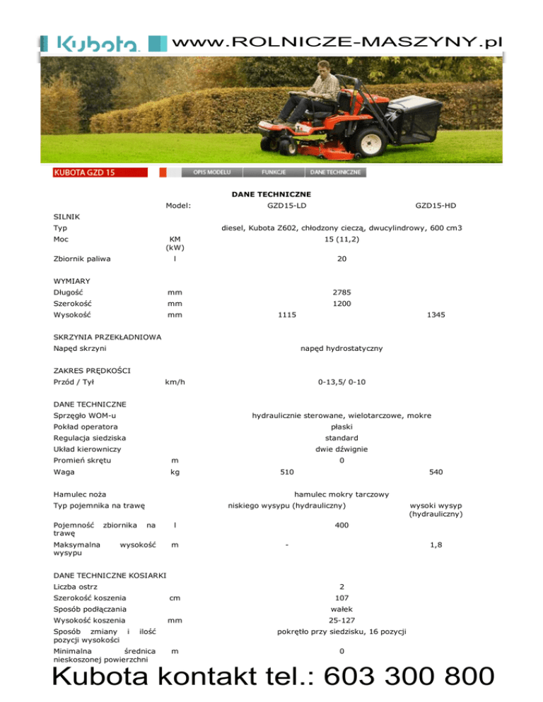 www.ROLNICZE-MASZYNY.pl DANE TECHNICZNE Model: GZD15-LD GZD15-HD SILNIK Typ diesel, Kubota Z602, chłodzony cieczą, dwucylindrowy, 600 cm3 Moc KM (kW) 15 (11,2) l 20 Długość mm 2785 Szerokość mm 1200 Wysokość mm Zbiornik paliwa WYMIARY 1115 1345 SKRZYNIA PRZEKŁADNIOWA Napęd skrzyni napęd hydrostatyczny ZAKRES PRĘDKOŚCI Przód / Tył km/h 0-13,5/ 0-10 DANE TECHNICZNE Sprzęgło WOM-u hydraulicznie sterowane, wielotarczowe, mokre Pokład operatora płaski Regulacja siedziska standard Układ kierowniczy dwie dźwignie Promień skrętu m Waga kg 0 510 Hamulec noŜa hamulec mokry tarczowy Typ pojemnika na trawę Pojemność trawę zbiornika Maksymalna wysypu 540 niskiego wysypu (hydrauliczny) na wysokość l m wysoki wysyp (hydrauliczny) 400 - 1,8 DANE TECHNICZNE KOSIARKI Liczba ostrz 2 Szerokość koszenia cm Sposób podłączania Wysokość koszenia Sposób zmiany pozycji wysokości 107 wałek mm i ilość Minimalna średnica nieskoszonej powierzchni 25-127 pokrętło przy siedzisku, 16 pozycji m 0 Kubota kontakt tel.: 603 300 800