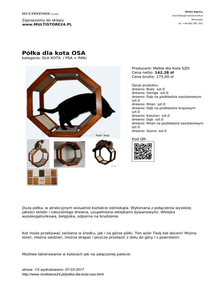 Glinka Agency mail;[email protected] Zapraszamy do sklepu www.MULTISTORE24.PL Warszawa tel. +48 602 395 051 Półka dla kota OSA kategoria: DLA KOTA / PSA > Półki Producent: Meble dla Kota SZD Cena netto: 142,28 zł Cena brutto: 175,00 zł Opcje produktu: drewno: Biały szt.0 drewno: Vemge szt.0 drewno: Dąb na podkładzie kasztanowym szt.0 drewno: Milan szt.0 drewno: Dąb na podkładzie brązowym szt.0 drewno: Kasztan szt.0 drewno: Dąb szt.0 drewno: Milan na podkładzie kasztanowym szt.0 drewno: Sosna szt.0 Kod QR: Duża półka, w atrakcyjnym wizualnie kształcie ośmiokąta. Wykonana z połączenia wysokiej jakości sklejki i naturalnego drewna, uzupełniona wklejkami dywanowymi. Wklejka wysokogatunkowa, belgijska, odporna na brudzenie. Kot może przebywać zarówno w środku, jak i na górze półki. Ten wzór Twój kot doceni! Można leżeć, można siedzieć, można drapać i jeszcze przełazić z dołu do góry i z powrotem! Możliwe lakierowanie w kolorach jak na załączonej palecie: strona: 1/2 wydrukowano: 07-03-2017 http://www.multistore24.pl/polka-dla-kota-osa.html Dąb na podkładzie brązowym; Biały; Kasztan; Brąz; Venge; Milan; Dąb na podkładzie kasztanowym; Milan na podkładzie kasztanowym; Sosna; Dąb. Wymiary: szer.58/ wys.58/ gł. 28cm gwarancja 120 dni Wszystkie meble są specjalnie przygotowywane - robione dla klażdego zamówienia osobno, podlegają gwarancji, ale nie podlegają zwrotowi ponieważ jest to usługa dedykowana pod każde zamówienie. Prosimy nie łaczyć produktów tego producenta z innymi w naszym sklepie w jednym zamówieniu. strona: 2/2 wydrukowano: 07-03-2017 http://www.multistore24.pl/polka-dla-kota-osa.html