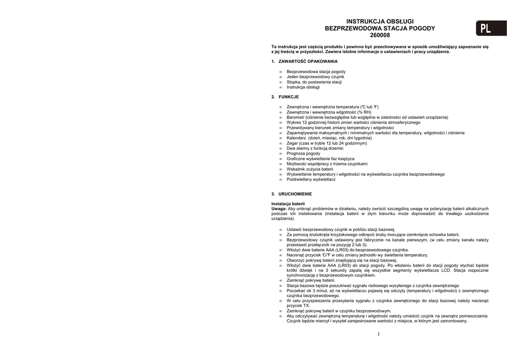 INSTRUKCJA OBSŁUGI BEZPRZEWODOWA STACJA POGODY 260008 Ta instrukcja jest częścią produktu i powinna być przechowywana w sposób umożliwiający zapoznanie się z jej treścią w przyszłości. Zawiera istotne informacje o ustawieniach i pracy urządzenia. 1. ZAWARTOŚĆ OPAKOWANIA • • • • Bezprzewodowa stacja pogody Jeden bezprzewodowy czujnik Stopka, do postawienia stacji Instrukcja obsługi 2. FUNKCJE • • • • • • • • • • • • • • • Zewnętrzna i wewnętrzna temperatura (°C lub °F) Zewnętrzna i wewnętrzna wilgotność (% RH) Barometr (ciśnienie bezwzględne lub względne w zależności od ustawień urządzenia) Wykres 12 godzinnej historii zmian wartości ciśnienia atmosferycznego Przewidywany kierunek zmiany temperatury i wilgotności Zapamiętywanie maksymalnych i minimalnych wartości dla temperatury, wilgotności i ciśnienia Kalendarz (dzień, miesiąc, rok, dni tygodnia) Zegar (czas w trybie 12 lub 24 godzinnym) Dwa alarmy z funkcją drzemki Prognoza pogody Graficzne wyświetlanie faz księżyca Możliwość współpracy z trzema czujnikami Wskaźnik zużycia baterii Wyświetlanie temperatury i wilgotności na wyświetlaczu czujnika bezprzewodowego Podświetlany wyświetlacz 3. URUCHOMIENIE Instalacja baterii Uwaga: Aby uniknąć problemów w działaniu, należy zwrócić szczególną uwagę na polaryzację baterii alkalicznych podczas ich instalowania (instalacja baterii w złym kierunku może doprowadzić do trwałego uszkodzenia urządzenia). • • • • • • • • • • • • • Ustawić bezprzewodowy czujnik w pobliżu stacji bazowej. Za pomocą śrubokręta krzyżakowego odkręcić śruby mocujące zamknięcie schowka baterii. Bezprzewodowy czujnik ustawiony jest fabrycznie na kanale pierwszym, (w celu zmiany kanału należy przestawić przełącznik na pozycję 2 lub 3). Włożyć dwie baterie AAA (LR03) do bezprzewodowego czujnika. Nacisnąć przycisk °C/°F w celu zmiany jednostki wy świetlania temperatury. Otworzyć pokrywę baterii znajdującą się na stacji bazowej. Włożyć dwie baterie AAA (LR03) do stacji pogody. Po włożeniu baterii do stacji pogody słychać będzie krótki dźwięk i na 3 sekundy zapalą się wszystkie segmenty wyświetlacza LCD. Stacja rozpocznie synchronizację z bezprzewodowym czujnikiem. Zamknąć pokrywę baterii. Stacja bazowa będzie poszukiwać sygnału radiowego wysyłanego z czujnika zewnętrznego Poczekać ok 3 minut, aż na wyświetlaczu pojawią się odczyty (temperatury i wilgotności) z zewnętrznego czujnika bezprzewodowego. W celu przyspieszenia przesyłania sygnału z czujnika zewnętrznego do stacji bazowej należy nacisnąć przycisk TX. Zamknąć pokrywę baterii w czujniku bezprzewodowym. Aby odczytywać zewnętrzną temperaturę i wilgotność należy umieścić czujnik na zewnątrz pomieszczenia. Czujnik będzie mierzył i wysyłał zarejestrowane wartości z miejsca, w którym jest zamontowany. 1 Każdorazowo, gdy w czujniku zewnętrznym wymieniane są baterie, do stacji wysyłany jest losowy kod ochronny. Powinna nastąpić automatyczna synchronizacja obu urządzeń. Zaleca się jednak, aby w przypadku wymiany baterii w czujniku, zrestartować również stację pogody przez chwilowe wyjęcie baterii. Umożliwi to odzyskanie kontaktu z czujnikiem. Uwaga: NIE NACISKAĆ ŻADNEGO PRZYCISKU przez pierwsze 3 minuty po włożeniu baterii. Po pojawieniu się na wyświetlaczu wszystkich (wew. i zew.) mierzonych wartości, można umieścić bezprzewodowy czujnik na zewnątrz, a stację w wybranym miejscu. Jeśli na stacji pogody nie pokażą się zewnętrzne pomiary, upewnij się czy czujnik jest w zasięgu stacji lub powtórz procedurę instalacji baterii. Jeśli przed pojawieniem się wszystkich odczytów na wyświetlaczu stacji został naciśnięty jakiś klawisz, należy ponownie przeprowadzić procedurę instalacji baterii. Przed ponownym zainstalowaniem baterii prosimy poczekać minimum 10 s, aby mieć pewność, że zarówno stacja jak i czujnik zresetują się poprawnie. 4. MONTAŻ Przed trwałym zamontowaniem obu urządzeń ważne jest, aby upewnić się, że w zaplanowanych lokalizacjach stacja i czujnik wzajemnie odbierają swoje sygnały. 4.1 Montaż bezprzewodowego czujnika • • • Aby osiągnąć odczyt rzeczywistej temperatury zewnętrznej, należy unikać instalowania czujnika w miejscu narażonym na promienie słoneczne. Polecamy instalowanie czujnika na zewnętrznej, północnej ścianie. Należy umieścić go w miejscu, w którym nie będzie bezpośrednio narażony na deszcz, śnieg lub lód. Czujnik należy umieścić w odległości nie przekraczającej 30m. Przeszkody takie jak ściany, metalowe drzwi, czy duże, metalowe obiekty ograniczają zasięg. Bezprzewodowe urządzenia takie jak: systemy alarmowe, dzwonki bezprzewodowe i inne urządzenia wysyłające sygnały radiowe mogą zakłócić przesyłanie sygnału z czujnika do stacji pogody. 5. FUNKCJE PROGRAMOWANIA 5.1. Ustawienie Czasu i Daty • • • • • • • • • • • • • • Nacisnąć i przytrzymać przycisk MODE przez 3-4 sekundy, aż na wyświetlaczu zacznie migać liczba oznaczająca rok. Nacisnąć przycisk UP lub DOWN w celu ustawienia żądanego roku. Nacisnąć przycisk MODE na wyświetlaczu zacznie migać liczba oznaczająca miesiąc. Nacisnąć przycisk UP lub DOWN w celu ustawienia żądanego miesiąca. Nacisnąć przycisk MODE na wyświetlaczu zacznie migać liczba oznaczająca dzień. Nacisnąć przycisk UP lub DOWN w celu ustawienia żądanego dnia. Nacisnąć przycisk MODE na wyświetlaczu zaczną migać cyfry godziny. Nacisnąć przycisk UP lub DOWN w celu ustawienia żądanej godziny. Nacisnąć przycisk MODE na wyświetlaczu zaczną migać cyfry minut. Nacisnąć przycisk UP lub DOWN w celu ustawienia żądanej minuty. Nacisnąć przycisk MODE na wyświetlaczu zacznie migać format czasu. Nacisnąć przycisk UP lub DOWN w celu ustawienia żądaneg