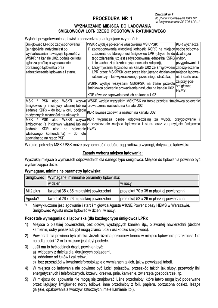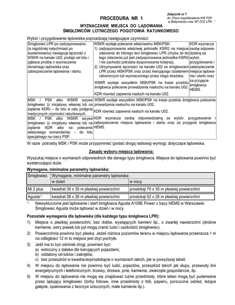 PROCEDURA NR 1 Załącznik nr 7 do „Planu współdziałania KW PSP w Białymstoku oraz SP ZOZ LPR...” WYZNACZANIE MIEJSCA DO LĄDOWANIA ŚMIGŁOWCÓW LOTNICZEGO POGOTOWIA RATUNKOWEGO Wybór i przygotowanie lądowiska poprzedzają następujące czynności: Śmigłowiec LPR po zadysponowaniu (a najpóźniej natychmiast po wystartowaniu) nawiązuje łączność z WSKR na kanale U02, podaje cel lotu i zgłasza prośbę o wyznaczenie doraźnego lądowiska oraz zabezpieczenie lądowania i startu. KDR wyznacza WSKR wydaje polecenie właściwemu MSK/PSK: 1) zadysponowania właściwej jednostki KSRG na miejsce osobę odpowiezdarzenia do którego leci śmigłowiec LPR (chyba że do dzialną za tego zdarzenia już jest zadysponowana jednostka KSRG wybór, i nie zachodzi potrzeba dysponowania kolejnej), przygotowanie i 2) Utrzymywania łączności na kanale U02 ze śmigłowcem zabezpieczenie LPR przez MSK/PSK oraz przez kierującego działaniem miejsca lądowaratowniczym lub wyznaczonego przez niego strażaka, nia i startu oraz za przyjęcie WSKR wydaje wszystkim MSK/PSK na trasie przelotu śmigłowca śmigłowca polecenie prowadzenia nasłuchu na kanału U02. HEMS. KDR również zapewnia nasłuch na kanału U02. MSK / PSK albo WSKR wzywa WSKR wydaje wszystkim MSK/PSK na trasie przelotu śmigłowca polecenie śmigłowiec (z inicjatywy własnej lub na prowadzenia nasłuchu na kanału U02. żądanie KDR) – do lotu w celu podjęcia KDR również zapewnia nasłuch na kanału U02. medycznych czynności ratunkowych. MSK / PSK albo WSKR wzywa KDR wyznacza osobę odpowiedzialną za wybór, przygotowanie i śmigłowiec (z inicjatywy własnej lub na zabezpieczenie miejsca lądowania i startu oraz za przyjęcie śmigłowca żądanie KDR albo na polecenie HEMS. właściwego komendanta) – do lotu specjalnego na rzecz PSP. W razie potrzeby MSK / PSK może przypomnieć (podać drogą radiową) wymogi, dotyczące lądowiska. Zasady wyboru miejsca lądowania: Wyszukaj miejsce o wymiarach odpowiednich dla danego typu śmigłowca. Miejsce do lądowania powinno być wystarczająco duże. Wymagane, minimalne parametry lądowiska: Śmigłowiec Wymagane, minimalne parametry lądowiska: w dzień w nocy Mi 2 plus kwadrat 35 x 35 m płaskiej powierzchni prostokąt 70 x 35 m płaskiej powierzchni Agusta*) kwadrat 26 x 26 m płaskiej powierzchni prostokąt 52 x 26 m płaskiej powierzchni *) Niewykluczone jest lądowanie i start śmigłowca Agusta A109E Power z bazy HEMS w Warszawie. Śmigłowiec Agusta może lądować w dzień i w nocy. Pozostałe wymagania dla lądowiska (dla każdego typu śmigłowca LPR): 1) Miejsce o płaskiej powierzchni, bez dołów, wystających kamieni itp., o zwartej nawierzchni (drobne kamienie, ostry piasek lub pył mogą zranić ludzi i uszkodzić śmigłowiec). 2) Powierzchnia powinna być płaska. Jeżeli różnica poziomów terenu w miejscu lądowania przekracza 1 m na odległości 12 m to miejsce jest zbyt pochyłe. 3) Jeśli ma to być odcinek drogi, powinien być: a) widoczny z daleka dla kierujących pojazdami, b) oddalony od łuków i zakrętów, c) bez przeszkód w kwadracie/prostokącie o wymiarach takich, jak w powyższej tabeli. 4) W miejscu do lądowania nie powinno być ludzi, pojazdów, przeszkód takich jak słupy, przewody linii energetycznych i telefonicznych, krzewy, drzewa, pnie, kamienie, zwierzęta gospodarcze, itp. 5) W miejscu do lądowania nie mogą się znajdować luźne przedmioty, które łatwo mogą być poderwane przez lądujący śmigłowiec (torby foliowe, inne przedmioty z folii, papieru, porzucona odzież, leżące gałęzie, opakowania z tworzyw sztucznych, małe kamienie itp.). 6) 7) Jeżeli teren jest pylący można w miarę możliwości zrosić go wodą. Do wybranego miejsca lądowania powinna dochodzić droga łącząca to miejsce z drogą publiczną (lub powinien istnieć inny dogodny dojazd do tego lądowiska). PAMIĘTAJ: Bardzo niebezpieczne a zarazem najmniej widoczne z powietrza, są napowietrzne linie elektryczne i telefoniczne. PAMIĘTAJ: 1) Lądowanie i start śmigłowca odbywa się pod wiatr. 2) Położenie przeszkód na podejściu do lądowania i po starcie powinno umożliwiać zachowanie toru lotu o nachyleniu nie większym, niż 1:6. 3) Powinna więc być zapewniona wolna od przeszkód ścieżka podejścia o nachyleniu nie większym, niż 1:6, to znaczy w np. odległości 60 metrów od krawędzi lądowiska przeszkoda nie może być wyższa, niż 10 m. Sprawdź wymiary wybranego miejsca. 4) Przeszkody boczne przy wybranym miejscu powinny mieścić się pod płaszczyznami o nachyleniu 1:2. PONADTO: Sprawdź wybrane miejsce i jego otoczenie pod względem występowania przeszkód. Wyszukaj, zidentyfikuj wszystkie przeszkody w otoczeniu lądowiska i na drodze spodziewanego podejścia śmigłowca HEMS do lądowania. Pamiętaj o zasadzie nachylenia 1:6. Pamiętaj, że najbardziej niebezpieczne są przeszkody niewidoczne dla pilota, a zwłaszcza napowietrzne linie energetyczne. Poinformuj drogą radiową załogę śmigłowca HEMS o lokalizacji i charakterystyce miejsca lądowania. Poinformuj MSK / PSK o lokalizacji i charakterystyce miejsca lądowania (może mieć łączność ze śmigłowcem wcześniej). Poinformuj drogą radiową załogę śmigłowca HEMS o wszystkich przeszkodach terenowych w okolicy wybranego miejsca do lądowania (słupy, maszty, linie energetyczne, drzewa itp.). PAMIĘTAJ, szczególnie ważne jest poinformowanie o napowietrznych liniach energetycznych. Poinformuj MSK / PSK o lokalizacji i charakterystyce miejsca lądowania wszystkich przeszkodach terenowych w okolicy wybranego miejsca do lądowania (słupy, maszty, linie energetyczne, drzewa itp.) (może mieć łączność ze śmigłowcem wcześniej). Zabezpiecz wybrane lądowisko przed wtargnięciem osób trzecich (minimalna odległość kogokolwiek od śmigłowca, to 30 m). Przekrój podłużny i rzut poziomy prawidłowo dobranego lądowiska oraz jego otoczenia: Ostateczną