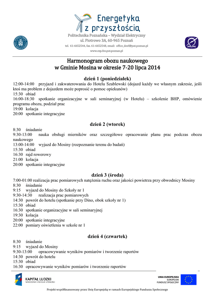 Politechnika Poznańska – Wydział Elektryczny ul. Piotrowo 3A, 60-965 Poznań tel. 61-6652544, fax. 61-6652548, email: [email protected] www.ezp.fee.put.poznan.pl Harmonogram obozu naukowego w Gminie Mosina w okresie 7-20 lipca 2014 dzień 1 (poniedziałek) 12:00-14:00 przyjazd i zakwaterowania do Hotelu Szablewski (dojazd każdy we własnym zakresie, jeśli ktoś ma problem z dojazdem może poprosić o pomoc opiekunów) 15:30 obiad 16:00-18:30 spotkanie organizacyjne w sali seminaryjnej (w Hotelu) – szkolenie BHP, omówienie programu obozu, podział prac 19:00 kolacja 20:00 spotkanie integracyjne dzień 2 (wtorek) 8:30 śniadanie 9:30-13:00 nauka obsługi mierników oraz szczegółowe opracowanie planu prac podczas obozu naukowego 13:00-14:00 wyjazd do Mosiny (rozpoznanie terenu do badań) 15:30 obiad 16:30 rajd rowerowy 21:00 kolacja 20:00 spotkanie integracyjne dzień 3 (środa) 7:00-01:00 realizacja prac pomiarowych natężenia ruchu oraz jakości powietrza przy obwodnicy Mosiny 8:30 śniadanie 9:15 wyjazd do Mosiny do Szkoły nr 1 9:30-14:30 realizacja prac pomiarowych 14:30 powrót do hotelu (spotkanie przy Dino, obok szkoły nr 1) 15:30 obiad 16:30 spotkanie organizacyjne w sali seminaryjnej 19:30 kolacja 20:00 spotkanie integracyjne 22:00 pomiary oświetlenia w szkole nr 1 dzień 4 (czwartek) 8:30 śniadanie 9:15 wyjazd do Mosiny 9:30-13:00 opracowywanie wyników pomiarów i tworzenie raportów 14:30 powrót do hotelu 15:30 obiad 16:30 opracowywanie wyników pomiarów i tworzenie raportów Projekt współfinansowany przez Unię Europejską w ramach Europejskiego Funduszu Społecznego Politechnika Poznańska – Wydział Elektryczny ul. Piotrowo 3A, 60-965 Poznań tel. 61-6652544, fax. 61-6652548, email: [email protected] www.ezp.fee.put.poznan.pl 19:30 kolacja 20:00 spotkanie integracyjne dzień 5 (piątek) 8:30 śniadanie 10:00 wyjazd do Krosinka ul. Malinowa 17 (badanie paneli fotowoltaicznych) 10:15-12:00 realizacja prac pomiarowych 12:30 powrót do hotelu 15:30 obiad 16:00 spotkanie z przedstawicielem firmy EASY SOLAR 19:30 kolacja 20:00 spotkanie integracyjne dzień 6 (sobota) 8:30 śniadanie 12:00-14:00 zabawy grupowe zorganizowane przez organizatora obozu naukowego 14:30 obiad 18:00 kolacja i spotkanie z Burmistrz Gminy Mosina dzień 7 (niedziela) 8:30 15:30 19:30 20:00 śniadanie obiad kolacja spotkanie integracyjne dzień 8 (poniedziałek) 8:30 śniadanie 9:15 wyjazd do Mosiny 9:30-14:30 realizacja prac pomiarowych w szkole podstawowej w Krośnie 14:30 powrót do hotelu (spotkanie przy Dino, obok szkoły nr 1) 15:30 obiad 16:30 spotkanie organizacyjne w sali seminaryjnej 19:30 kolacja 20:00 spotkanie integracyjne dzień 9 (wtorek) 8:30 śniadanie 10:00-14:00 spotkanie z przedstawicielem firmy EVONIK 14:30 obiad 16:30 spotkanie organizacyjne w sali seminaryjnej 19:30 kolacja Projekt współfinansowany przez Unię Europejską w ramach Europejskiego Funduszu Społecznego Politechnika Poznańska – Wydział Elektryczny ul. Piotrowo 3A, 60-965 Poznań tel. 61-6652544, fax. 61-6652548, email: [email protected] www.ezp.fee.put.poznan.pl 20:00 spotkanie integracyjne dzień 10 (środa) 8:00-18:00 realizacja prac pomiarowych natężenia ruchu oraz jakości powietrza przy Szosie Poznańskiej w Mosinie 8:30 śniadanie 9:15 wyjazd do Mosiny 9:30-14:30 realizacja prac pomiarowych w szkole w Krośnie 14:30 powrót do hotelu 14:30 obiad 15:30 spotkanie organizacyjne w sali seminaryjnej 19:30 kolacja 20:00 spotkanie integracyjne dzień 11 (czwartek) 8:30 śniadanie 9:15 wyjazd do Mosiny 9:30-14:30 opracowywanie wyników pomiarów i tworzenie raportów 14:30 powrót do hotelu 14:30 obiad 16:30 spotkanie organizacyjne w sali seminaryjnej 19:30 kolacja 20:00 spotkanie integracyjne dzień 12 (piątek) 8:30 śniadanie 9:15 wyjazd do Mosiny 9:30-14:30 opracowywanie wyników pomiarów i tworzenie raportów 14:30 obiad 16:00 seminarium na temat małej przedsiębiorczości w Energetyce (absolwent kierunku Energetyka) 18:00 kolacja grilowa oraz spotkanie integracyjne dzień 13 (sobota) 9:30 śniadanie 12:00-14:00 zabawy grupowe zorganizowane przez organizatora obozu naukowego 14:30 obiad 15:00-18:00 kończenie i drukowanie opracowanych raportów 19:30 kolacja dzień 14 (niedziela) Projekt współfinansowany przez Unię Europejską w ramach Europejskiego Funduszu Społecznego Politechnika Poznańska – Wydział Elektryczny ul. Piotrowo 3A, 60-965 Poznań tel. 61-6652544, fax. 61-6652548, email: [email protected] www.ezp.fee.put.poznan.pl 8:30 śniadanie 10:00 wymeldowanie z hotelu Co warto zabrać na obóz naukowy 1. rower, piłkę nożną oraz do siatkówki, strój sportowy itp. akcesoria sportowe 2. strój kąpielowy ręczniki plażowe – aby nie używać ręczników hotelowych nad jeziorem 3. środki przeciw komarom Inne uwagi W hotelu jest sieć WiFi Projekt współfinansowany przez Unię Europejską w ramach Europejskiego Funduszu Społecznego