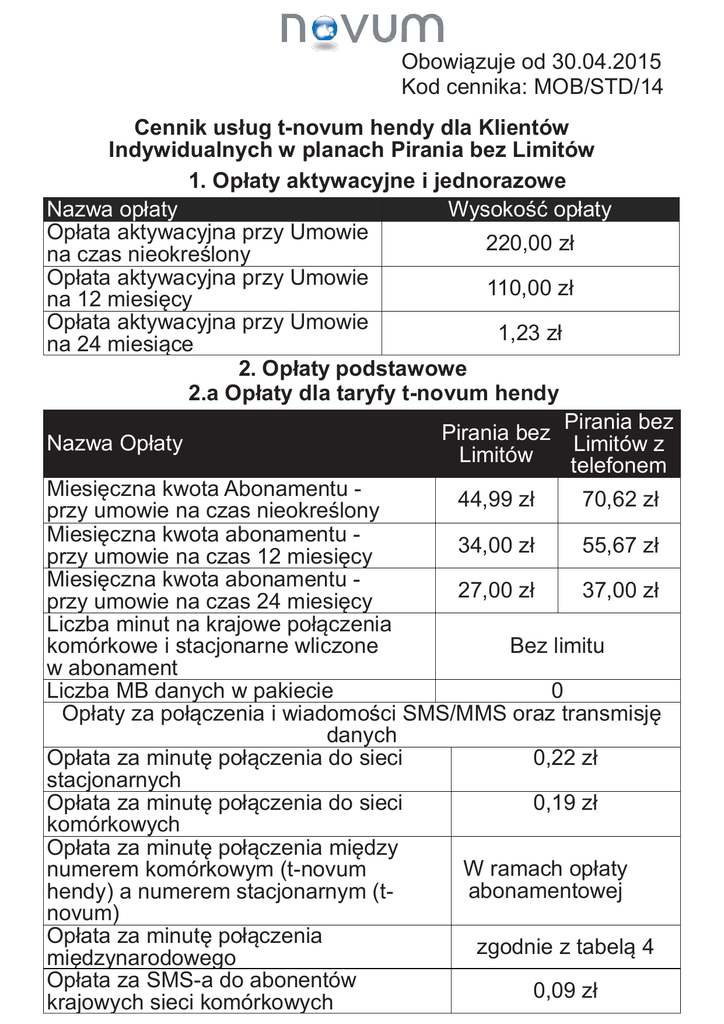 Obowiązuje od 30.04.2015 Kod cennika: MOB/STD/14 Cennik usług
