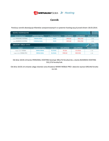 Cennik Poniższy cennik obowiązuje Klientów zarejestrowanych w systemie hosting.wp.pl przed dniem 18.03.2014. Od dnia 18.03.14 konto PERSONAL HOSTING kosztuje 306,27zł brutto/rok, a konto BUSINESS HOSTING 552,27zł brutto/rok. Od dnia 18.03.14 zmianie ulega również cena Kreatora WWW WEBski PRO i obecnie wynosi 649,44zł brutto na rok. Od dnia 18.03.14 Odnowienie domeny polskiej po dacie wygaśnięcia ( w okresie 15 dni od daty ekspiracji do kasacji domeny, w tzw. stanie blocked ) powiększone jest o opłatę administracyjną wynoszącą 23,37zł brutto. Z dniem 18.03.14 zmienia się cena dopłaty do odnowienia dla domen .eu i wynosi ona 23,37zł brutto oraz cena usługi ukrycia danych dla domen globalnych , która obecnie wynosi 11,07zł brutto. Z dniem 18.03.2014 cena rejestracji domeny regionalnej oraz regionalnej IDN dla dotychczasowych klientów wynosi 2,95zł brutto.