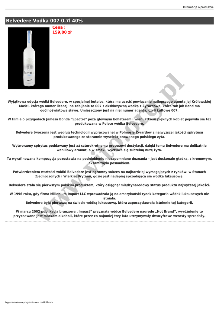Informacje o produkcie Belvedere Vodka 007 0.7l 40% pl Cena : 159,00 zł or g. Wyjątkowa edycja wódki Belvedere, w specjalnej butelce, która ma uczcić powiązanie najlepszego agenta Jej Królewskiej Mości, którego numer licencji na zabijanie to 007 z ekskluzywną wódką z Żyrardowa, która tak jak Bond ma ogólnoświatową sławę. Umieszczony jest na niej numer agenta, czyli kultowe 007. W filmie o przygodach Jamesa Bonda "Spectre" poza głównym bohaterem i wianuszkiem pięknych kobiet pojawiła się też produkowana w Polsce wódka Belvedere. o. Belvedere tworzona jest według technologii wypracowanej w Polmosie Żyrardów z najwyższej jakości spirytusu produkowanego ze starannie wyselekcjonowanego polskiego żyta. it Wytworzony spirytus poddawany jest aż czterokrotnemu procesowi destylacji, dzięki temu Belvedere ma delikatnie waniliowy aromat, a w smaku wyczuwa się subtelną nutę żyta. w .v Ta wyrafinowana kompozycja pozostawia na podniebieniu niezapomniane doznania – jest doskonale gładka, z kremowym, aksamitnym posmakiem. Potwierdzeniem wartości wódki Belvedere jest ogromny sukces na najbardziej wymagających z rynków: w Stanach Zjednoczonych i Wielkiej Brytanii, gdzie jest najlepiej sprzedającą się wódką luksusową. Belvedere stała się pierwszym polskim produktem, który osiągnął międzynarodowy status produktu najwyższej jakości. w W 1996 roku, gdy firma Millenium Import LLC wprowadzała ją na amerykański rynek kategoria wódek luksusowych nie istniała. Belvedere była pierwszą na świecie wódką luksusową, która zapoczątkowała istnienie tej kategorii. w W marcu 2002 publikacja branżowa „Impast” przyznała wódce Belvedere nagrodę „Hot Brand”, wyróżnienie to przyznawane jest markom alkoholi, które przez co najmniej trzy lata utrzymywały dwucyfrowe wzrosty sprzedaży. Wygenerowano w programie www.oscGold.com