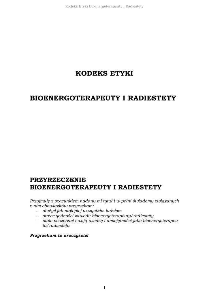 Kodeks Etyki Bioenergoterapeuty i Radiestety KODEKS ETYKI BIOENERGOTERAPEUTY I RADIESTETY PRZYRZECZENIE BIOENERGOTERAPEUTY I RADIESTETY Przyjmuję z szacunkiem nadany mi tytuł i w pełni świadomy związanych z nim obowiązków przyrzekam: - służyć jak najlepiej wszystkim ludziom - strzec godności zawodu bioenergoterapeuty/radiestety - stale poszerzać swoją wiedzę i umiejętności jako bioenergoterapeuta/radiesteta Przyrzekam to uroczyście! 1 Kodeks Etyki Bioenergoterapeuty i Radiestety CZĘŚĆ OGÓLNA Art. 1 1. Zasady etyki bioenergoterapeuty i radiestety wynikają z ogólnych norm etycznych. 2. Zobowiązują one bioenergoterapeutów i radiestetów do przestrzegania praw człowieka i dbania o zachowanie godności zawodu. Art. 2 1. Zadaniem bioenergoterapeuty i radiestety jest posługiwanie się swoją wiedzą i umiejętnościami w celu przywrócenia równowagi energetycznej organizmów żywych, oraz określania i likwidowania szkodliwych wpływów otaczającego świata. 2. Zadaniem radiestety jest ponadto lokalizacja zasobów naturalnych za pomocą wykrywania zmian energetycznych otaczającego świata. 3. Najwyższym nakazem etycznym dla bioenergoterapeuty i radiestety jest dobro człowieka. Art. 3 Polskie Stowarzyszenie Bioterapeutów „BIOPOL” jest zobowiązane do czuwania nad przestrzeganiem zasad etyki bioenergoterapeuty i radiestety, oraz do zachowania godności zawodu. CZĘŚĆ SZCZEGÓŁOWA ROZDZIAŁ I Postępowanie bioenergoterapeuty i radiestety wobec człowieka Art. 4 Bioenergoterapeuta i radiesteta niesie pomoc innemu człowiekowi z wykorzystaniem najlepiej pojętych możliwości i umiejętności własnych. Art. 5 Bioenergoterapeuta i radiesteta powinien zdawać sobie sprawę z odpowiedzialności wynikającej ze stosowanych przez niego metod. 2 Kodeks Etyki Bioenergoterapeuty i Radiestety Art. 6 Bioenergoterapeuta i radiesteta może odmówić wykonania usługi mając na względzie dobro człowieka Jakość usług Art. 7 Bioenergoterapeuta i radiesteta powinien wykonywać usługi z należytą starannością, poświęcając temu niezbędny czas. Art. 8 Bioenergoterapeuta i radiesteta winien zabiegać o wykonywanie swoich usług w warunkach, które zapewniają ich wysoką jakość. Poszanowanie praw człowieka Art. 9 Bioenergoterapeuta i radiesteta powinien życzliwie i kulturalnie traktować swoich klientów, szanując ich godność i prawo do intymności. Art. 10 Relacje pomiędzy klientem a bioenergoterapeutą lub radiestetą powinny opierać się na ich wzajemnym zaufaniu. Art. 11 1. Klient powinien mieć prawo do wyboru bioenergoterapeuty lub radiestety. 2. Obowiązkiem bioenergoterapeuty i radiestety jest respektowanie prawa klienta do świadomego udziału w podejmowaniu decyzji związanych z realizacją usługi dla niego. 3. Informacja udzielona klientowi powinna być sformułowana dla niego w sposób zrozumiały. Tajemnica zawodowa Art. 12 Bioenergoterapeuta i radiesteta ma obowiązek zachowania tajemnicy zawodowej. 3 Kodeks Etyki Bioenergoterapeuty i Radiestety Art. 13 Nie jest naruszeniem tajemnicy zawodowej przekazanie posiadanych informacji innemu bioenergoterapeucie lub radiestecie, jeżeli jest to niezbędne dla dobra człowieka. ROZDZIAŁ II Badania naukowe i eksperymenty Art. 14 Badania naukowe mogą być przeprowadzone przez bioenergoterapeutów i radiestetów o ile służą dobru człowieka i wnoszą istotne dane poszerzające zakres wiedzy i umiejętności fachowych. Art. 15 1. Osoby (lub ich prawni opiekunowie) biorący udział w eksperymencie muszą wyrazić na to zgodę, oraz muszą być uprzednio wyczerpująco poinformowane o wszystkich aspektach doświadczenia, które mogą ich dotyczyć, w tym także o prawie do odstąpienia w każdym czasie od udziału w eksperymencie. 2. Osoby (lub ich prawni opiekunowie) wyrażające zgodę na udział w eksperymencie nie mogą czynić tego pod wpływem zależności od bioenergoterapeuty lub radiestety, czy pozostawania pod jakąkolwiek presją. Art. 16 Eksperymenty o charakterze badawczym muszą być przeprowadzane z zasadami badań naukowych. Art. 17 Wszelkie odkrycia i spostrzeżenia związane z wykonywaniem zawodu bioenergoterapeuta lub radiesteta powinien przekazywać swojemu środowisku zawodowemu. ROZDZIAŁ III Stosunki wzajemne pomiędzy bioenergoterapeutami oraz radiestetami Art. 18 Bioenergoterapeuci i radiesteci powinni okazywać sobie wzajemny szacunek. 4 Kodeks Etyki Bioenergoterapeuty i Radiestety Art. 19 Wszelkie uwagi o dostrzeżonych błędach w postępowaniu innego bioenergoterapeuty lub radiestety, bioenergoterapeuta lub radiesteta powinien przede wszystkim przekazać zainteresowanemu. Poinformowanie Stowarzyszenia o zauważonym naruszeniu zasad etycznych i niekompetencji zawodowej innego bioenergoterapeuty lub radiestety nie godzi w zasady solidarności zawodowej Art. 20 Doświadczeni bioenergoterapeuci i radiesteci powinni służyć radą i pomocą mniej doświadczonym kolegom w trudnych sytuacjach zawodowych Art. 21 W razie wątpliwości powstałych w czasie wykonywania zawodu, bioenergoterapeuta lub radiesteta może się skonsultować z innym bioenergoterapeutą lub radiestetą ROZDZIAŁ IV Zasady postępowania w praktyce bioenergoterapeuty i radiestety Art. 22 1. Bioenergoterapeuta i radiesteta: a) określa miejsca zaburzeń i zmian energetycznych, b) dokonuje charakterystyki zaburzeń energetycznych, c) likwiduje zaburzenia energetyczne d) wyrównuje niedobory energetyczne 2. Bioenergoterapeuta lub radiesteta nie będący lekarzem nie ma prawa stawiać diagnozy lekarskiej i leczyć. Art. 23 Powinnością bioenergoterapeuty i radiestety jest stale uzupełnianie i doskonalenie swojej wiedzy i umiejętności zawodowych, a także przekazywanie ich swoim kolegom. Art. 24 Bioenergoterapeuci i radiesteci powinni, w miarę swoich możliwości, winni brać czynny udział w pracy towarzystw bioenergoterapeutów i radiestetów 5 Kodeks Etyki Bioenergoterapeuty i Radiestety Art. 25 Bioenergote