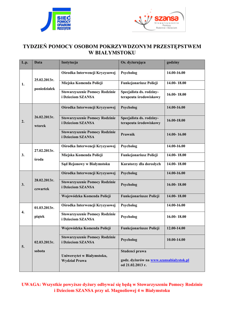 TYDZIEŃ POMOCY OSOBOM POKRZYWDZONYM PRZESTĘPSTWEM W BIAŁYMSTOKU L.p. Data 25.02.2013r. 1. poniedziałek 26.02.2013r. 2. wtorek Instytucja Os. dyżurująca godziny Ośrodka Interwencji Kryzysowej Psycholog 14.00-16.00 Miejska Komenda Policji Funkcjonariusz Policji 14.00- 18.00 Stowarzyszenie Pomocy Rodzinie i Dzieciom SZANSA Specjalista ds. rodzinyterapeuta środowiskowy 16.00- 18.00 Ośrodka Interwencji Kryzysowej Psycholog 14.00-16.00 Stowarzyszenie Pomocy Rodzinie i Dzieciom SZANSA Specjalista ds. rodzinyterapeuta środowiskowy 16.00-18.00 Stowarzyszenie Pomocy Rodzinie i Dzieciom SZANSA Prawnik 14.00- 16.00 Ośrodka Interwencji Kryzysowej Psycholog 14.00-16.00 Miejska Komenda Policji Funkcjonariusz Policji 14.00- 18.00 Sąd Rejonowy w Białymstoku Kuratorzy dla dorosłych 14.00- 18.00 Ośrodka Interwencji Kryzysowej Psycholog 14.00-16.00 Stowarzyszenie Pomocy Rodzinie i Dzieciom SZANSA Psycholog 16.00- 18.00 Wojewódzka Komenda Policji Funkcjonariusze Policji 14.00- 18.00 Ośrodka Interwencji Kryzysowej Psycholog 14.00-16.00 Stowarzyszenie Pomocy Rodzinie i Dzieciom SZANSA Psycholog 16.00- 18.00 Wojewódzka Komenda Policji Funkcjonariusze Policji 12.00-14.00 Stowarzyszenie Pomocy Rodzinie i Dzieciom SZANSA Psycholog 10.00-14.00 27.02.2013r. 3. środa 28.02.2013r. 3. czwartek 01.03.2013r. 4. piątek 02.03.2013r. 5. sobota Studenci prawa Uniwersytet w Białymstoku, Wydział Prawa godz. dyżurów na www.szansabialystok.pl od 21.02.2013 r. UWAGA: Wszystkie powyższe dyżury odbywać się będą w Stowarzyszeniu Pomocy Rodzinie i Dzieciom SZANSA przy ul. Magnoliowej 4 w Białymstoku DYŻURY W PROKURATURZE REJONOWEJ BIAŁYSTOK- PÓŁNOC Dzień Prokurator Miejsce przyjmowania interesantów 25 luty 2013 r. Katarzyna Pietrzycka pokój 221 26 luty 2013 r. Wojciech Zalesko pokój 224 27 luty 2013 r. Anna Milewska pokój 227 28 luty 2013 r. Anatol Pawluczuk pokój 210 01 marca 2013 r. Dawid Roszkowski pokój 222 DYŻURY W PROKURATURZE REJONOWEJ BIAŁYSTOK- POŁUDNIE Dzień Prokurator Stanowisko 25 luty 2013r. Małgorzata Bytys 26 luty 2013r. Krystyna Ciwoniuk 27 luty 2013r. Anna Giedrys 28 luty 2013r. Jolanta Kropiewnicka 1 marca 2013r. Wioletta Legus Prokurator Prokuratury Rejonowej Białystok-Południe w Białymstoku Prokurator Prokuratury Rejonowej Białystok-Południe w Białymstoku Prokurator Prokuratury Rejonowej Białystok-Południe w Białymstoku Prokurator Prokuratury Rejonowej Białystok-Południe w Białymstoku Asesor Prokuratury Rejonowej Białystok-Południe w Białymstoku Miejsce przyjmowania interesantów pokój nr 422 pokój nr 323 pokój nr 411 pokój nr 319 pokój nr 430 KOMENDA WOJEWÓDZKA POLICJI W BIAŁYMSTOKU W dniach 25 luty - 02 marca, od poniedziałku do piątku w godzinach 12.00-14.00 uruchomione zostanie internetowe forum dyskusyjne dotyczące praw osób pokrzywdzonych przestępstwem. W w/w godzinach na forum dyżurować będą policjanci/pracownicy KWP w Białymstoku Na forum – po zalogowaniu będzie można anonimowo zasięgnąć porady, podzielić się swoimi doświadczeniami czy opiniami. Każdy dzień na forum poświęcony zostanie innemu zagadnieniu: poniedziałek – uzależnieniom, wtorek – przemocy w rodzinie i przemocy seksualnej, w środę - prawom człowieka i tolerancji, czwartek poświęcony będzie zagadnieniom ruchu drogowego, natomiast w piątek głównym tematem będą małoletni pokrzywdzeni przestępstwem. Nad właściwym przebiegiem dyskusji będzie czuwał moderator z Wydziału Prewencji KWP w Białymstoku. Dostęp do forum możliwy będzie ze strony KWP w Białymstoku – poprzez kliknięcie linku w banerze zatytułowanym „Pomoc osobom pokrzywdzonym przestępstwem” (który umieszczony zostanie po prawej stronie witryny). W banerze tym znajdują się także przydatne informacje na tematy dotyczące patologii społecznych oraz praw osób pokrzywdzonych przestępstwem. Bezpośredni adres forum: www.pokrzywdzeni.phorum.pl KOMENDA MIEJSKA POLICJI W BIAŁYSMTOKU W ramach „Tygodnia pomocy osobom pokrzywdzonym przestępstwem” Komenda Miejska Policji w Białymstoku uruchomiła dyżury dzielnicowych na poszczególnych komisariatach. Więcej na stronie www.bialystok.policja.gov.pl Dzień Godziny Komisariat 25 luty 2013r. 17.00- 19.00 KP IV ul. Słowackiego 26 luty 2013r. 18.00- 20.00 KP III ul. Upalna 27 luty 2013r. 28 luty 2013r. 01 marca 2013r. 8.00- 10.00 KP I ul. Waryńskiego 15.00-17.00 KP II ul. Warszawska www.szansabialystok.pl