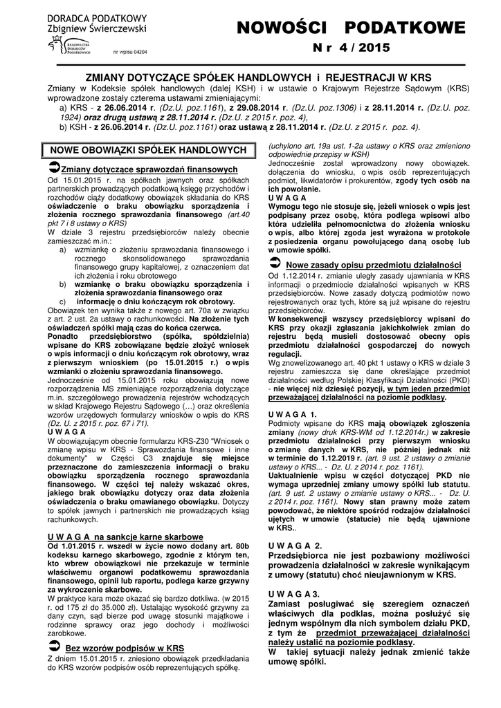 NOWOŚCI PODATKOWE N r 4 / 2015 ZMIANY DOTYCZĄCE SPÓŁEK HANDLOWYCH i REJESTRACJI W KRS Zmiany w Kodeksie spółek handlowych (dalej KSH) i w ustawie o Krajowym Rejestrze Sądowym (KRS) wprowadzone zostały czterema ustawami zmieniającymi: a) KRS - z 26.06.2014 r. (Dz.U. poz.1161), z 29.08.2014 r. (Dz.U. poz.1306) i z 28.11.2014 r. (Dz.U. poz. 1924) oraz drugą ustawą z 28.11.2014 r. (Dz.U. z 2015 r. poz. 4), b) KSH - z 26.06.2014 r. (Dz.U. poz.1161) oraz ustawą z 28.11.2014 r. (Dz.U. z 2015 r. poz. 4). NOWE OBOWIĄZKI SPÓŁEK HANDLOWYCH Zmiany dotyczące sprawozdań finansowych Od 15.01.2015 r. na spółkach jawnych oraz spółkach partnerskich prowadzących podatkową księgę przychodów i rozchodów ciąży dodatkowy obowiązek składania do KRS oświadczenie o braku obowiązku sporządzenia i złożenia rocznego sprawozdania finansowego (art.40 pkt 7 i 8 ustawy o KRS) W dziale 3 rejestru przedsiębiorców należy obecnie zamieszczać m.in.: a) wzmiankę o złożeniu sprawozdania finansowego i rocznego skonsolidowanego sprawozdania finansowego grupy kapitałowej, z oznaczeniem dat ich złożenia i roku obrotowego b) wzmiankę o braku obowiązku sporządzenia i złożenia sprawozdania finansowego oraz c) informację o dniu kończącym rok obrotowy. Obowiązek ten wynika także z nowego art. 70a w związku z art. 2 ust. 2a ustawy o rachunkowości. Na złożenie tych oświadczeń spółki mają czas do końca czerwca. Ponadto przedsiębiorstwo (spółka, spółdzielnia) wpisane do KRS zobowiązane będzie złożyć wniosek o wpis informacji o dniu kończącym rok obrotowy, wraz z pierwszym wnioskiem (po 15.01.2015 r.) o wpis wzmianki o złożeniu sprawozdania finansowego. Jednocześnie od 15.01.2015 roku obowiązują nowe rozporządzenia MS zmieniające rozporządzenia dotyczące m.in. szczegółowego prowadzenia rejestrów wchodzących w skład Krajowego Rejestru Sądowego (…) oraz określenia wzorów urzędowych formularzy wniosków o wpis do KRS (Dz. U. z 2015 r. poz. 67 i 71). UWAGA W obowiązującym obecnie formularzu KRS-Z30 "Wniosek o zmianę wpisu w KRS - Sprawozdania finansowe i inne dokumenty" w Części C3 znajduje się miejsce przeznaczone do zamieszczenia informacji o braku obowiązku sporządzenia rocznego sprawozdania finansowego. W części tej należy wskazać okres, jakiego brak obowiązku dotyczy oraz data złożenia oświadczenia o braku omawianego obowiązku. Dotyczy to spółek jawnych i partnerskich nie prowadzących ksiąg rachunkowych. U W A G A na sankcje karne skarbowe Od 1.01.2015 r. wszedł w życie nowo dodany art. 80b kodeksu karnego skarbowego, zgodnie z którym ten, kto wbrew obowiązkowi nie przekazuje w terminie właściwemu organowi podatkowemu sprawozdania finansowego, opinii lub raportu, podlega karze grzywny za wykroczenie skarbowe. W praktyce kara może okazać się bardzo dotkliwa. (w 2015 r. od 175 zł do 35.000 zł). Ustalając wysokość grzywny za dany czyn, sąd bierze pod uwagę stosunki majątkowe i rodzinne sprawcy oraz jego dochody i możliwości zarobkowe. Bez wzorów podpisów w KRS Z dniem 15.01.2015 r. zniesiono obowiązek przedkładania do KRS wzorów podpisów osób reprezentujących spółkę. (uchylono art. 19a ust. 1-2a ustawy o KRS oraz zmieniono odpowiednie przepisy w KSH) Jednocześnie został wprowadzony nowy obowiązek. dołączenia do wniosku, o wpis osób reprezentujących podmiot, likwidatorów i prokurentów, zgody tych osób na ich powołanie. UWAGA Wymogu tego nie stosuje się, jeżeli wniosek o wpis jest podpisany przez osobę, która podlega wpisowi albo która udzieliła pełnomocnictwa do złożenia wniosku o wpis, albo której zgoda jest wyrażona w protokole z posiedzenia organu powołującego daną osobę lub w umowie spółki. Nowe zasady opisu przedmiotu działalności Od 1.12.2014 r. zmianie uległy zasady ujawniania w KRS informacji o przedmiocie działalności wpisanych w KRS przedsiębiorców. Nowe zasady dotyczą podmiotów nowo rejestrowanych oraz tych, które są już wpisane do rejestru przedsiębiorców. W konsekwencji wszyscy przedsiębiorcy wpisani do KRS przy okazji zgłaszania jakichkolwiek zmian do rejestru będą musieli dostosować obecny opis przedmiotu działalności gospodarczej do nowych regulacji. Wg znowelizowanego art. 40 pkt 1 ustawy o KRS w dziale 3 rejestru zamieszcza się dane określające przedmiot działalności według Polskiej Klasyfikacji Działalności (PKD) - nie więcej niż dziesięć pozycji, w tym jeden przedmiot przeważającej działalności na poziomie podklasy. U W A G A 1. Podmioty wpisane do KRS mają obowiązek zgłoszenia zmiany (nowy druk KRS-WM od 1.12.2014r.) w zakresie przedmiotu działalności przy pierwszym wniosku o zmianę danych w KRS, nie później jednak niż w terminie do 1.12.2019 r. (art. 9 ust. 2 ustawy o zmianie ustawy o KRS... - Dz. U. z 2014 r. poz. 1161). Uaktualnienie wpisu w części dotyczącej PKD nie wymaga uprzedniej zmiany umowy spółki lub statutu. (art. 9 ust. 2 ustawy o zmianie ustawy o KRS... - Dz. U. z 2014 r. poz. 1161). Nowy stan prawny może zatem powodować, że niektóre spośród rodzajów działalności ujętych w umowie (statucie) nie będą ujawnione w KRS.. U W A G A 2. Przedsiębiorca nie jest pozbawiony możliwości prowadzenia działalności w zakresie wynikającym z umowy (statutu) choć nieujawnionym w KRS. U W A G A 3. Zamiast posługiwać się szeregiem oznaczeń właściwych dla podklas, można posłużyć się jednym wspólnym dla nich symbolem działu PKD, z tym że przedmiot przeważającej działalności należy ustalić na poziomie podklasy. W takiej sytuacji należy jednak zmienić także umowę spółki. OBOWIĄZKI WOBEC KRS WG TYPU SPÓŁKI NOWE ZASADY POSTĘPOWANIA PRZED KRS Z uwagi na znaczny zakres zmian, poniżej przedstawiam najważniejsze zmiany dotyczące poszczególnych typów podmiotów wpisanych do KRS . Postępowanie przed KRS według nowych zasad Od 1.12.2014 r. zmieniły się zasady re