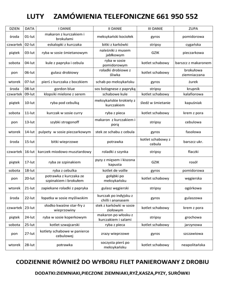 LUTY DZIEN DATA środa 01-lut czwartek 02-lut ZAMÓWIENIA TELEFONICZNE 661 950 552 I DANIE makaron z kurczakiem i brokułami eskalopki z kurczaka III DANIE ZUPA meksykański kociołek gyros pomidorowa bitki z karkówki stripsy cygańska naleśniki z musem jabłkowym ryba w sosie pomidorowym roladki drobiowe z śliwka GZIK pieczarkowa kotlet schabowy barszcz z makaronem kotlet schabowy brokułowa ziemniaczana pierś z kurczaka z boczkiem schab po meksykańsku gyros żurek gordon blue klopsiki mielone z serem sos bolognese z papryką schabowe kule stripsy kotlet schabowy krupnik kalafiorowa piątek 03-lut ryba w sosie śmietanowym sobota 04-lut kule z papryka i cebula pon 06-lut gulasz drobiowy wtorek 07-lut środa 08-lut czwartek 09-lut II DANIE piątek 10-lut ryba pod cebulką meksykańskie krokiety z kurczakiem śledź w śmietanie kapuśniak sobota 11-lut kurczak w sosie curry ryba z pieca kotlet schabowy krem z pora pon 13-lut szybki strogonoff makaron z kurczakiem i porą stripsy cebulowa stek ze schabu z cebula gyros fasolowa potrawka kotlet schabowy z cebula barszcz ukr. roladki z szynka stripsy flaczki GZIK rosół gyros pomidorowa kotlet schabowy węgierska stripsy ogórkowa gyros gulaszowa kotlet schabowy krem z pora stripsy grochowa kotlet schabowy jarzynowa wtorek środa 14-lut pulpety w sosie pieczarkowym 15-lut bitki wieprzowe czwartek 16-lut karczek miodowo musztardowy piątek 17-lut ryba ze szpinakiem pyzy z mięsem i kiszona kapusta sobota 18-lut pon 20-lut ryba z cebulka potrawka z kurczaka ze szpinakiem i brokułem kotlet de voille gołąbki po meksykańsku wtorek 21-lut zapiekane roladki z papryka gulasz węgierski środa 22-lut łopatka w sosie myśliwskim czwartek 23-lut słodko kwaśne star-fry z wieprzowiny kurczak po indyjsku z chilli i ananasem stek z karkówki w sosie ziołowym makaron po włosku z kurczakiem i salami ryba z pieca piątek 24-lut ryba w sosie koperkowym sobota 25-lut kotlet szwajcarski pon 27-lut kotlety schabowe w panierce cebulowej zrazy wieprzowe gyros szczawiowa wtorek 28-lut potrawka soczysta pierś po meksykańsku kotlet schabowy neapolitańska CODZIENNIE RÓWNIEŻ DO WYBORU FILET PANIEROWANY Z DROBIU DODATKI:ZIEMNIAKI,PIECZONE ZIEMNIAKI,RYŻ,KASZA,PYZY, SURÓWKI