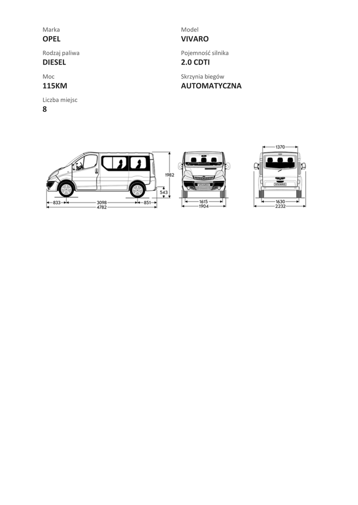 Marka Model OPEL VIVARO Rodzaj paliwa Pojemność silnika DIESEL 2.0 CDTI Moc Skrzynia biegów 115KM AUTOMATYCZNA Liczba miejsc 8