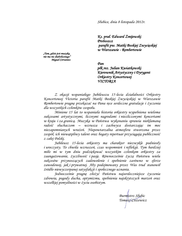 Słubice, dnia 8 listopada 2012r. Ks. prał. Edward Żmijewski Proboszcz parafii pw. Matki Boskiej Zwycięskiej w Warszawie - Rembertowie „Tam, gdzie jest muzyka, nie ma nic diabolicznego” Miguel Cervantes Pan płk rez. Julian Kwiatkowski Kierownik Artystyczny i Dyrygent Orkiestry Koncertowej VICTORIA Z okazji wspaniałego Jubileuszu 15-lecia działalności Orkiestry Koncertowej Victoria parafii Matki Boskiej Zwycięskiej w Warszawie Rembertowie pragnę przekazać na Pana ręce serdeczne gratulacje i życzenia dla wszystkich członków zespołu. Minione 15 lat to wspaniała historia orkiestry wypełniona wieloma sukcesami artystycznymi, licznymi nagrodami i niezliczonymi koncertami w kraju i za granicą. Muzyka w Państwa wykonaniu sprawia niekłamaną radość słuchaczom – wzrusza i zachwyca dostarczając im moc niezapomnianych wrażeń. Niepowtarzalna atmosfera stworzona przez zespół, ich niewątpliwy talent oraz bogaty repertuar przyciągają publiczność z całej Polski. Jubileusz 15-lecia orkiestry ma charakter niezwykle podniosły i uroczysty. To chwila wzruszeń, czas wspomnień i refleksji. Tym bardziej miło mi w tym dniu podziękować wszystkim członkom orkiestry za zaangażowanie, życzliwość i pasję. Równocześnie życzę Państwu wielu sukcesów przynoszących zadowolenie i spełnienie zarówno w sferze zawodowej, jak i prywatnej. Aby podejmowany przez Was trud stanowił źródło niewyczerpanej satysfakcji i społecznego uznania. Jednocześnie pragnę złożyć Państwu najserdeczniejsze życzenia zdrowia, pogody ducha, optymizmu, spełnienia najskrytszych marzeń oraz wszelkiej pomyślności w życiu osobistym. Burmistrz Słubic Tomasz Ciszewicz