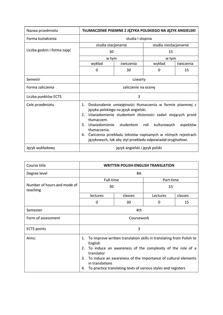 Nazwa przedmiotu TŁUMACZENIE PISEMNE Z JĘZYKA POLSKIEGO NA JĘZYK ANGIELSKI Forma kształcenia studia I stopnia studia stacjonarne studia niestacjonarne 30 15 w tym w tym Liczba godzin i forma zajęć wykład ćwiczenia wykład 0 30 0 Semestr ćwiczenia 15 czwarty Forma zaliczenia zaliczenie na ocenę Liczba punktów ECTS 3 Cele przedmiotu 1. Doskonalenie umiejętności tłumaczenia w formie pisemnej z języka polskiego na język angielski. 2. Uświadomienie studentom złożoności zadań stojących przed tłumaczem. 3. Uświadomienie studentom roli kulturowych aspektów tłumaczenia. 4. Ćwiczenia przekładu tekstów napisanych w różnych rejestrach językowych, tak aby styl przekładu odpowiadał oryginałowi. Język wykładowy język angielski i język polski Course title WRITTEN POLISH-ENGLISH TRANSLATION Degree level BA Number of hours and mode of teaching Semester Form of assessment ECTS points Aims: Full-time Part-time 30 15 lectures classes Lectures 0 30 0 classes 15 4th Coursework 3 1. To improve written translation skills in translating from Polish to English 2. To induce an awareness of the complexity of the role of a translator 3. To induce an awareness of the importance of cultural elements in translations 4. To practice translating texts of various styles and registers