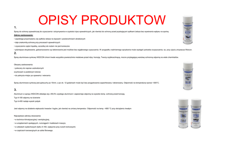 1. OPISY PRODUKTÓW Spray do ochrony spawalniczej do czyszczenia i utrzymywania w czystości dysz spawalniczych, jak również do ochrony przed pryskającymi opiłkami żelaza bez wywierania wpływu na spoinę. Zakres zastosowania: • zapobiega przysmażaniu się opiłków żelaza na dyszach i powierzchniach obrabianych • daje znakomitą ochronę przy procesach spawalniczych • czyszczenie części łopatką, szczotką lub nożem nie jest konieczne • późniejsze oksydowanie, galwanizowanie czy lakierowanie jest możliwe bez wyjątkowego czyszczenia. W przypadku nadmiernego spryskania może wystąpić potrzeba oczyszczenia, np. przy użyciu zmywacza Weicon. 2. Spray aluminiowo-cynkowy WEICON chroni trwale wszystkie powierzchnie metalowe przed rdzą i korozją. Tworzy szybkoschnącą, mocno przylegającą warstwę ochronną odporną na wiele chemikaliów. Obszary zastosowania: • polecany do napraw uszkodzonych ocynkowań w podobnym kolorze • do pokrycia miejsc po spawaniu i wierceniu Spray aluminiowo-cynkowy jest pyłosuchy po 15min, a po ok. 12 godzinach może być bez przygotowania szpachlowany i lakierowany. Odporność na temperaturę wynosi +300°C. 3. Aluminium w sprayu WEICON składaja się z 99,5% czystego aluminium i zapewniaja odporną na wysokie temp. ochronę przed korozją. Typ A-100 odporny na ścieranie Typ A-400 nadaje wysoki połysk Jest odporny na działanie większości kwasów i ługów, jak również na zmiany temperatur. Odporność na temp. +800 °C przy obciążeniu trwałym Najczęstsze zakresy stosowania: • w technice klimatyzacyjnej i wentylacyjnej, • w urządzeniach spalających, rurociągach i kadłubach maszyn, • w układach wydechowych (tylko A-100, wyłącznie przy rurach końcowych) • w częściach karoseryjnych ze szkła fibrowego. 4. OPISY PRODUKTÓW Cynk w sprayu WEICON to szybkoschnące środki chroniące przed korozją, o długotrwałym działaniu, przeznaczony dla wszystkich metali. Na długo zapewniaja wszystkim metalowym powierzchniom np..poprawionym cynkowaniem ogniowym częścią, katodową ochronę przeciwkorozyjną. Zawiera 95% czystego cynku i 5% żywicy syntetycznej. Produkt jest pyłosuchy po ok. 15-30 minutach a po ok. 12 godzinach może być szpachlowany i lakierowany bez przygotowania. Odporność na temperaturę sięga do 500°C („jasny” do 300°C) Obszary zastosowań: • Jako powłoka gruntowa przeciw rdzy np. przy lakierowaniu karoserii • Nanoszenie powłok na miejsca, gdzie dokonywano spawania lub wiercenia • Jako przewodząca warstwa pośrednia przy spawaniu punktowym • Wszędzie tam, gdzie trzeba chronić metal przed korozją 5. Środek czyszcząco-konserwujący do metali WEICON to wyjątkowo skuteczny produkt do pielęgnacji, ochrony i czyszczenia matowych i polerowanych powierzchni metalowych, jak np. stal aluminium, chrom, metale żelazne itp.Można go także stosować przy ceramice, drewnie, szkle, tworzywach sztucznych. Właściwości: • zapobiegawcza ochrona nowych części metalowych • nie zawiera oleju, silikonu i rozpuszczalnika • neutralny zapach • działa antyelektrostatycznie • odporny na temperaturę w zakresie -10°C do 150°C 6. Spray do łańcuchów i lin WEICON to syntetyczny i przezroczysty smar do wysoko obciążonych części. Produkt nie zawiera silikonu, oleju, grafitu oraz MOS 2(metal-tlenek półprzewodnik). Zastosowanie Służy do długotrwałego smarowania: • łożysk, przekładni zębatych iślimakowych, sprzęgieł i przegubów oraz lin stalowych i łańcuchów Właściwości: Spray może przyjmować duże obciążenia i jest odporny na temp. od -40°C do +200°C. Inne jego cechy to: • dobra ochrona antyadhezyjna • nie pozostawia żadnych zabrudzeń • wypiera wodę • wydajność 7. OPISY PRODUKTÓW WEICON Powłoka -miedź środek wysokiej jakości, który dzięki wysokiej zawartości miedzi szczególnie nadaje się w technice wielkiej częstotliwości jako warstwa ekranująca, również do wszelkiego zabezpieczenia elementów i instalacji z miedzi. Nadaje się do ochrony i wprowadzania poprawek optycznych na różnych materiałach. Zastosowanie: • do pokrywania blach okiennych, • rynien, • zewnętrznych opraw oświetleniowych, skrzynek na listy • do prac przy kowalstwie artystycznym każdego rodzaju 8. WEICON Messing Spray pokrywa ochronną metaliczną powłoką cząstek mosiężnych. Nadaje się do ochrony i wprowadzania poprawek optycznych na różnych materiałach. Środek znajduje zastosowanie w: - Prace restauracyjne - odnawianie - Prace dekoracyjne, np. ramy obrazów - Rękodzieło, hobby, wykonywanie prac ''zrób to sam'' - Poprawianie części żółto-chromowanych po wierceniu, spawaniu, frezowaniu 9. WEICON Bio-Cut jest to wysokiej jakości olej chłodząco-smarujący, umożliwiający większą szybkość skrawania, długą żywotność, a przez to większą wydajność narzędzi. • wiercenie i kręcenie • frezowanie i toczenie • piłowanie i tłoczenie • nacinanie gwintów w stali, żeliwie, stali szlachetnej, miedzi, mosiądzu, aluminium i ich stopów. Bio-Cut nie zawiera olei mineralnych. Klasa zagrożenia wody 1 (samoklasyfikacja) – całościowo biodegradowalny. Aktywna ochrona środowiska poprzez rezygnację z chloru, siarki, baru, ołowiu, kadmu, nitrylu, PCB, metanolu.