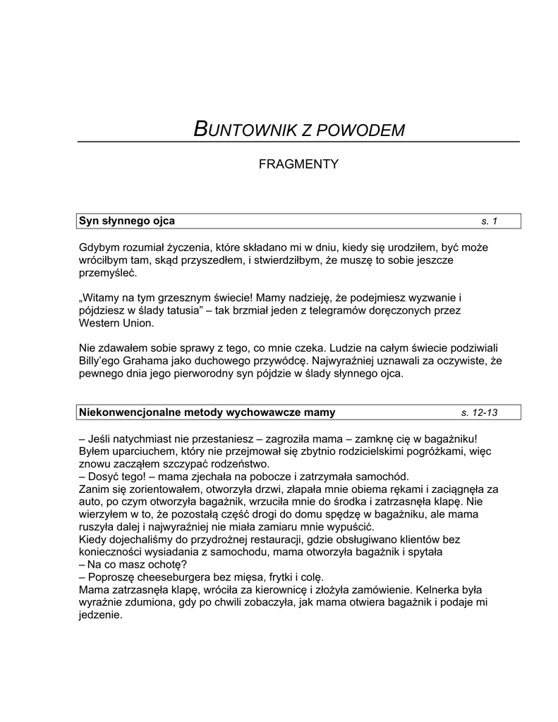 BUNTOWNIK Z POWODEM FRAGMENTY Syn słynnego ojca s. 1 Gdybym rozumiał życzenia, które składano mi w dniu, kiedy się urodziłem, być może wróciłbym tam, skąd przyszedłem, i stwierdziłbym, że muszę to sobie jeszcze przemyśleć. „Witamy na tym grzesznym świecie! Mamy nadzieję, że podejmiesz wyzwanie i pójdziesz w ślady tatusia” – tak brzmiał jeden z telegramów doręczonych przez Western Union. Nie zdawałem sobie sprawy z tego, co mnie czeka. Ludzie na całym świecie podziwiali Billy’ego Grahama jako duchowego przywódcę. Najwyraźniej uznawali za oczywiste, że pewnego dnia jego pierworodny syn pójdzie w ślady słynnego ojca. Niekonwencjonalne metody wychowawcze mamy s. 12-13 – Jeśli natychmiast nie przestaniesz – zagroziła mama – zamknę cię w bagażniku! Byłem uparciuchem, który nie przejmował się zbytnio rodzicielskimi pogróżkami, więc znowu zacząłem szczypać rodzeństwo. – Dosyć tego! – mama zjechała na pobocze i zatrzymała samochód. Zanim się zorientowałem, otworzyła drzwi, złapała mnie obiema rękami i zaciągnęła za auto, po czym otworzyła bagażnik, wrzuciła mnie do środka i zatrzasnęła klapę. Nie wierzyłem w to, że pozostałą część drogi do domu spędzę w bagażniku, ale mama ruszyła dalej i najwyraźniej nie miała zamiaru mnie wypuścić. Kiedy dojechaliśmy do przydrożnej restauracji, gdzie obsługiwano klientów bez konieczności wysiadania z samochodu, mama otworzyła bagażnik i spytała – Na co masz ochotę? – Poproszę cheeseburgera bez mięsa, frytki i colę. Mama zatrzasnęła klapę, wróciła za kierownicę i złożyła zamówienie. Kelnerka była wyraźnie zdumiona, gdy po chwili zobaczyła, jak mama otwiera bagażnik i podaje mi jedzenie. Buntownik z powodem – fragmenty / s. 2 Papierosy w szkolnym internacie s. 39 W drugiej klasie szkoły średniej zakwaterowano mnie w jednoosobowym pokoju na trzecim piętrze internatu, tuż nad szkolną kuchnią. W niewielkim pokoiku mieściło się tylko jedno łóżko. Położenie pokoju miało pewną zaletę, która idealnie odpowiadała moim potrzebom. Odkryłem, że okno prowadzi na wąski dach. Wspiąwszy się nań, chowałem się za dużym kominem, gdzie mogłem palić papierosy do woli, nie obawiając się, że ktoś mnie wypatrzy. Koledzy-palacze szybko odkryli moją kryjówkę. Wymykali się do mnie i wychodzili przez okno na dach budynku. Zastanawiałem się, czy ten podejrzany łańcuszek gości w moim pokoju nie wzbudzi podejrzeń i czy ktoś nie doniesie na mnie władzom szkolnym, ale nie przejmowałem się tym zbytnio. Nonszalancką przekorę w podejściu do „prawa” uznawałem za formę rozrywki. Nie zdawałem sobie sprawy z tego, że stopniowo staję się coraz bardziej zbuntowany. W głębi serca żywiłem żal do losu za to, że muszę chodzić do szkoły z internatem, daleko od domu. Łamiąc zasady takie jak zakaz palenia, na swój sposób wyrażałem te uczucia. Wyrzucony z uczelni chrześcijańskiej s. 106 Wszedłem do gabinetu dziekana i zobaczyłem jego marsowe oblicze. – Nie możemy tolerować takiego zachowania, Franklinie – powiedział, gdy już usiadłem. – To jest uczelnia chrześcijańska. Przekroczyłeś dozwolone granice. Tak się kończy igranie z zasadami. To, jak się nazywasz, nie ma znaczenia. Wyczerpałeś limit ostrzeżeń. Wiedziałem, do czego zmierza. – Musisz opuścić szkołę, Franklinie. Już powiadomiłem twoich rodziców – obwieścił ponurym tonem. Jakim prawem! Czy poinformowanie rodziców nie należało do mnie? Ale nie protestowałem – wiedziałem, że nic mi już nie pomoże. Czy w końcu spotkało mnie to, na co zasłużyłem? Chyba tak. Pogodziłem się z kompromitacją i spakowałem walizki. Jednak przygotowując się do wyjazdu z LeTourneau, czułem narastający gniew. Rozmowę dziekana z rodzicami za moimi plecami uznałem za zdradę. Do ukończenia semestru brakowało mi raptem dwóch tygodni. A teraz cała moja ciężka praca poszła na marne. Buntownik z powodem – fragmenty / s. 3 Pod ostrzałem s. 197-198 Przeskoczyłem przez niewielki korytarz i skuliłem się pod schodami obok Samiego Daghera. Ułamek sekundy później budynkiem wstrząsnął kolejny wybuch. Eksplodujący pocisk obrócił żelbetową konstrukcję w zwały gruzu. Byłem pewien, że następny pocisk trafi w naszą kryjówkę. Serce podeszło mi do gardła na myśl o tym, że za chwilę zostaniemy przysypani przez stertę betonu i stali. (…) Kiedy klęczeliśmy pod schodami, Sami spytał: – Bracie, czy sądzisz, że jesteś tutaj zgodnie z wolą Bożą? Kolejne pociski mijały nas niemal o włos, więc zastanawiałem się nad odpowiedzią – ale tylko przez chwilę. Byłem pewien, że znalazłem się dokładnie w tym miejscu, w którym chciał mnie postawić Bóg. Generał Schwarzkopf o naszej operacji „Pustynny ratunek” s. 240-241 W swojej autobiografii Nie trzeba bohatera generał Norman Schwarzkopf wspomina o naszej działalności jako jedynej, która miała charakter religijny: Obawa Saudyjczyków przed indoktrynacją religijną wydawała mi się przesadna, choć zrozumiała. W kilku przypadkach ich zastrzeżenia nie były bezpodstawne. Członkowie Samaritan’s Purse – fundamentalistycznej grupy chrześcijańskiej z Karoliny Północnej – wymyślili sobie, że wyślą naszym żołnierzom egzemplarze Nowego Testamentu po arabsku. Do każdej książki dołączony był krótki list: „Oto egzemplarz Nowego Testamentu…” Pewnego dnia Khalid, dowódca królewskiej obrony przeciwlotniczej, wręczył mi jeden z egzemplarzy. „O co tutaj chodzi?” – spytał łagodnie. Nie musiał protestować – wiedział, że sam będę tym zaniepokojony. Pomoc ofiarom gwałtu w Bośni s. 276-278 Spytał mnie: – Panie Graham, czy mogę panu pokazać nagranie z kasety wideo? W pobliżu eksplodował kolejny pocisk – bum! Serce waliło mi jak młot. Jednak kaznodzieja nawet nie drgnął. – Widzi