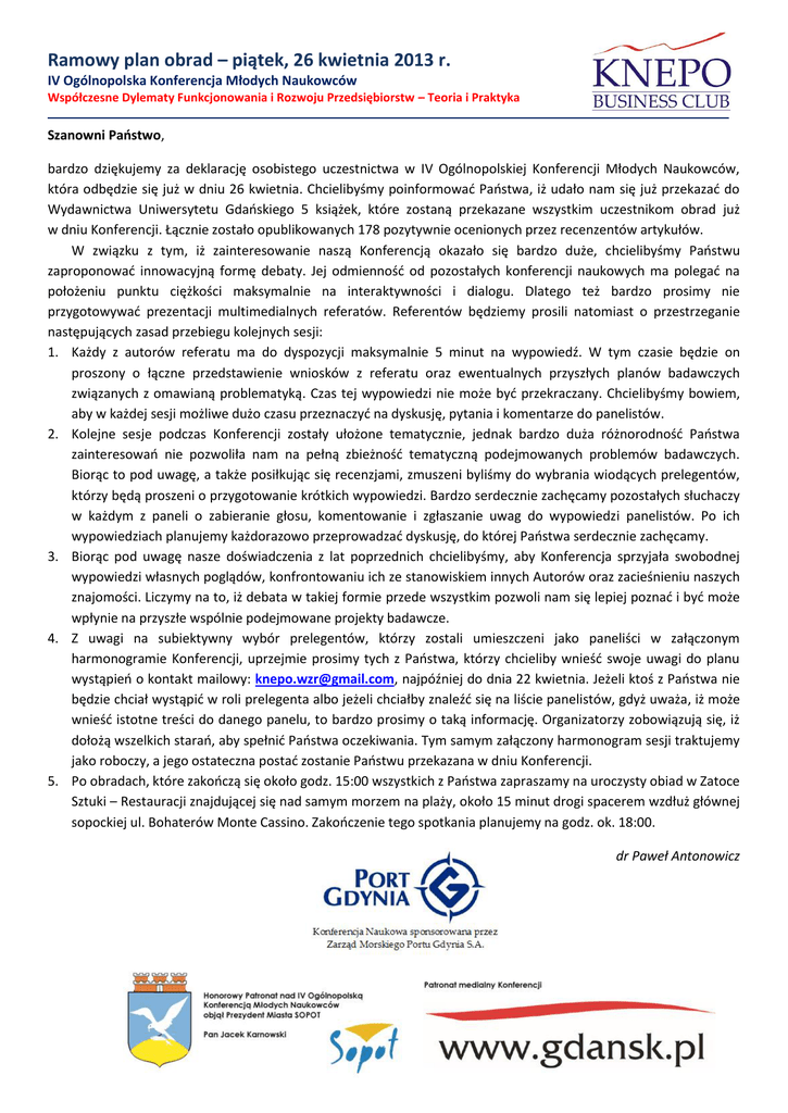 Ramowy plan obrad – piątek, 26 kwietnia 2013 r. IV Ogólnopolska Konferencja Młodych Naukowców Współczesne Dylematy Funkcjonowania i Rozwoju Przedsiębiorstw – Teoria i Praktyka Szanowni Państwo, bardzo dziękujemy za deklarację osobistego uczestnictwa w IV Ogólnopolskiej Konferencji Młodych Naukowców, która odbędzie się już w dniu 26 kwietnia. Chcielibyśmy poinformować Państwa, iż udało nam się już przekazać do Wydawnictwa Uniwersytetu Gdańskiego 5 książek, które zostaną przekazane wszystkim uczestnikom obrad już w dniu Konferencji. Łącznie zostało opublikowanych 178 pozytywnie ocenionych przez recenzentów artykułów. W związku z tym, iż zainteresowanie naszą Konferencją okazało się bardzo duże, chcielibyśmy Państwu zaproponować innowacyjną formę debaty. Jej odmienność od pozostałych konferencji naukowych ma polegać na położeniu punktu ciężkości maksymalnie na interaktywności i dialogu. Dlatego też bardzo prosimy nie przygotowywać prezentacji multimedialnych referatów. Referentów będziemy prosili natomiast o przestrzeganie następujących zasad przebiegu kolejnych sesji: 1. Każdy z autorów referatu ma do dyspozycji maksymalnie 5 minut na wypowiedź. W tym czasie będzie on proszony o łączne przedstawienie wniosków z referatu oraz ewentualnych przyszłych planów badawczych związanych z omawianą problematyką. Czas tej wypowiedzi nie może być przekraczany. Chcielibyśmy bowiem, aby w każdej sesji możliwe dużo czasu przeznaczyć na dyskusję, pytania i komentarze do panelistów. 2. Kolejne sesje podczas Konferencji zostały ułożone tematycznie, jednak bardzo duża różnorodność Państwa zainteresowań nie pozwoliła nam na pełną zbieżność tematyczną podejmowanych problemów badawczych. Biorąc to pod uwagę, a także posiłkując się recenzjami, zmuszeni byliśmy do wybrania wiodących prelegentów, którzy będą proszeni o przygotowanie krótkich wypowiedzi. Bardzo serdecznie zachęcamy pozostałych słuchaczy w każdym z paneli o zabieranie głosu, komentowanie i zgłaszanie uwag do wypowiedzi panelistów. Po ich wypowiedziach planujemy każdorazowo przeprowadzać dyskusję, do której Państwa serdecznie zachęcamy. 3. Biorąc pod uwagę nasze doświadczenia z lat poprzednich chcielibyśmy, aby Konferencja sprzyjała swobodnej wypowiedzi własnych poglądów, konfrontowaniu ich ze stanowiskiem innych Autorów oraz zacieśnieniu naszych znajomości. Liczymy na to, iż debata w takiej formie przede wszystkim pozwoli nam się lepiej poznać i być może wpłynie na przyszłe wspólnie podejmowane projekty badawcze. 4. Z uwagi na subiektywny wybór prelegentów, którzy zostali umieszczeni jako paneliści w załączonym harmonogramie Konferencji, uprzejmie prosimy tych z Państwa, którzy chcieliby wnieść swoje uwagi do planu wystąpień o kontakt mailowy: [email protected], najpóźniej do dnia 22 kwietnia. Jeżeli ktoś z Państwa nie będzie chciał wystąpić w roli prelegenta albo jeżeli chciałby znaleźć się na liście panelistów, gdyż uważa, iż może wnieść istotne treści do danego panelu, to bardzo prosimy o taką informację. Organizatorzy zobowiązują się, iż dołożą wszelkich starań, aby spełnić Państwa oczekiwania. Tym samym załączony harmonogram sesji traktujemy jako roboczy, a jego ostateczna postać zostanie Państwu przekazana w dniu Konferencji. 5. Po obradach, które zakończą się około godz. 15:00 wszystkich z Państwa zapraszamy na uroczysty obiad w Zatoce Sztuki – Restauracji znajdującej się nad samym morzem na plaży, około 15 minut drogi spacerem wzdłuż głównej sopockiej ul. Bohaterów Monte Cassino. Zakończenie tego spotkania planujemy na godz. ok. 18:00. dr Paweł Antonowicz Ramowy plan obrad – piątek, 26 kwietnia 2013 r. IV Ogólnopolska Konferencja Młodych Naukowców Współczesne Dylematy Funkcjonowania i Rozwoju Przedsiębiorstw – Teoria i Praktyka Godz. 8:00 – 8:45 Godz. 9:00 – 9:15 Dr rejestracja (Budynek Główny Wydziału Zarządzania UG), ul. Armii Krajowej 101, SOPOT otwarcie obrad: dr Paweł Antonowicz – powitanie Gości prof. dr hab. Jerzy Bieliński – Dziekan Wydziału Zarządzania UG – otwarcie obrad Godz. 9:20 – 10:20 Pierwsza Sesja Plenarna Upadłości przedsiębiorstw, finanse i ryzyko w działalności gospodarczej Antonowicz Szreder Szarmach Śmiglak-Krajewska 1. Teoria i praktyka funkcjonowania piramidy finansowej versus studium przypadku upadłości Amber Gold Sp. z o.o. 2. Spektakularne upadłości przedsiębiorstw FMCG w Polsce w 2012 r. na przykładzie wybranych podmiotów Grupy Kapitałowej BOMI S.A. Dr inż. Paweł Piotr Łukasz Magdalena Mgr Adam Waszkowski Wielomianowe modele zagrożenia finansowego przedsiębiorstw Mgr Sebastian Tomczak Analiza wskaźników finansowych w sektorze produkcji żywności w Polsce w okresie 2000-2011 Dr Dr Dr Joanna Joanna Anna Florek Stanisławska Olkiewicz Klasyfikacja branż sektora przemysłu spożywczego według ich sytuacji finansowej Dr inż. Piotr Figura Sektorowe zróżnicowanie płynności finansowej przedsiębiorstw Zastosowanie wybranych modeli analizy dyskryminacyjnej do prognozowania zagrożenia upadłością przedsiębiorstw produkujących pasze Ryzyko transakcyjne w działalności przedsiębiorstwa oraz wybrane metody jego ograniczania Godz. 10:20 – 11:20 Druga Sesja Plenarna Analizy sektorowe, case study Dr Jadwiga Kaczmarska-Krawczak Zarządzanie informatyzacją w procesach restrukturyzacji jednostek ochrony zdrowia Dr Joanna Łuczak Problematyka decyzji menedżerskich w organizacji publicznej na przykładzie policjantów podejmujących decyzje kierownicze Dr Joanna Dyczkowska E -operator logistyczny – technologia cyfrowa w sektorze TSL Dr inż. Tomasz Rokicki Znaczenie logistyki dla funkcjonowania i rozwoju przedsiębiorstw agrobiznesu Mgr Mariusz Rogalski Dlaczego koopetycja „się opłaca” – case study Marcin Lempart Analiza porównawcza 