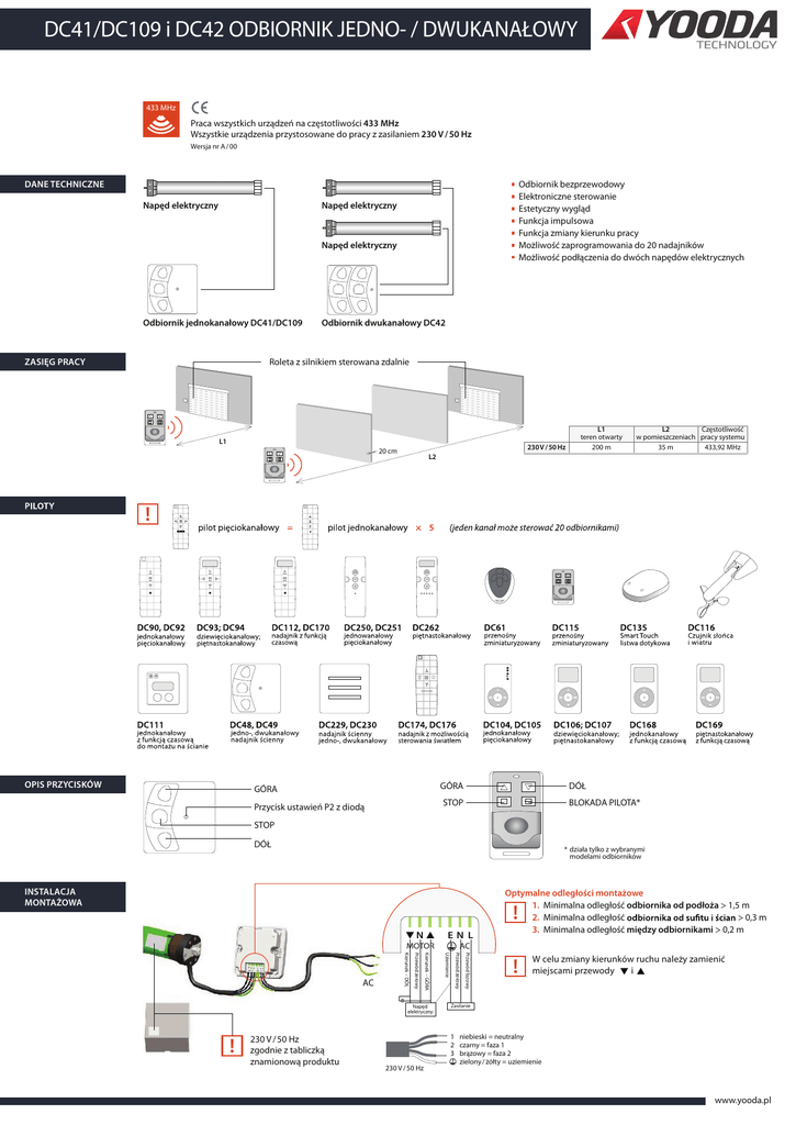 DC41/DC109 i DC42 ODBIORNIK JEDNO- / DWUKANAŁOWY 433 MHz Praca wszystkich urządzeń na częstotliwości 433 MHz Wszystkie urządzenia przystosowane do pracy z zasilaniem 230 V / 50 Hz Wersja nr A / 00 DANE TECHNICZNE Napęd elektryczny Odbiornik bezprzewodowy Elektroniczne sterowanie Estetyczny wygląd Funkcja impulsowa Funkcja zmiany kierunku pracy Możliwość zaprogramowania do 20 nadajników Możliwość podłączenia do dwóch napędów elektrycznych Napęd elektryczny Napęd elektryczny Odbiornik jednokanałowy DC41/DC109 ZASIĘG PRACY Odbiornik dwukanałowy DC42 Roleta z silnikiem sterowana zdalnie L1 230V / 50 Hz 20 cm OPIS PRZYCISKÓW L1 teren otwarty 200 m L2 Częstotliwość w pomieszczeniach pracy systemu 35 m 433,92 MHz L2 GÓRA GÓRA DÓŁ STOP Przycisk ustawień P2 z diodą BLOKADA PILOTA* STOP DÓŁ * działa tylko z wybranymi modelami odbiorników INSTALACJA MONTAŻOWA Optymalne odległości montażowe 1. Minimalna odległość odbiornika od podłoża > 1,5 m 2. Minimalna odległość > 0,3 m 3. Minimalna odległość między odbiornikami > 0,2 m ! N EN L MOTOR 230 V / 50 Hz zgodnie z tabliczką znamionową produktu 230 V / 50 Hz Przewód fazowy ! Przewód zerowy Napęd elektryczny Uziemienie Kierunek – GÓRA Przewód zerowy Kierunek – DÓŁ AC AC ! W celu zmiany kierunków ruchu należy zamienić miejscami przewody i Zasilanie 1 niebieski = neutralny 2 czarny = faza 1 3 brązowy = faza 2 zielony / żółty = uziemienie www.yooda.pl DC41/DC109 i DC42 ODBIORNIK JEDNO- / DWUKANAŁOWY PROGRAMOWANIE: DODANIE NADAJNIKA ! Dłuższa niż 10 sekund przerwa między kolejnymi wciśnięciami przycisku spowoduje automatyczne wyjście bez zapisania wprowadzonych zmian. Odbiornik może zapisać w pamięci do 20 nadajników różnego typu. OK Włączyć zasilanie USUNIĘCIE NADAJNIKA Z PAMIĘCI Wcisnąć przycisk P2 Dioda błyska w krótkich odstępach czasu Wciśnięcie przycisku STOP powoduje zaświecenie się diody na stałe Wcisnąć przycisk GÓRA na pilocie Dioda błyska i gaśnie A + B A B OK A Wcisnąć przycisk P2 USUNIĘCIE WSZYSTKICH NADAJNIKÓW Nadajnik został zapisany w pamięci ! Dioda błyska w krótkich odstępach czasu Wciśnięcie przycisku Wcisnąć przycisk STOP powoduje DÓŁ na pilocie B zaświecenie się diody na stałe Dioda błyska i gaśnie A Zatwierdzenie wykasowania jednego nadajnika B Odbiornik może zapisać w pamięci do 20 nadajników różnego typu. B B OK Wcisnąć i przytrzymać przez 6 sekund przyciski STOP oraz DÓŁ USTAWIENIE RUCHU IMPULSOWEGO ! Dioda błyska i gaśnie A Zatwierdzenie wykasowania wszystkich nadajników z pamięci Ponowne wykonanie kombinacji anuluje funkcję. OK Wcisnąć i przytrzymać przez 6 sekund przyciski STOP oraz GÓRA REGULACJA GÓRNEGO WYŁĄCZNIKA KRAŃCOWEGO ! Dioda błyska i gaśnie Zatwierdzenie zmian Jeżeli napęd nie działa, nie należy regulować czerwonego ani białego pokrętła. OK Wcisnąć przycisk GÓRA REGULACJA DOLNEGO WYŁĄCZNIKA KRAŃCOWEGO ! Używając regulatora oraz białego pokrętła „+” zwiększyć zakres podnoszenia rolety Gdy podnoszona roleta osiągnie wymaganą wysokość przestać używać białego pokrętła i nacisnąć przycisk STOP na nadajniku Zakończenie ustawień górnego wyłącznika krańcowego Jeżeli napęd nie działa, nie należy regulować czerwonego ani białego pokrętła. OK Wcisnąć przycisk DÓŁ Używając regulatora oraz czerwonego pokrętła „+” zwiększyć zakres opuszczania rolety Gdy opuszczana roleta osiągnie Zakończenie ustawień dolnego wymaganą wysokość przestać wyłącznika krańcowego używać czerwonego pokrętła i nacisnąć przycisk STOP na nadajniku www.yooda.pl