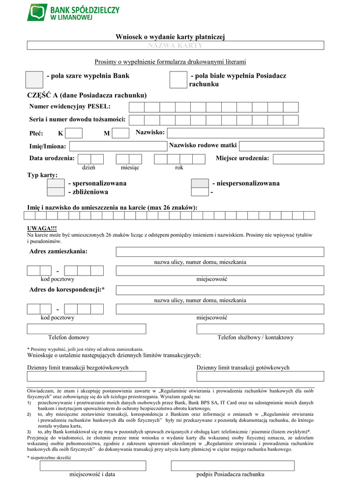 Wniosek o wydanie karty płatniczej NAZWA KARTY Prosimy o wypełnienie formularza drukowanymi literami - pola szare wypełnia Bank - pola białe wypełnia Posiadacz rachunku CZĘŚĆ A (dane Posiadacza rachunku) Numer ewidencyjny PESEL: Seria i numer dowodu tożsamości: K Płeć: Nazwisko: M Nazwisko rodowe matki Imię/Imiona: Data urodzenia: Miejsce urodzenia: dzień miesiąc rok Typ karty: - spersonalizowana - zbliżeniowa - niespersonalizowana - Imię i nazwisko do umieszczenia na karcie (max 26 znaków): UWAGA!!! Na karcie może być umieszczonych 26 znaków licząc z odstępem pomiędzy imieniem i nazwiskiem. Prosimy nie wpisywać tytułów i pseudonimów. Adres zamieszkania: nazwa ulicy, numer domu, mieszkania kod pocztowy miejscowość Adres do korespondencji:* nazwa ulicy, numer domu, mieszkania kod pocztowy miejscowość Telefon służbowy / kontaktowy Telefon domowy * Prosimy wypełnić, jeśli jest różny od adresu zamieszkania. Wnioskuje o ustalenie następujących dziennych limitów transakcyjnych: Dzienny limit transakcji bezgotówkowych Dzienny limit transakcji gotówkowych Oświadczam, że znam i akceptuję postanowienia zawarte w „Regulaminie otwierania i prowadzenia rachunków bankowych dla osób fizycznych” oraz zobowiązuję się do ich ścisłego przestrzegania. Wyrażam zgodę na: 1) przechowywanie i przetwarzanie moich danych osobowych przez Bank, Bank BPS SA, IT Card oraz na udostępnienie moich danych bankom i instytucjom upoważnionym do ochrony bezpieczeństwa obrotu kartowego, 2) to, aby miesięczne zestawienie transakcji, korespondencja z Bankiem oraz informacje o zmianach w „Regulaminie otwierania i prowadzenia rachunków bankowych dla osób fizycznych” były mi przekazywane z pozostałą dokumentacją rachunku, do którego została wydana karta, 3) to, aby Bank kontaktował się ze mną w pozostałych sprawach związanych z obsługą kart: telefonicznie / pisemnie (listem zwykłym)*. Przyjmuję do wiadomości, że złożenie przeze mnie wniosku o wydanie karty dla wskazanej osoby fizycznej oznacza, ze udzielam wskazanej osobie pełnomocnictwa, zgodnie z zakresem uprawnień określonym w „Regulaminie otwierania i prowadzenia rachunków bankowych dla osób fizycznych” do dokonywania transakcji przy użyciu karty płatniczej w ciężar mojego rachunku bankowego. * niepotrzebne skreślić miejscowość i data podpis Posiadacza rachunku CZĘŚĆ B (dane Użytkownika karty) Numer ewidencyjny PESEL: Seria i numer dowodu tożsamości: K Płeć: Nazwisko: M Nazwisko rodowe matki Imię/Imiona: Data urodzenia: Miejsce urodzenia: dzień miesiąc rok Typ karty: - spersonalizowana - zbliżeniowa - niespersonalizowana - Imię i nazwisko do umieszczenia na karcie (max 26 znaków): UWAGA!!! Na karcie może być umieszczonych 26 znaków licząc z odstępem pomiędzy imieniem i nazwiskiem. Prosimy nie wpisywać tytułów i pseudonimów. Adres zamieszkania: nazwa ulicy, numer domu, mieszkania kod pocztowy miejscowość Adres do korespondencji:* nazwa ulicy, numer domu, mieszkania kod pocztowy miejscowość Telefon służbowy / kontaktowy Telefon domowy * Prosimy wypełnić, jeśli jest różny od adresu zamieszkania. Wnioskuje o ustalenie następujących dziennych limitów transakcyjnych: Dzienny limit transakcji bezgotówkowych Dzienny limit transakcji gotówkowych Użytkownik karty oświadcza, że: 1) przyjmuje do wiadomości, że zgodnie z art. 23 ust. 1 pkt 3 Ustawy o ochronie danych osobowych z dnia 29 sierpnia 1997 r., (Dz. U. z 2002 r., Nr 101, poz. 926 z późn. zm.), Bank Spółdzielczy w Limanowej z siedzibą w 34-600 Limanowa, ul. Rynek 7, jako Administrator Danych ma prawo przetwarzania jego danych osobowych w celu wykonywania Umowy; 2) przyjmuje do wiadomości, że przysługuje mu prawo dostępu do treści podanych danych osobowych oraz możliwość ich poprawiania; 3) dobrowolnie wyraża zgodę/nie wyraża zgody* na przetwarzanie jego danych osobowych przez Bank w celu marketingu produktów własnych Banku; 4) dobrowolnie wyraża zgodę/nie wyraża zgody* na przesyłanie informacji handlowej za pomocą środków komunikacji elektronicznej w rozumieniu Ustawy o świadczeniu usług drogą elektroniczną z dnia 18 lipca 2002 r. (Dz. U. z 2002 r., Nr 144, poz. 1204 z późn. zm.)w tym celu wskazuje adres poczty elektronicznej:……………………..…………; 5) dobrowolnie wyraża zgodę/nie wyraża zgody* na automatyczne przetwarzanie danych, mających na celu ocenę pewnych cech osobowych, dokonywanie analizy zachowania, sytuacji ekonomicznej, preferencji i wiarygodności w celu przedkładania oferty usług spersonalizowanych. miejscowość i data podpis Użytkownika karty WYPEŁNIA PLACÓWKA SPRZEDAŻOWA BANKU Data przyjęcia wniosku stempel kasowo-memoriałowy i podpis pracownika przyjmującego wniosek Karta wydana do rachunku (pełny numer) Nr karty Decyzja Banku ...................................................................................................................................................................... ...................................................................................................................................................................... ...................................................................................................................................................................... ...................................................................................................................................................................... ..................................................................................................................................................................... miejscowość i data podpis i stempel kasowo-memoriałowy/pieczątka imienna upoważnionego pracownika Adnotacje ........................................................................................................................................................