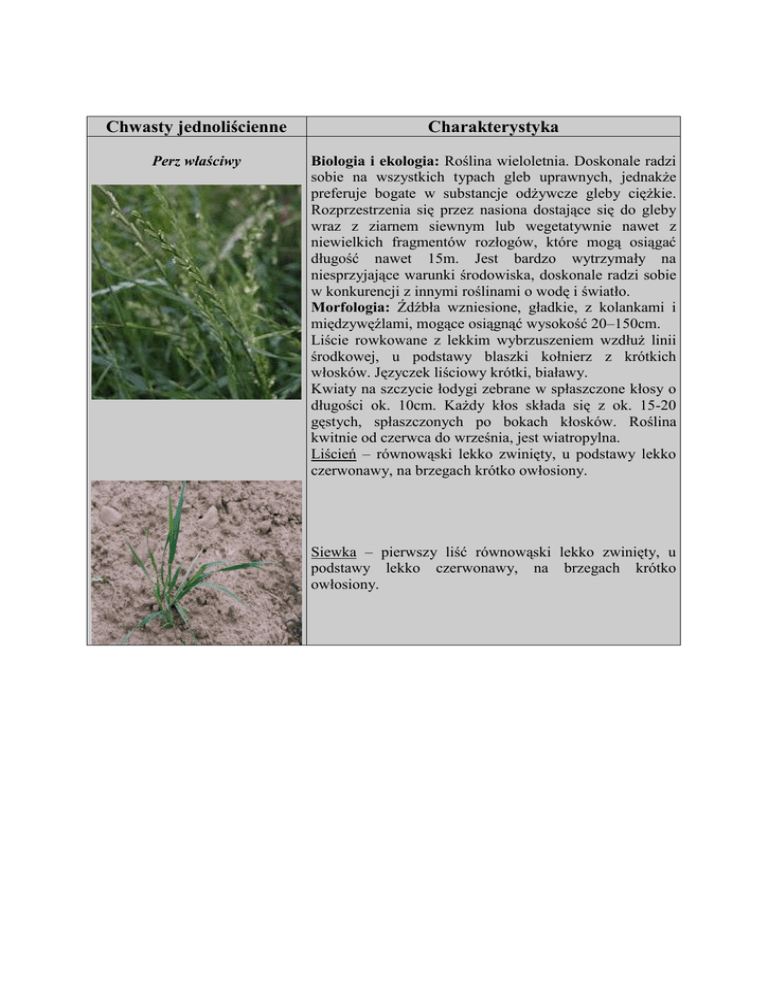 Chwasty jednoliścienne Charakterystyka Perz właściwy Biologia i ekologia: Roślina wieloletnia. Doskonale radzi sobie na wszystkich typach gleb uprawnych, jednakże preferuje bogate w substancje odżywcze gleby ciężkie. Rozprzestrzenia się przez nasiona dostające się do gleby wraz z ziarnem siewnym lub wegetatywnie nawet z niewielkich fragmentów rozłogów, które mogą osiągać długość nawet 15m. Jest bardzo wytrzymały na niesprzyjające warunki środowiska, doskonale radzi sobie w konkurencji z innymi roślinami o wodę i światło. Morfologia: Źdźbła wzniesione, gładkie, z kolankami i międzywęźlami, mogące osiągnąć wysokość 20–150cm. Liście rowkowane z lekkim wybrzuszeniem wzdłuż linii środkowej, u podstawy blaszki kołnierz z krótkich włosków. Języczek liściowy krótki, białawy. Kwiaty na szczycie łodygi zebrane w spłaszczone kłosy o długości ok. 10cm. Każdy kłos składa się z ok. 15-20 gęstych, spłaszczonych po bokach kłosków. Roślina kwitnie od czerwca do września, jest wiatropylna. Liścień – równowąski lekko zwinięty, u podstawy lekko czerwonawy, na brzegach krótko owłosiony. Siewka – pierwszy liść równowąski lekko zwinięty, u podstawy lekko czerwonawy, na brzegach krótko owłosiony. Chwastnica jednostronna Biologia i ekologia: Roślina jednoroczna, ciepłolubna, kiełkująca wczesnym latem. Preferuje gleby gliniaste, nieco wilgotne, żyzne i zasobne w azot i wapń. Próg szkodliwości wynosi 3-6 roślin na 1m² Morfologia: Łodyga podnosząca się, u dołu fiołkowo zabarwiona. Źdźbła o wysokości 30-70(90)cm. Liście szerokie, nieco pofalowane. Pochwy liściowe nieco spłaszczone i bez języczka. Kwiaty zebrane w gęstą, jednostronną wiechę. Wiecha ma szorstkie i owłosione gałązki. Gęsto skupione kłoski są jasnozielone z fioletowym odcieniem. Wyrastają jednostronnie po 3-6 na jednej gałązce wiechy. Kwitnie od lipca do października. Siewka - ma równowąski i zaostrzony na szczycie epikotyl z licznymi równoległymi nerwami. Siewka – pierwszy liść równowąski i zaostrzony na szczycie z licznymi równoległymi nerwami. Pochwa liściowa spłaszczona, w odcieniu brunatna. Włośnica zielona Biologia i ekologia: Roślina jednoroczna, ciepłolubna, kiełkująca późną wiosną. Lubi gleby bogate w substancje odżywcze, lekkie, ciepłe gleby gliniaste o niskiej zawartości wapna. Morfologia: Roślina tworzy gęste kępy. Źdźbła cienkie, podnoszące się, u nasady rozgałęzione, dorasta od 540cm. Źdźbło rozszerza się w górnej części i jest szorstkie. Część pomiędzy pochwą liściową, a blaszką jest okryta cienkimi i długimi włoskami. Liście lancetowate, równowąskie, z niebieskim nalotem, z włoskami przy pochwach. Górna część blaszki liściowej szorstka, dolna – mniej szorstka. Kłoski zebrane w zbitą wiechę walcowatego kształtu. Wiecha trochę zwisająca, a w dolnej części nieco przerywana. Oś kłoska owłosiona, pod kłoskiem szorstkie szczeciny, zielone lub fioletowe. Kwitnie od lipca do września. Kłoski odpadają od wiechy w całości. Pierwszy liść - zwinięty, spiczastojajowaty, błona liścia zastąpiona kołnierzem z delikatnych włosków. Siewka - pierwszy liść zwinięty, spiczastojajowaty, błona liścia zastąpiona kołnierzem z delikatnych włosków. Palusznik krwawy Biologia i ekologia: Roślina jednoroczna, ciepłolubna, bardzo często z czerwonym lub fioletowym odcieniem. Kwitnie od lipca do października. Źdźbła w dolnych węzłach zakorzeniają się. Preferuje gleby lekkie, bogate w substancje odżywcze o niskiej zawartości wapna. Unika gleb zwięzłych i miejsc suchych. Morfologia: Roślina tworzy luźne kępy. Cała roślina jest zwykle czerwonawo przebarwiona. Źdźbło o długości 15-50 (70) cm, podzielone na 4-9 międzywęźli, pokładające się lub łukowato wznoszące. Blaszki liściowe delikatne. Na spodniej stronie owłosione. Środkowy nerw i dwa brzeżne białawe, brzegi liścia faliste. Pochwy liściowe owłosione miękko, zamknięte. Języczek błoniasty, krótki i tępy. Kwiaty zebrane w 5-10 kłosów palczasto wyrastających na szczycie źdźbła. Zwykle fioletowo zabarwione, podłużnie lancetowate, ostre kłoski wyrastają parami (rzadziej do 5 na krótkiej gałązce). Każdy z nich ma 3 plewy, przy czym druga, o połowę krótsza od trzeciej, ma owłosiony szczyt, a trzecia brzegi. Wyczyniec polny Biologia i ekologia: Roślina jednoroczna, lub dwuletnia/wieloletnia. Kiełkuje przeważnie jesienią, ale również i wiosną. Występuje na glebach średnich do ciężkich, wilgotnych, zasobnych w wapń. Morfologia: Trawa rozłogowa tworząca luźne kępy. Liście wąskie o ostrych brzegach. Brak uszka. Błona liścia długa, często czerwonawa, grubo i nieregularnie poszarpana. Kwiatostanem jest kłosokształtna wiecha. Liścień - drobny o nagiej wąskiej blaszce, u podstawy często czerwonawy, skręcony. Siewka – pierwszy liść drobny o nagiej wąskiej blaszce, u podstawy często czerwonawy, skręcony. Wiechlina roczna Biologia i ekologia: Roślina jednoroczna, lub dwuletnia, a czasami nawet wieloletnia, zimotrwała. Przy ziemi rozgałęziona i tworząca gęstą darń. Wytwarza również rozłogi. Preferuje lekkowilgotne i bogate w azot gleby. Morfologia: Źdźbła wzniesione lub podnoszące się, o wysokości 5-35cm, gładkie. Blaszka liściowa pofałdowana, wierzchnia strona matowa do lekko połyskującej, spodnia strona matowa. Pierwszy liść drobny, krótki. Języczki dolnych liści są krótkie i tępe, górnych zaś spiczaste i dłuższe. Kłoski zebrane w rozpierzchłą, jednostronną wiechę. Gałązki wiechy są gładkie, w dolnej części zwykle po dwie. Jajowatego kształtu kłoski osadzone na szypułkach, składające się z 3-7 kwiatów. Kłoski wyrastają już od samej prawie podstawy gałązek. Kwitnie przez cały sezon wegetacyjny. Siewka - pierwszy liść drobny, krótki, na szczycie zwężający s