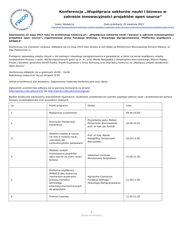 Konferencja „Współpraca sektorów nauki i biznesu w zakresie innowacyjności projektów open source” Autor: Redakcja Data publikacji: 25 kwietnia 2013 http://www.fwioo.pl/article/konferencja-naukowa-wspolpraca-sektorow-nauki-i-biznesu-w-zakresie-innowacyjnosci-projektow-open-source Zapraszamy 22 maja 2013 roku na konferencję naukową pt.: „Współpraca sektorów nauki i biznesu w zakresie innowacyjności projektów open source”, organizowaną przez Fundację Wolnego i Otwartego Oprogramowania "Platforma współpracy – SPINACZ". Konferencja ma charakter naukowy. Odbędzie się 22 maja 2013 roku (środa) w Auli Małej na Politechnice Warszawskiej (Gmach Główny, ul. Plac Politechniki 1). Prelegenci opowiedzą między innymi o roli wolnego i otwartego oprogramowania w gospodarce, a także na temat współpracy między środowiskiem biznesu i nauki. Wśród zaproszonych gości są m. in.: prof. Marek Niezgódka z Uniwersytetu Warszawskiego, Marcin Madey Prezes i Dyrektor generalny Novell Polska, Marek Szyprowski z firmy Samsung oraz zwycięzcy konkursu na „Najlepszy projekt akademicki Open Source”. Konferencja odbędzie się w godzinach 10.00 – 16.00. Rejestracja rozpocznie się już od godz. 9.30. Udział w konferencji jest bezpłatny. Zapewniamy materiały konferencyjne oraz obiad. Zgłoszenie uczestnictwa odbywa się za pomocą formularza na stronie: http://spinacz.edu.pl/event/3/ lub http://spinacz.edu.pl/events/signup/. Bardzo serdecznie zapraszamy pracowników naukowych, studentów, przedstawicieli szeroko pojętego sektora nauki i przedstawicieli sektora biznesu, przedsiębiorców oraz wszystkich chętnych. Lp Punkt programu 1 Rejestracja uczestników 2 Uroczysta inauguracja konferencji Przywitanie gości- Rektor Politechniki Warszawskiej, prof. dr hab. Jan Szmidt 10.00-10.25 3 Otwarte modele w nauce: ich rola w rozwoju nauki, znaczenie dla konkurencyjności gospodarki Prof. dr hab. Marek Niezgódka, Uniwersytet Warszawski 10.25-11.00 Sebastian ChristowMinisterstwo Gospodarki 11.00-11.30 Agnieszka Czarnecka, Fundacja Wolnego i Otwartego Oprogramowania 11.30-11.50 4 Osoba Czas 09.30-10.00 Możliwe modele finansowania projektów open source na styku nauki i biznesu 5 Platforma współpracy – SPINACZ jako skuteczny mechanizm wspierania procesu transferu technologii informatyczno-technicznych do gospodarki 6 Przerwa kawowa 11.50-12.20 1 WERSJA DO WYDRUKU 7 Rola innowacji wolnego i otwartego oprogramowania w gospodarce Marcin Madey, Prezes i Dyrektor generalny Novell Sp. z o.o. 12.20-12.50 8 Wielki projekt i wielka firma współpraca firmy Samsung i projektu kernel.org Marek Szyprowski, Project leader - Samsung 12.50-13.20 9 Od edukacji do realizacji otwarta digitalizacja z DigitLabem Adam Dudczak, Poznańskie Centrum Superkomputerowo-Sieciowe 13.20-13.50 10 Zwycięski projekt w konkursie na "Najlepszy projekt akademicki Open Source" 11 Zakończenie konferencji 14.30 12 Obiad 14.40 Mateusz Przybyła, Krzysztof Łakomy, Krzysztof Majorczyk- Politechnika Poznańska 13.50-14.20 Serdecznie zapraszamy! Projekt Internetowa ogólnopolska baza informatycznych projektów badawczych otwartej innowacji - "Platforma współpracy – SPINACZ" realizowany jest w ramach Programu "Kreator innowacyjności - wsparcie innowacyjnej przedsiębiorczości akademickiej" oraz dofinansowany przez Narodowe Centrum Badań i Rozwoju. Za pomocą serwisu przedstawiciele świata nauki i świata biznesu mają okazję nawiązać ze sobą stałą współpracę w zakresie innowacyjnych rozwiązań informatycznych oraz innych kontaktów biznesowych. Zapraszamy na www.spinacz.edu.pl. Pytania prosimy kierować na: adres [email protected] oraz pod numerem telefonu: 61 624 34 74. 2 WERSJA DO WYDRUKU