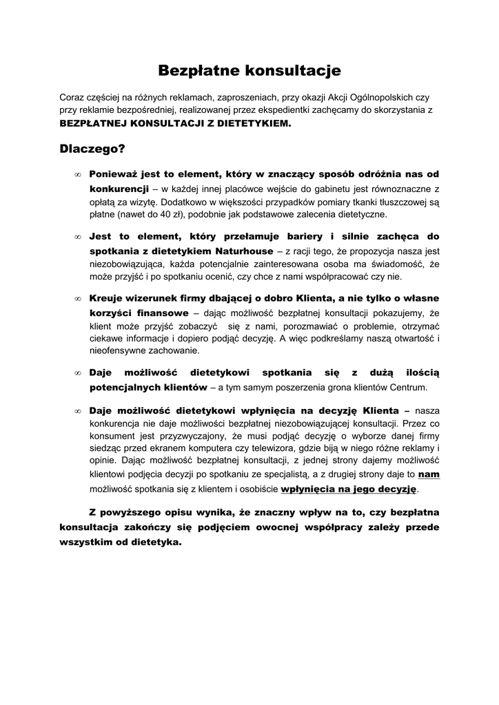 Bezpłatne konsultacje Coraz częściej na różnych reklamach, zaproszeniach, przy okazji Akcji Ogólnopolskich czy przy reklamie bezpośredniej, realizowanej przez ekspedientki zachęcamy do skorzystania z BEZPŁATNEJ KONSULTACJI Z DIETETYKIEM. Dlaczego? • Ponieważ jest to element, który w znaczący sposób odróżnia nas od konkurencji – w każdej innej placówce wejście do gabinetu jest równoznaczne z opłatą za wizytę. Dodatkowo w większości przypadków pomiary tkanki tłuszczowej są płatne (nawet do 40 zł), podobnie jak podstawowe zalecenia dietetyczne. • Jest to element, który przełamuje bariery i silnie zachęca do spotkania z dietetykiem Naturhouse – z racji tego, że propozycja nasza jest niezobowiązująca, każda potencjalnie zainteresowana osoba ma świadomość, że może przyjść i po spotkaniu ocenić, czy chce z nami współpracować czy nie. • Kreuje wizerunek firmy dbającej o dobro Klienta, a nie tylko o własne korzyści finansowe – dając możliwość bezpłatnej konsultacji pokazujemy, że klient może przyjść zobaczyć się z nami, porozmawiać o problemie, otrzymać ciekawe informacje i dopiero podjąć decyzję. A więc podkreślamy naszą otwartość i nieofensywne zachowanie. • Daje możliwość dietetykowi spotkania się z dużą ilością potencjalnych klientów – a tym samym poszerzenia grona klientów Centrum. • Daje możliwość dietetykowi wpłynięcia na decyzję Klienta – nasza konkurencja nie daje możliwości bezpłatnej niezobowiązującej konsultacji. Przez co konsument jest przyzwyczajony, że musi podjąć decyzję o wyborze danej firmy siedząc przed ekranem komputera czy telewizora, gdzie biją w niego różne reklamy i opinie. Dając możliwość bezpłatnej konsultacji, z jednej strony dajemy możliwość klientowi podjęcia decyzji po spotkaniu ze specjalistą, a z drugiej strony daje to nam możliwość spotkania się z klientem i osobiście wpłynięcia na jego decyzję. Z powyższego opisu wynika, że znaczny wpływ na to, czy bezpłatna konsultacja zakończy się podjęciem owocnej współpracy zależy przede wszystkim od dietetyka. Jak zatem powinna wyglądać bezpłatna konsultacja, aby zakończyła się sukcesem? • Przede wszystkim każdy klient bez względu na to, czy deklaruje płatną, czy bezpłatną konsultację powinien być przyjęty według najwyższych standardów obsługi. • To, że deklaruje bezpłatną konsultację nie znaczy, że go nie stać na nasze usługi. Może nam po prostu nie ufać lub sprawdzać naszą ofertę. Potraktowanie go jak Klienta „gorszej kategorii” zaprzepaści możliwość owocnej współpracy, dodatkowo negatywnie wpłynie na jego opinię, którą może podzielić się ze znajomymi. • Rozpoczynając bezpłatną konsultację nie możemy pokazać, że zależy nam na kwestii finansowej, ponieważ zburzy to możliwość nawiązania relacji. Należy pokazać się ze strony specjalisty, który najbardziej interesuje się daną osobą i jej problemem. W taki sposób zdobędziemy zaufanie Klienta i jego przychylne nastawienie. Konsultacja krok po kroku! 1. Uśmiech i przywitanie Klienta. 2. Zapewnienie mu komfortowych warunków: wskazanie gdzie może pozostawić odzienie wierzchnie, zaproponowanie czegoś do picia. 3. Przeprowadzenie krótkiego wywiadu, który otworzy relację z klientem i pozwoli nam odkryć jego problem oraz potrzeby. Przykładowe pytania: W czym mogę Pani pomóc? Jeżeli jest Pani zainteresowana konsultacją i pomiarami to rozumiem, że chciałaby Pani coś zmienić pod względem Diety i żywienia? Czy obecna waga Pani przeszkadza? Czy są inne rzeczy, na których Pani zależy, które chciałaby Pani zmienić? Czy odchudzała się Pani wcześniej? Jakimi sposobami? Czy udawało się uzyskać jakieś rezultaty? Co Pani nie odpowiadało w tych metodach? Jak Pani myśli gdzie tkwi powód niepowodzeń? Itp. 4. Przedstawienie, jak wygląda u nas odchudzanie i, jak możemy pomóc. Przedstawiając ofertę zaczynamy od tego, na czym klientce najbardziej zależy, co w kontekście jej potrzeb jest najcenniejszego w naszej ofercie. 5. Zaproponowanie pomiarów, którymi jest prawdopodobnie najbardziej zainteresowana. Klientka ma się rozebrać, zostać zmierzona i zważona, Następnie należy określić typ budowy oraz dokonać analizy składu ciała. 6. Kolejny krok to omówienie wyników. Wskazanie na kartach BMI, w którym przedziale klientka się znajduje, wskazanie prawidłowej wagi oraz omówienie, ile musiałaby schudnąć, aby jej waga była w przedziale prawidłowej wagi oraz ile ją dzieli od wyższego progu zaawansowania problemu. 7. Propozycja pomocy w osiągnięciu celu. Proszę pamiętać, że celem nie zawsze musi być utrata wagi. Celem może być: nauka zdrowego sposobu odżywiania, wygładzenie cellulitu, wyeliminowanie zaparć i wzdęć, utrata centymetrów itp. 8. Informacja o cenie. Przedstawiamy cenę standardową: ok. 100 zł tygodniowo, jeżeli widzimy rezygnacje klientki, należy dopytać, co jest dla niej przeszkodą i jeżeli jest to cena – zaproponować tańszą kurację. 9. Jeżeli Klientka się decyduje to kontynuujemy wizytę, jeżeli nie, to dajemy materiały informacyjne: karty do akcji, wskazania na lodówkę, książeczki, przepis i polecamy PesoPerfecto! Od początku do końca konsultacji, klient ma być profesjonalnie obsłużony i pożegnany uśmiechem. Jeżeli się nie zdecydował, zawsze może przekazać swoje pozytywne wrażenia innym. W przeciwnym razie swoje zdegustowanie czy rozczarowanie prawdopodobnie przekaże różnymi kanałami: w rozmowie ze znajomymi, na portalach społecznościowych, forum itp.