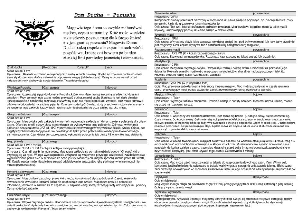 Dom Ducha – Purusha Magowie tego domu to zwykle małomówni mędrcy, często samotnicy. Któż może wiedzieć jakie sekrety posiada mag dla którego śmierć nie jest granicą poznania? Magowie Domu Ducha budzą respekt ale często i strach wśród pospólstwa, kroczą oni bowiem po bardzo cienkiej linii pomiędzy jasnością i ciemnością. Znakjducha jKolorIjbiałyj RunaIj„P”j Yani KosztjczaruIjDjPM OpisjczaruI CzarodziejjzaklinajmocjpieczęcijPurushyjwjznakjrunicznyfjOsobajzejZnakiemjduchajnajczole stajejsię dojzachodujsłońcajcałkowiciejodpornajnajmagię Wtakżejleczącą2fjCzaryjrzuconejnajceljprzed nałożeniemjrunyjzachowują swojejdziałaniefjTrwajdojzmierzchuf WładztwojPurushy jCzarjadepta jMoyoco KosztjczaruIjXjPM OpisjczaruIjCzarodziejjsięgajdojdomenyjPurushy-jktórejjmocjdajejmujograniczoną władzę nadjduszami zmarłychfjPrzyjpomocyjtegojczarujmożnajprzyzwać duchajzmarłejjosobyjWkoniecznejjestjciałojdenata2 ijprzeprowadzić zjnimjkrótką rozmowęfjPrzyzwanyjduchjniejmożejkłamać anijzwodzić-jleczjmożejodmówić udzieleniajodpowiedzijnajzadanejpytaniafjCzarjtenjmożejbyć również użytyjprzeciwkojistotomjeterycznymjG pojrzuceniujtegojzaklęciajkażdyjduchjmusijnatychmiastjoddalić się pozajzasięgjwzrokujmagaf Głosyjzjzaświatów jCzarjadepta jMoyoco KosztjczaruIjDjPM OpisjczaruIjMagjdotykajcelujzaklęciajijwjmyślachjwypowiadajzaklęciejwj którymjzawierajpoleceniejdlajofiary czarufjOfiarajpojchwilijsłyszyjgłosyjnamawiającejdojwykonywaniajtegojpoleceniafjOdmowajwykonania poleceniajoznaczajutratę XPŻ lubj+PŻ wjprzypadkujkapłanów1magów1wojowników ścieżkijKrukafjOfiara-jbez negatywnychjkonsekwencjijpotrafijsię powstrzymać tylkojprzedjpoleceniamijwiodącymijdojewidentnego samozniszczeniafjCzarjdziałajdojrozproszenia-jwykonaniajpoleceniajlubjutratyjPŻ wjwynikujjegojdziałaniaf Krągjprawdy jCzarjmaga jMoyoco KosztjczaruIj+jPMj1jminutę OpisjczaruIjDjPMjój+jPMj1osobę zajkolejnejosobyjpowyżejjX Op i sj czar uI jCz ar jdzi ał aj doj ko ńcajscenyfjMagjrzucajzaklęciejnajcojnajmniejjdwiejosobyjWóXjosób2jktóre trzymają się zajręcefjWjjegojwynikujpostaciejzwiązanejsą wzajemniejprzysięgą uczciwościfjKażdejkłamstwo wypowiedzianejprzezjnichjwjrozmowiejzejsobą jestjWwjwidocznyjdlajinnychjsposób2jkaranejprzezjDOjutratą PŻfjKażdajosobajmożejniezależniejzerwać oddziaływaniejpuszczającjrękę partnerajWwjtejjczynnościjnie możnajprzeszkadzać2f Kontaktjzjzaświatamij Czarjmagaj Moyoco KosztjczaruIj4jPM OpisjczaruIjMagjotwierajszczelinę-jprzezjktórą możejkontaktować się zjzaświatamifjCzęstojrozmawia równocześniejzjwielomajistotami-jktórejniejpochodzą zjtego światafjMagjmożejprosić ojpomocjlub informacje-jjednakżejwjzamianjzajtojczęstojmusijzapłacić cenę-jktórą zażądają istotyjudzielającejmujpomocyf Ceną możejbyć zadanief Uwięzieniejumysłuj Czarjmistrzajmagii jMoyoco KosztjczaruIj6jPM OpisjczaruIjKlątwafjWymagajdotykufjCzarjodbierajofierzejmożliwość używaniajwszystkichjumiejętnościj–jnie potrafijposługiwać się bronią inną niż sztylet-jtarczą-jrzucać czarów-jwarzyć miksturjitpf-jitdfjCeljczarujzawsze zachowujejumiejętność „Pancerz”fjTrwajdojzmierzchuf Stworzeniejtalenu powszechne KosztjczaruIjXjPM KomponentIjdrobnyjprzedmiotjniszczonyjwjmomenciejrzucaniajzaklęciajbojowego-jnpfjpieczęć lakowa-jmały pergamin-jkartajdojgry-jpokrytajrunamijpałeczkajitpf OpisjczaruIj TenjczarjjestjspecyficznymjrodzajemjprzelaniafjMagjprzelewajodrobinę mocyjwjtalenjmagii bojowej-jumożliwiającyjpóźniejjrzucaniejzaklęć wjczasiejwalkif Wykryciejmagii powszechne KosztjczaruIj +PM OpisjczaruIjWymaganyjdotykfjMagjwyczuwajczyjdanajpostać jestjpodjwpływemjmagiijlubj czyjdanyjprzedmiot jestjmagicznyfjCzarjczęstojwykrywajteż zjbardzojbliskiejjodległościjaurę magicznąf Rozproszeniejmagii powszechne KosztjczaruIj XóXjPMjWXjEjkosztjrozproszonegojczaru2 OpisjczaruIjZazwyczajjwymagajdotykufjRozpraszajczarjrzuconyjnajjakąś postać lubjprzedmiotf Identyfikacja powszechne KosztjczaruIj XjPM OpisjczaruIjMedytacjafjWymagajdotykufjRozpoznajejrodzajjijnazwę czarufjUmożliwiajteż poznaniejjego działaniafjPozwalajokreślić możliwościjmagicznychjprzedmiotów-jcharakterjnadprzyrodzonychjistotjitpf Pozwalajokreślić realnyjkosztjrozproszeniajzaklęciaf Przelanie powszechne KosztjczaruIjXóXjPMjWXjtojuzyskanajmoc2 OpisIjMagjprzelewajzadeklarowanajilość mocyjinnemujmagowifjMocjmożnajprzelewać wjczasiejrzucania czaru-jprzekazującyjmusijjednakjwcześniejjzadeklarować maksymalną przelewaną wartośćf MagicznyjPocisk bojowe KosztjczaruIj+jTalen OpisjczaruIj WymagajtrafianiajmarkeremfjTrafieniejzadajejXjpunktyjobrażeńfjMarkerajmożnajunikać-jmożna się przedjnimjzasłonić tarcząf Bezsilność bojowe KosztjczaruIj+jTalen OpisjczaruIjDfjwskazanyjceljniejmożejatakować-jleczjmożejsię bronić tjfjodbijać ciosy-jprzemieszczać sięf CzasjtrwaniaIjDojkońcajscenyfjCeljmożejsiłą wolijprzełamać efektjczaru-jabyjtojzrobić musijnieprzerwaniepełnymjgłosemjcojnajmniejjdziesięć razyjwypowiedzieć sentencję sprzeciwuj„Mamjwjsobiejsiłę”fjJeżelijmantra zostaniejprzerwana-jceljpopełnijrażącyjbłąd-jbędziejmówiłjzajszybkojlubjzajcichojDfOfjmożejnakazać mu rozpocząć zrywaniejefektujczarujodjnowaf Ochrona bojowe KosztjczaruIj+jTalen OpisjczaruIjWjczasiejtrwaniajczarujmagjjestjcałkowiciejodpornyjnajwszelkiejatakijjakąkolwiekjbroniąfjMagjnie możejatakować orazjodchodzić odjmiejscajwjktórymjrzuciłjczarfjMusijwjwidocznyjsposóbjodmierzać czas pozostałyjdojkońcajdziałaniajczaru-jtrzymającjklepsydrę przedjsobą Wmagjmajobowiązekjzaopatrzyć się w trzyminutową klepsydrę-jjeślijchcejużywać tegojczaru2fjCzasjtrwaniajDjminutyf Łamaniejrunów bojowe KosztjczaruIj+jTalen OpisjczaruIjMagjmożejużyć mocyjzawartejjwjtaleniejdojrozproszeniajdowolnegojczarujYanifjWjtymjcelu koniecznejjestjtrafieniejbronią celujczarujwjtrakciejwalkijwręcz-jajnastępniejzniszczenie