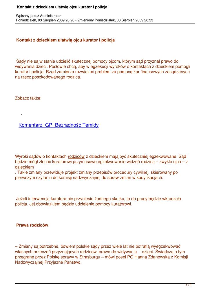 Kontakt z dzieckiem ułatwią ojcu kurator i policja Wpisany przez Administrator Poniedziałek, 03 Sierpień 2009 20:28 - Zmieniony Poniedziałek, 03 Sierpień 2009 20:33 Kontakt z dzieckiem ułatwią ojcu kurator i policja Sądy nie są w stanie udzielić skutecznej pomocy ojcom, którym sąd przyznał prawo do widywania dzieci. Posłowie chcą, aby w egzekucji wyroków o kontaktach z dzieckiem pomogli kurator i policja. Rząd zamierza rozwiązać problem za pomocą kar finansowych zasądzanych na rzecz poszkodowanego rodzica. Zobacz także: - Komentarz GP: Bezradność Temidy Wyroki sądów o kontaktach rodziców z dzieckiem mają być skuteczniej egzekwowane. Sąd będzie mógł zlecać kuratorowi przymusowe egzekwowanie widzeń rodzica – zwykle ojca – z dzieckiem . Takie zmiany przewiduje projekt zmiany przepisów procedury cywilnej, skierowany po pierwszym czytaniu do komisji nadzwyczajnej do spraw zmian w kodyfikacjach. Jeżeli interwencja kuratora nie przyniesie żadnego skutku, to do pracy będzie wkraczała policja. Jej obowiązkiem będzie udzielenie pomocy kuratorowi. Prawa rodziców – Zmiany są potrzebne, bowiem polskie sądy przez wiele lat nie potrafią wyegzekwować własnych orzeczeń przyznających rodzicowi prawo do widywania dzieci. Świadczą o tym przegrane przez Polskę sprawy w Strasburgu – mówi poseł PO Hanna Zdanowska z Komisji Nadzwyczajnej Przyjazne Państwo. 1/5 Kontakt z dzieckiem ułatwią ojcu kurator i policja Wpisany przez Administrator Poniedziałek, 03 Sierpień 2009 20:28 - Zmieniony Poniedziałek, 03 Sierpień 2009 20:33 Polska przegrała już dwie takie sprawy przed Europejskim Trybunałem Praw Człowieka. – W sprawach Zawadka przeciwko Polsce oraz Pawlik przeciwko Polsce organy państwa nie były w stanie przez wiele lat udzielić skutecznej pomocy ojcom, którym sąd przyznał prawo do widywania dzieci – mówi Elżbieta Czyż z Helsińskiej Fundacji Praw Człowieka. – Niedawno przepisy z zakresu prawa rodzinnego poprawiły się, ale i tak występują trudności z egzekwowaniem prawomocnych postanowień sądów – dodaje. Dobro dziecka Pomysł posłów krytykują jednak sędziowie i praktycy, którzy na co dzień stykają się z tym problemem. – Przymusowe odebranie dziecka jest przeżyciem traumatycznym dla dziecka – mówi Małgorzata Masiulanis, sędzia wizytator ds. rodzinnych i nieletnich w Sądzie Okręgowym w Warszawie. – Autorzy tego pomysłu nie biorą pod uwagę, że niekiedy samo dziecko po prostu nie chce spotkać się z ojcem. Czasem jest tak nastawione przez rodzica, z którym mieszka, ale czasem ma jakieś swoje negatywne doświadczenia i wspomnienia – dodaje. Jej zdaniem zastosowanie tak drastycznego środka, np. wobec sprzeciwu dziecka, będzie mogło być uznane za naruszanie praw dziecka. Zdaniem ekspertów nowe rozwiązania w ogóle nie biorą pod uwagę dobra dziecka. Mogą one też doprowadzić do zaognienia konfliktu pomiędzy rodzicami. 2/5 Kontakt z dzieckiem ułatwią ojcu kurator i policja Wpisany przez Administrator Poniedziałek, 03 Sierpień 2009 20:28 - Zmieniony Poniedziałek, 03 Sierpień 2009 20:33 – Zarządzenie przymusowego odebrania dziecka odbywałoby się bez wysłuchania drugiej strony. To jest absolutnie niedopuszczalne. Zastosowanie takiego środka jest nieadekwatne i nieproporcjonalne do celu, jaki ma zostać w ten sposób osiągnięty – uważa sędzia Robert Zegadło, sekretarz Komisji Kodyfikacyjnej Prawa Cywilnego. Kary finansowe Zmiany prawa w szerszym zakresie uwzględniające interes dziecka przygotowała działająca przy ministrze sprawiedliwości Komisja Kodyfikacyjna Prawa Cywilnego. Jesienią mają one trafić do Sejmu. – Nasz projekt przewiduje, że zasadniczym środkiem służącym do wyegzekwowania orzeczeń sądów o kontaktach rodzica z dzieckiem, będzie zapłata sumy pieniężnej za każde naruszenie postanowienia sądu – mówi sędzia Robert Zegadło. Zasądzone kwoty będą przyznawane na rzecz drugiej strony, a nie, jak dotychczas, na rzecz Skarbu Państwa. Mechanizm będzie działał jednak w obie strony i sankcjonowane będzie także każde naruszenie orzeczenia sądu przez uprawnionego do kontaktów z dzieckiem. Czyli jeśli uprawniony do kontaktów za późno odda dziecko, drugi z rodziców będzie mógł domagać się zasądzenia określonych kwot na swoją rzecz. – Wysokość zasądzanej w takiej sytuacji grzywny nie będzie ograniczona, jak obecnie, do wysokości 1 tys. zł. Sąd sam zdecyduje według swego uznania, jaka kwota będzie odpowiednia z uwzględnieniem sytuacji majątkowej tej osoby, wobec której ma być zastosowana tego typu sankcja – wskazuje sędzia Robert Zegadło. Dopiero gdy kary finansowe nie będą skutkowały, możliwe będzie skierowanie kuratora do odbioru dziecka. Sąd ponownie będzie mógł także rozważyć czas, miejsce i tryb spotkań rodzica z dzieckiem, tak aby dostosować warunki kontaktów do udziału kuratora. W skuteczność kar finansowych nie wierzy jednak część sędziów. 3/5 Kontakt z dzieckiem ułatwią ojcu kurator i policja Wpisany przez Administrator Poniedziałek, 03 Sierpień 2009 20:28 - Zmieniony Poniedziałek, 03 Sierpień 2009 20:33 – Niestety, w praktyce spotykamy się z tym, że są rodzice tak zawzięci, że płacą zasądzane kwoty i w dalszym ciągu nie wykonują postanowienia sądu – wskazuje sędzia Małgorzata Masiulanis. – Jest też ryzyko, że takie kary finansowe mogą stać się sposobem na poprawienie sytuacji materialnej drugiego rodzica. Lepiej byłoby, gdyby wpłacano je na konto dziecka jako swego rodzaju rekompensatę za stresujące i traumatyczne dzieciństwo – dodaje. Nowy projekt przewiduje także możliwość dochodzenia zwrotu kosztów i wydatków związanych z niezrealizowanymi kontaktami. Chodzi na przykład o zwrot kosztów dojazdu uprawnionego rodzica do miejsca wyznaczonego kontaktu z dzieckiem lub poniesione wydatki na planowany wyjazd wakacyjny z dziecki