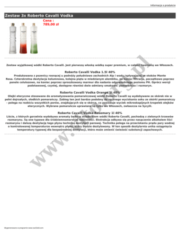Informacje o produkcie Zestaw 3x Roberto Cavalli Vodka Cena : 789,00 zł Roberto Cavalli Vodka 1.5l 40% pl Zestaw wyjątkowej wódki Roberto Cavalli. Jest pierwszą włoską wódką super premium, w całości tworzoną we Włoszech. or g. Produkowana z pszenicy rosnącej u podnóży południowo zachodnich Alp i wody, spływającej ze stoków Monte Rosa. Czterokrotna destylacja kolumnowa, kolejna piąta w miedzianym alembiku, na koniec filtracja, początkowo poprzez panele celulozowe, na koniec poprzez sproszkowany marmur dla nadania odpowiedniego poziomu PH. Oprócz wersji podstawowej, czystej, dostępne również dwie odmiany smakowe: pomarańcza i rozmaryn. Roberto Cavalli Vodka Orange 1l 40% o. Olejki eteryczne stosowane do aromatyzowania pomarańczowej wódki Roberto Cavalli są wydobywane ze skórek nie w pełni dojrzałych, słodkich pomarańczy. Zabieg ten jest bardzo podobny do ręcznego wyciskania soku ze skórki pomarańczy – polega na rozbiciu wszystkich porów, znajdujących się w skórce, co powoduje wyciek mikroskopijnych kropelek olejków eterycznych. Wybrane pomarańcze uprawiane są tylko we Włoszech, zwłaszcza na Sycylii. Roberto Cavalli Vodka Rosemary 1l 40% w w w .v it Liście, z których gorzelnia wydobywa aromaty będące składnikiem wódki Roberto Cavalli, pochodzą z zielonych krzewów rozmarynu. Są one typowe dla śródziemnomorskiej roślinności. Ekstrakcja odbywa się przez nasączenie alkoholem liści rozmarynu i dalszą destylację tego płynu techniką destylacji parowej. Technika polega na przeciskaniu prądu pary wodnej o kontrolowanej temperaturze wewnątrz płynu, który będzie destylowany. W ten sposób destylarnia unika osiągnięcia temperatury typowej dla bezpośredniej destylacji, która może zmienić świeżość substancji zapachowych. Wygenerowano w programie www.oscGold.com
